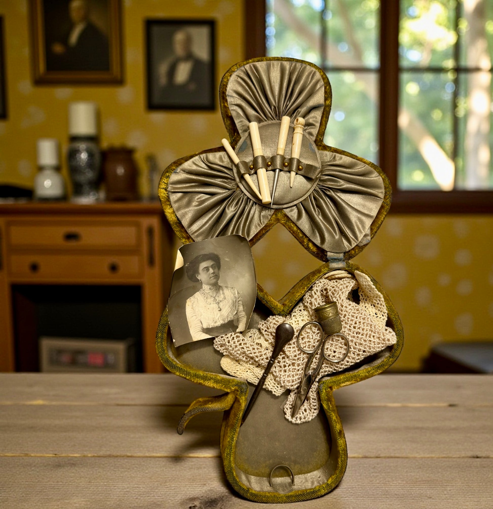 Cofanetto da cucito in vellutino a guisa di trifoglio, interno in seta con strumenti, guanti, fotografia antica. 1900.