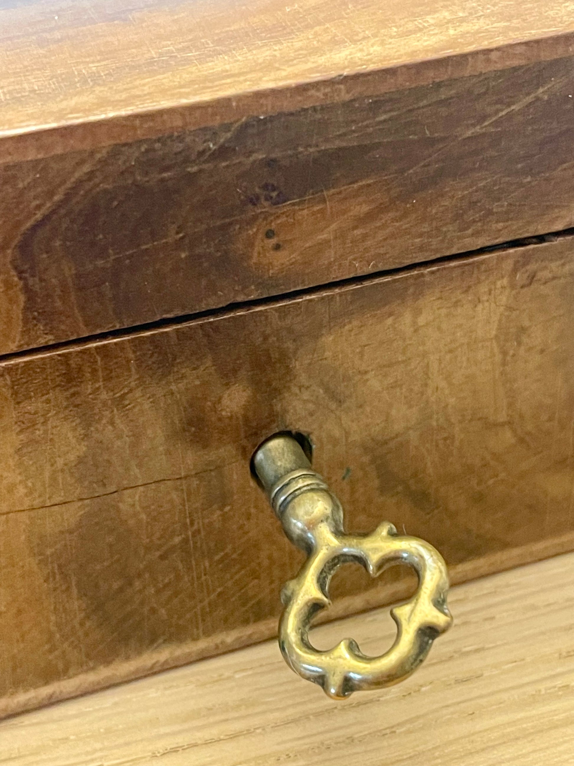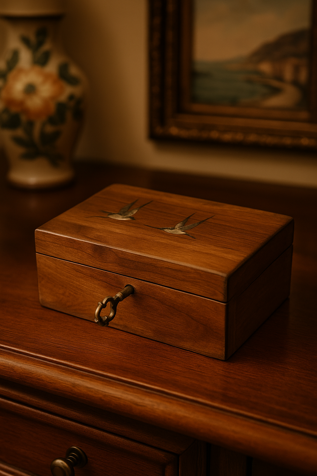 A volte, anche una piccola scatola sa custodire un intero cielo… quello di Sorrento! Delizioso cofanetto in legno, decorato con due rondini che paiono sospese in volo, come a ricordare l’eterno ritorno della primavera e delle speranze. Le rondini, nella tradizione sorrentina, simboleggiano l’amore fedele e la casa che si ritrova sempre: tornano dove sono nate, come noi quando seguiamo il richiamo di ciò che ci appartiene davvero. Realizzata artigianalmente tra gli anni ’50 e ’70, questa piccola scatola racconta un’epoca in cui Sorrento non era solo meta di turisti, ma cuore pulsante di botteghe specializzate in intarsi e lavorazione del legno. Ogni oggetto era un frammento di poesia mediterranea, inciso a mano per viaggiare lontano, come un souvenir carico di emozione. L’interno, rivestito in feltro rosso, accoglieva forse gioielli, lettere o ricordi di un viaggio. La chiave originale apre ancora la serratura, come a voler custodire un segreto gentile… e mentre la luce accarezza il legno levigato dal tempo, sembra di sentire l’eco di un mandolino e il profumo di zagara che sale dal mare. Dimensioni: 14 x 9,5 altezza 5 cm. Serratura con chiave perfettamente funzionante.