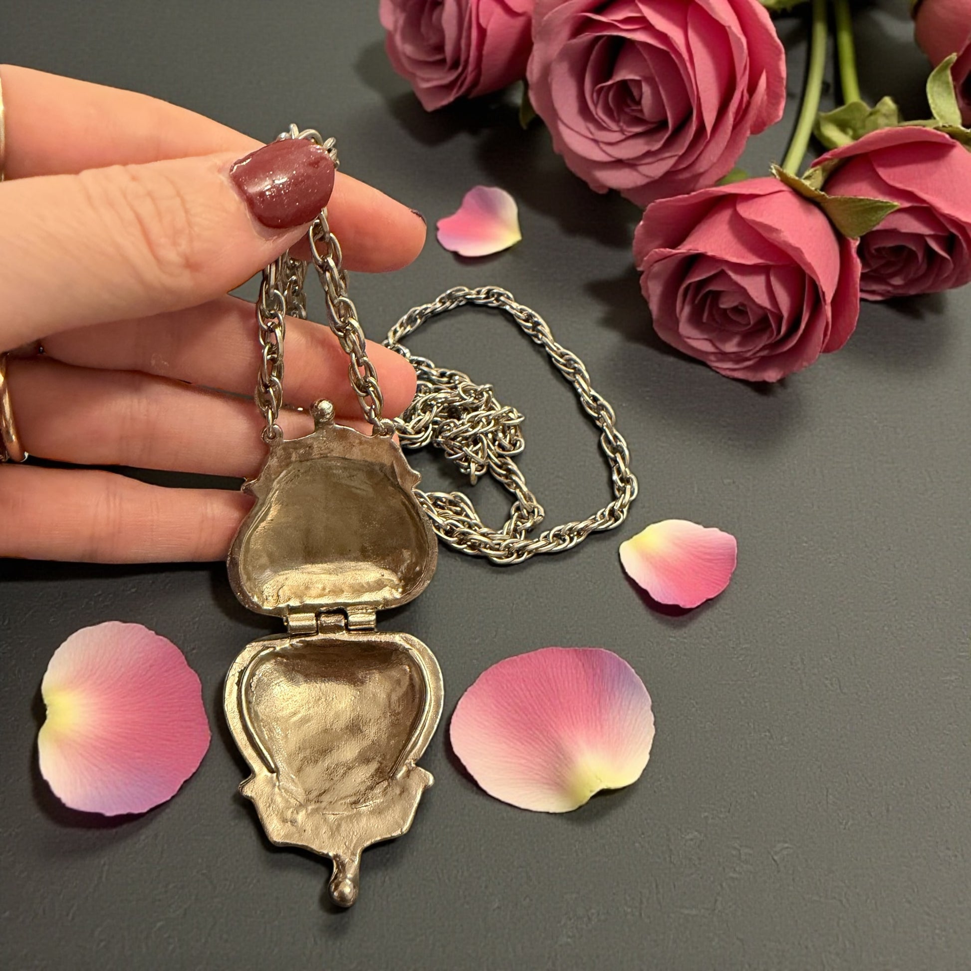 Collana con catena lunga senza chiusura tot giro 80 cm, pendente apribile a scrigno ispirato alle aumônière da chatelaine; lega metallica argentata; epoca: anni ’70; meccanismo funzionante; buono stato di conservazione; dimensioni contenute ma adatte a fotografia o piccolo oggetto personale.