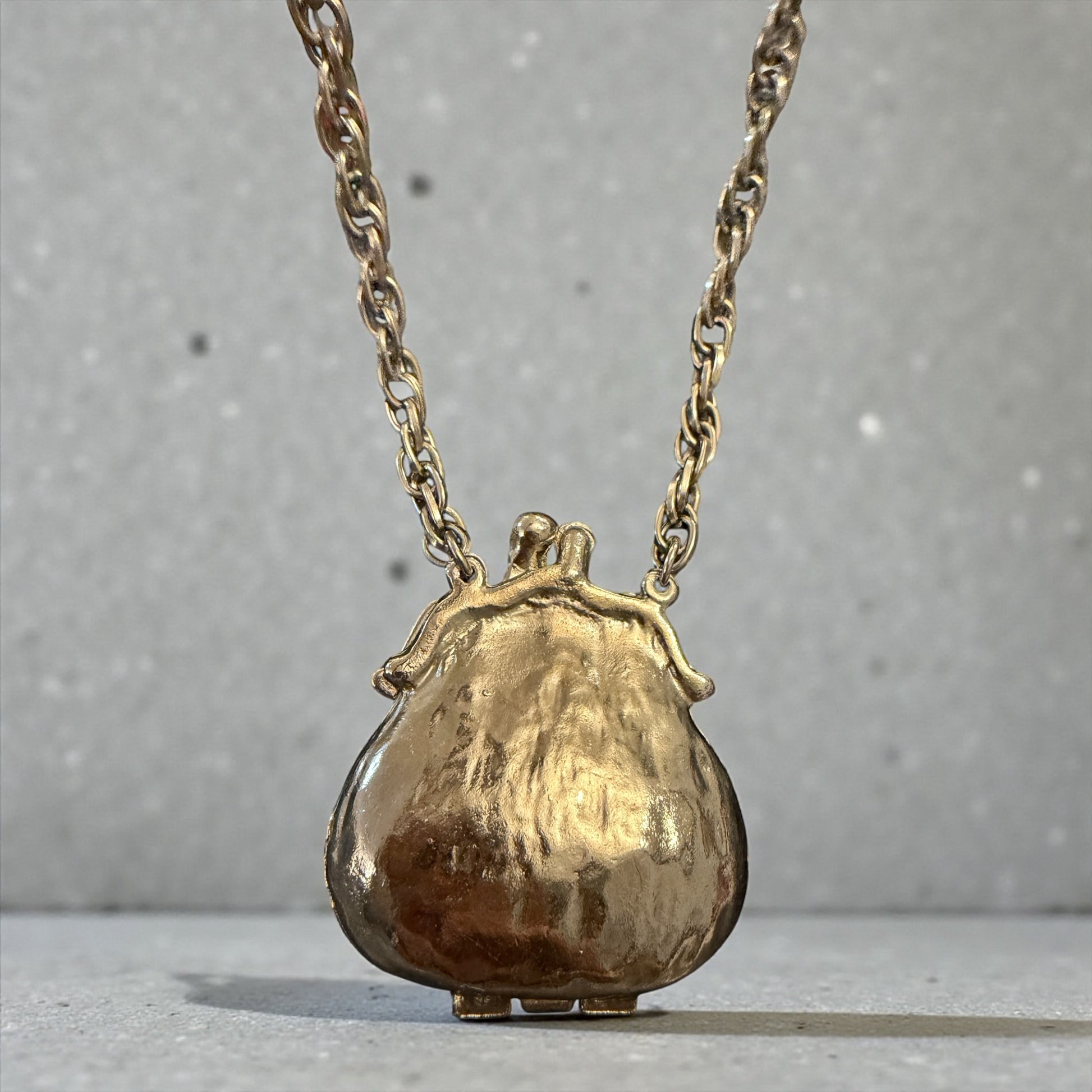 Una collana che sembra arrivare da un altro secolo… ma decide di nascere negli anni Settanta. Questo pendente riprende la forma delle antiche aumônière da chatelaine — quei piccoli borsellini sospesi alla vita — e la trasforma in uno scrigno da indossare, lungo, libero, senza chiusure, da infilare semplicemente dalla testa. La superficie irregolare, volutamente materica, racconta il gusto anni ’70 per il recupero del passato e per gli oggetti carichi di significato. Aprendolo, si scopre un interno pensato per custodire qualcosa di personale: una fotografia, un biglietto, un minuscolo ricordo. Non è un gioiello da esibire, ma da confidare. Un oggetto che non chiede di essere guardato, ma scelto. Che cosa ci metteresti dentro?