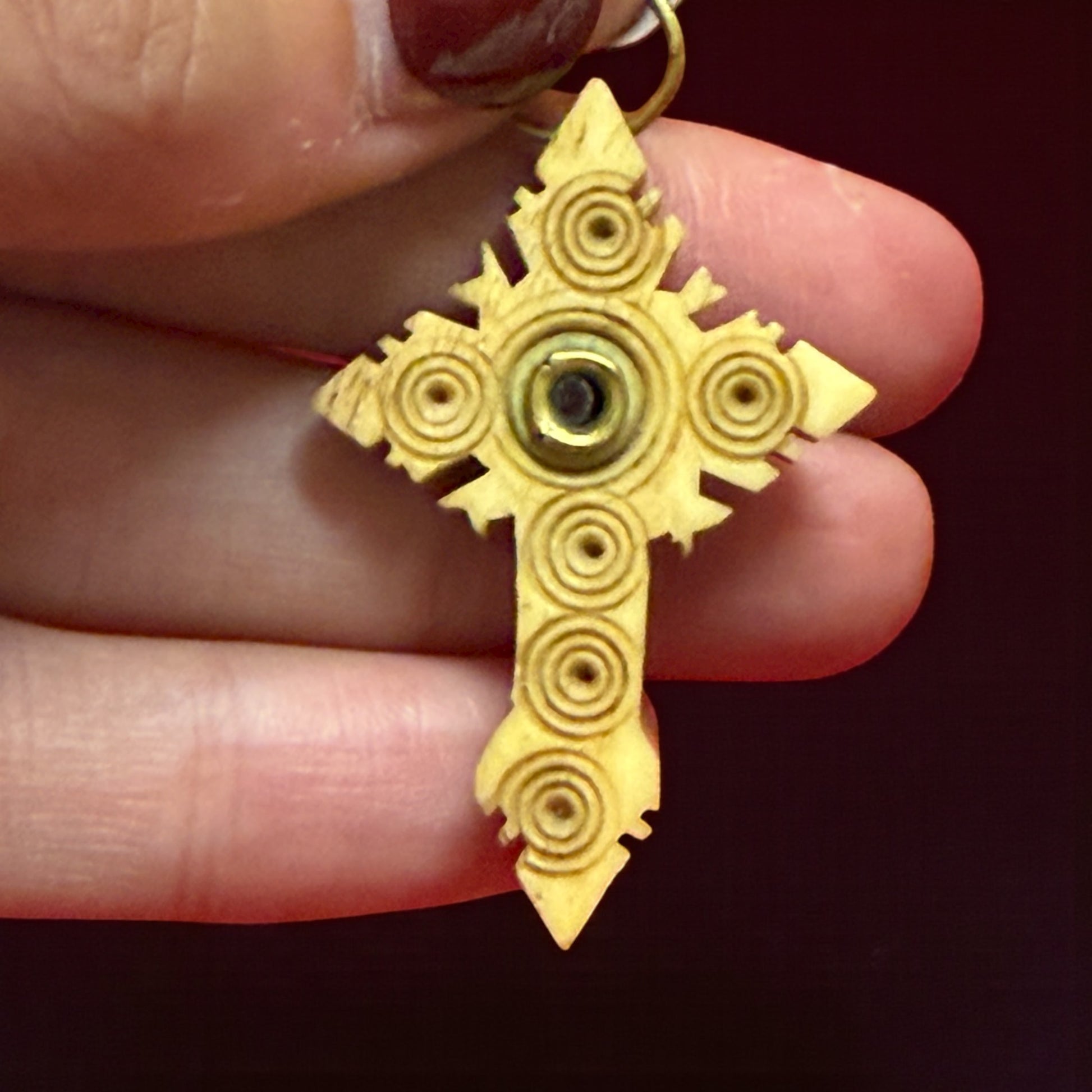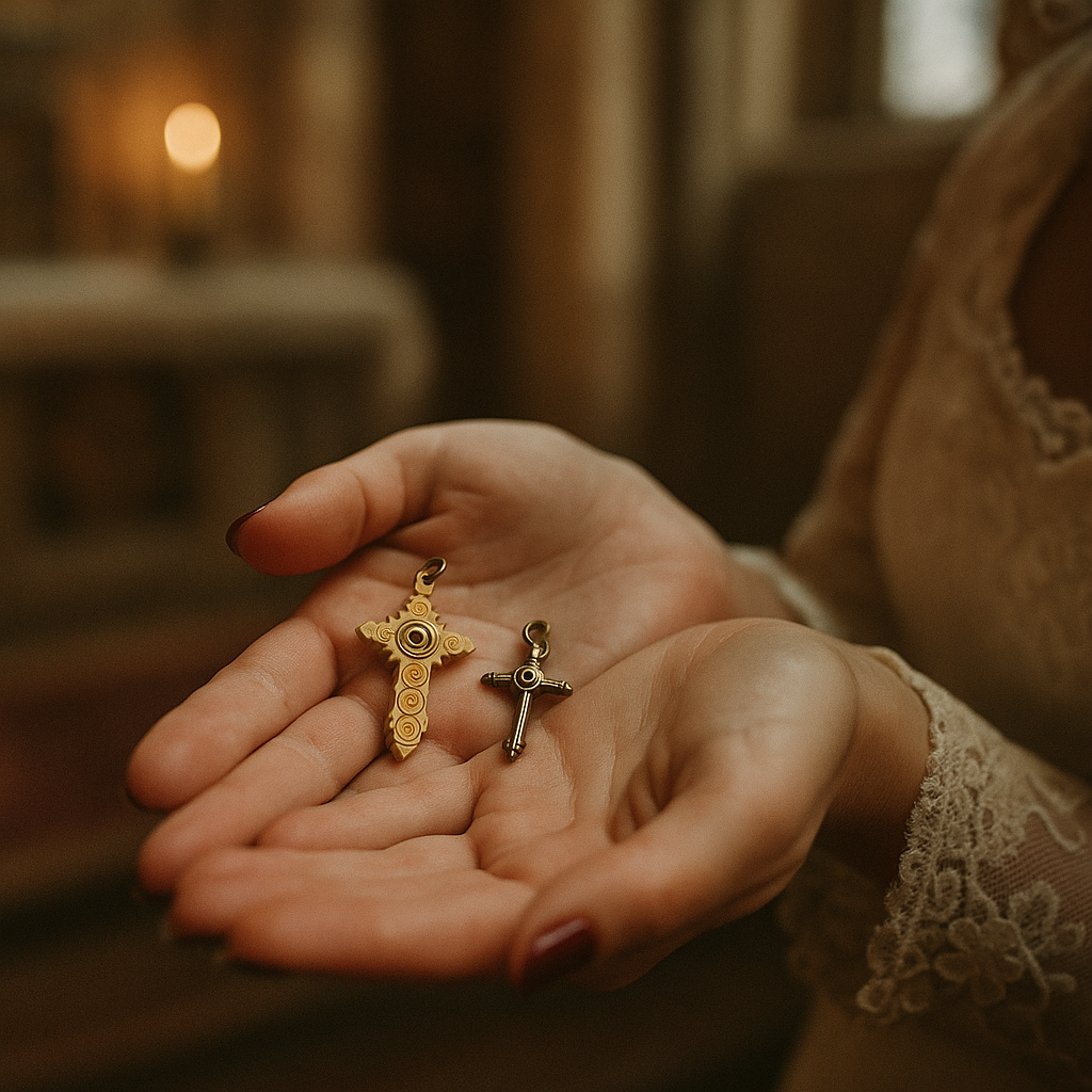 Due piccole croci, nate in un tempo in cui la fede si portava al collo come una finestra sull’invisibile e conservate per anni dalla stessa donna. Dentro di esse batte il cuore della meraviglia ottocentesca: una lente Stanhope, minuscolo cilindro di vetro inventato per racchiudere immagini tanto piccole da sfuggire all’occhio nudo. In quella di legno inciso, perfettamente conservata, il miracolo è ancora vivo: guardando attraverso la lente si svelano piccole immagini sacre, nitide e luminose — la Madonna, Gesù, gli angeli — e sotto, una frase in francese che recita: