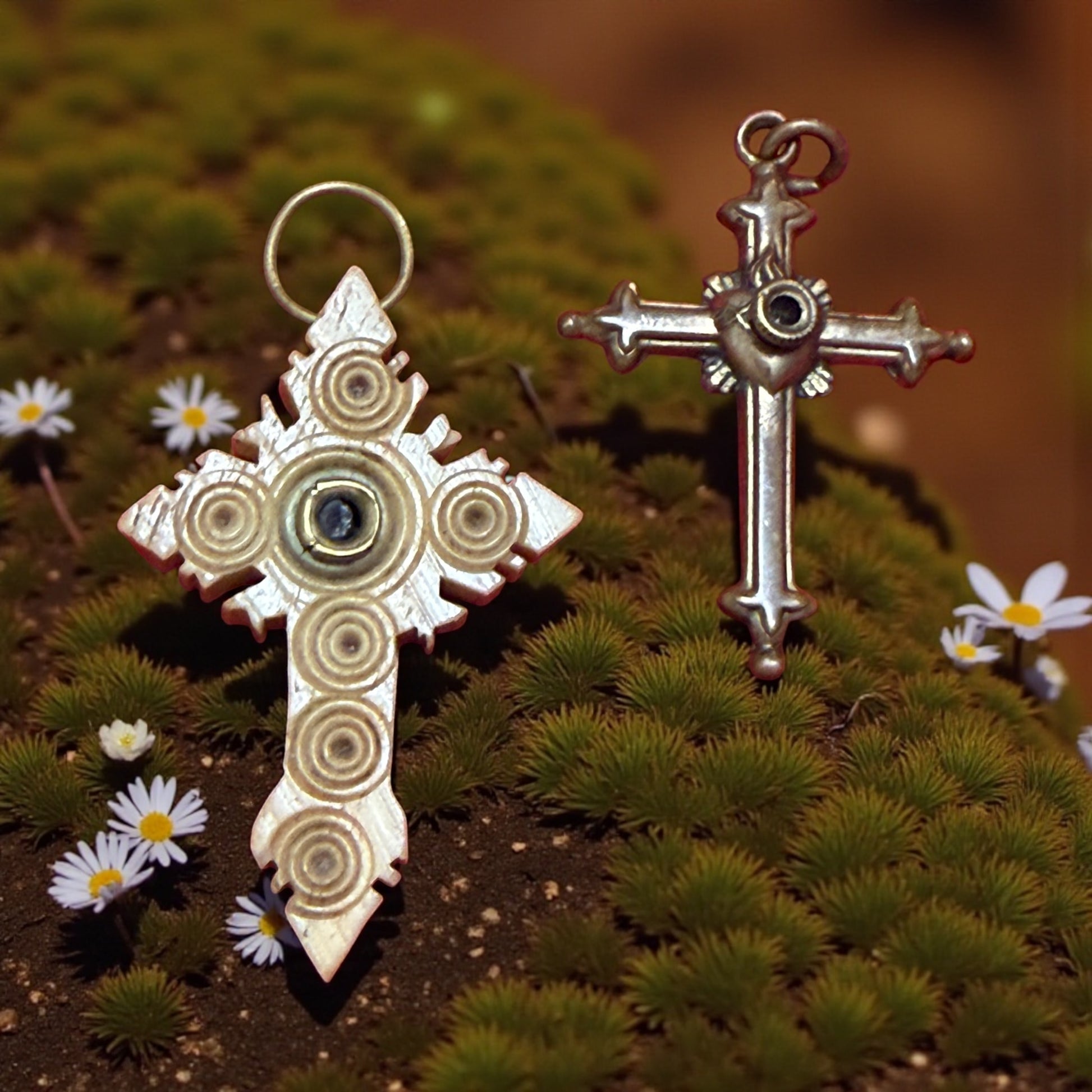 L’altra croce, in metallo dorato, custodisce invece il silenzio di un’immagine perduta: un cuore raggiato al centro, simbolo del Sacro Cuore, veglia su ciò che resta di un messaggio che il tempo ha deciso di trattenere per sé. Sono reliquie di devozione e ingegno, souvenir di pellegrinaggi ottocenteschi in cui scienza e fede si intrecciavano. Due croci, due modi di guardare oltre: una che mostra, una che ricorda. N.b. Non si separa la coppia che ha vissuto insieme per più di un secolo.
