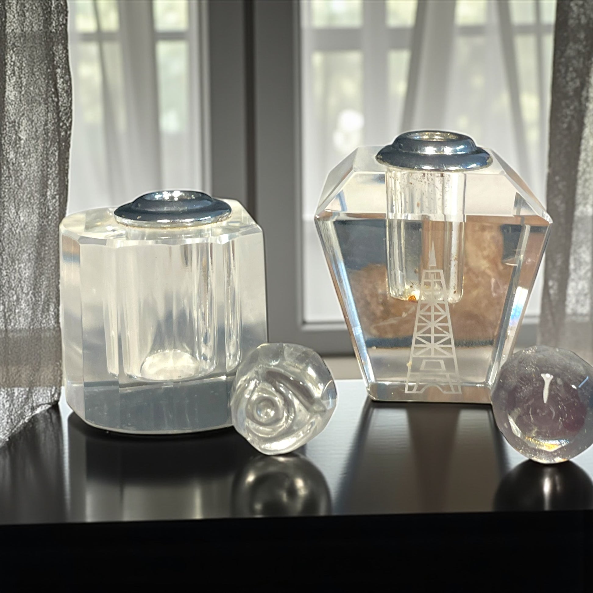 Coppia di flaconcini da profumo vintage. Epoca: anni ’50. Materiale: vetro pressato e molato, con incisioni e tappi in vetro modellato (uno sfaccettato, uno a rosa). Stato: entrambi integri, con normali segni del tempo.