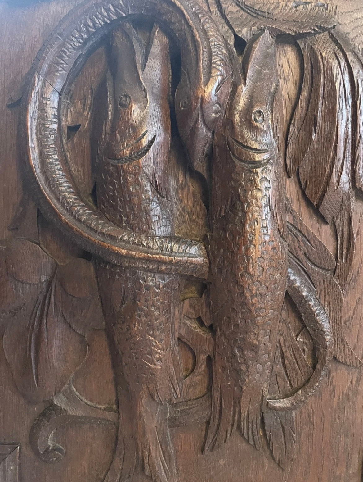 Coppia pannelli lignei intagliati a rilievo. Tema: natura morta di caccia e pesca (anguille/pesci + volatili). Dimensioni: 55 × 45 cm ciascuno. Legno massello, patina scura. Probabile fine Ottocento / inizi Novecento. Provenienza: Italia del Nord.