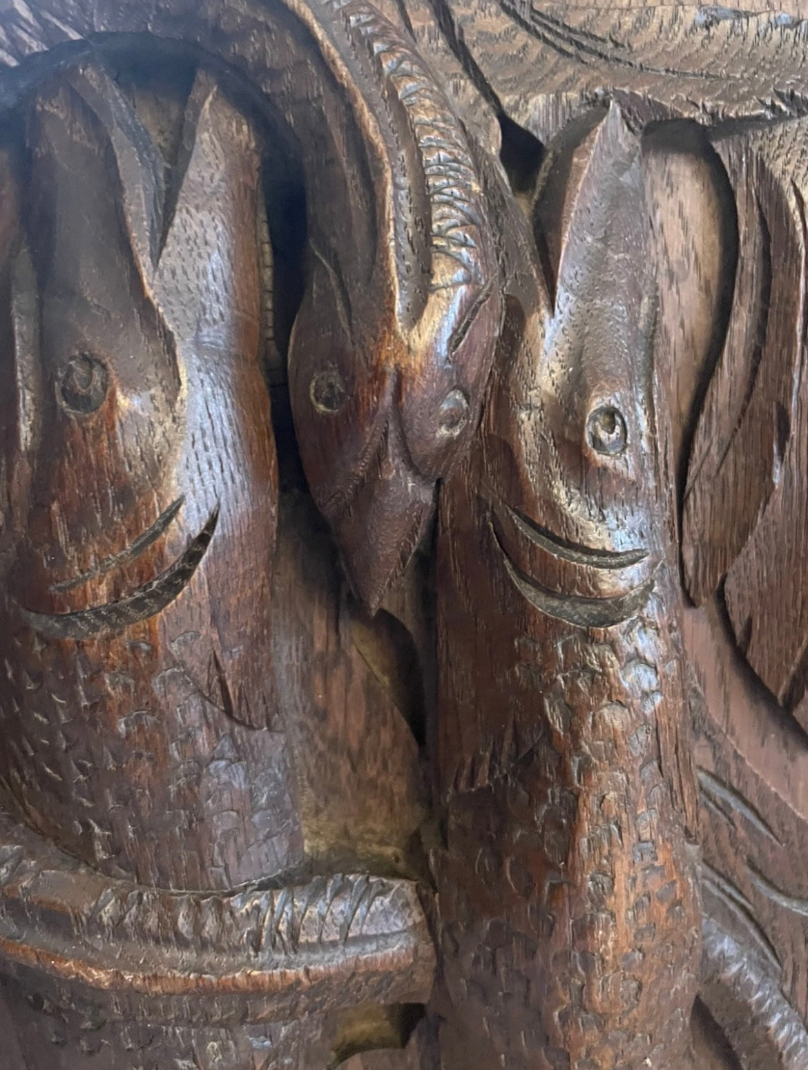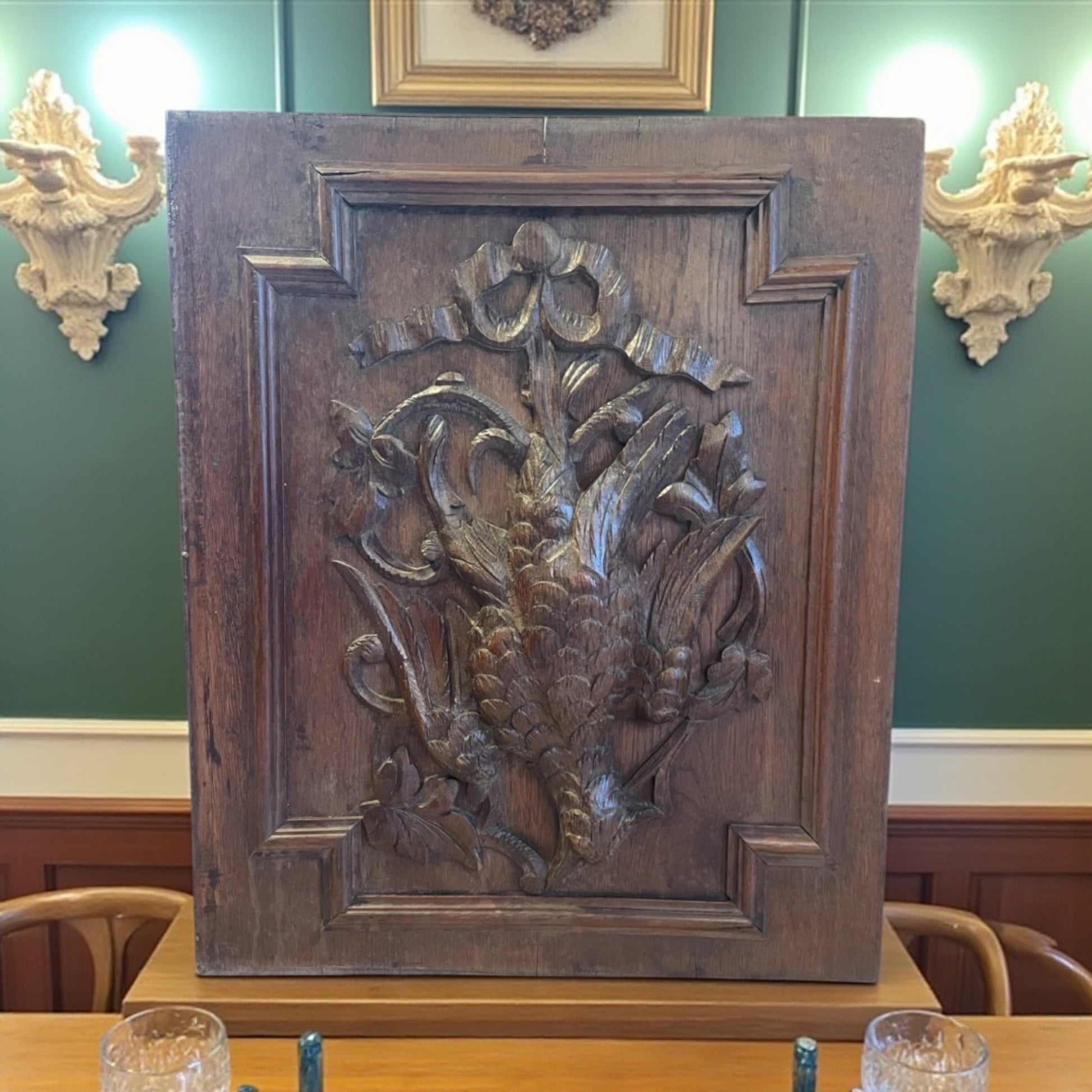 ✨ Un frammento di natura scolpita nel legno. Due grandi pannelli (55×45 cm ciascuno) si presentano come testimonianza di un’arte che unisce il lavoro paziente dell’intaglio alla forza simbolica delle immagini. Su uno, le curve sinuose di anguille e pesci avvolti tra le foglie richiamano il mondo acquatico e la ricchezza del mare. Sull’altro, un volatile dalle piume minuziosamente scolpite emerge evoca la caccia e l’abbondanza della terra. Insieme, formano una coppia armoniosa: mare e terra, acqua e aria, abbondanza e nutrimento, resa eterna dal calore del legno massello. Un tempo parte di un arredo signorile e di una boiserie raffinata nella Locanda di un castello, oggi questi pannelli diventano protagonisti di una parete; portando con sé una storia di convivialità e di arte antica.