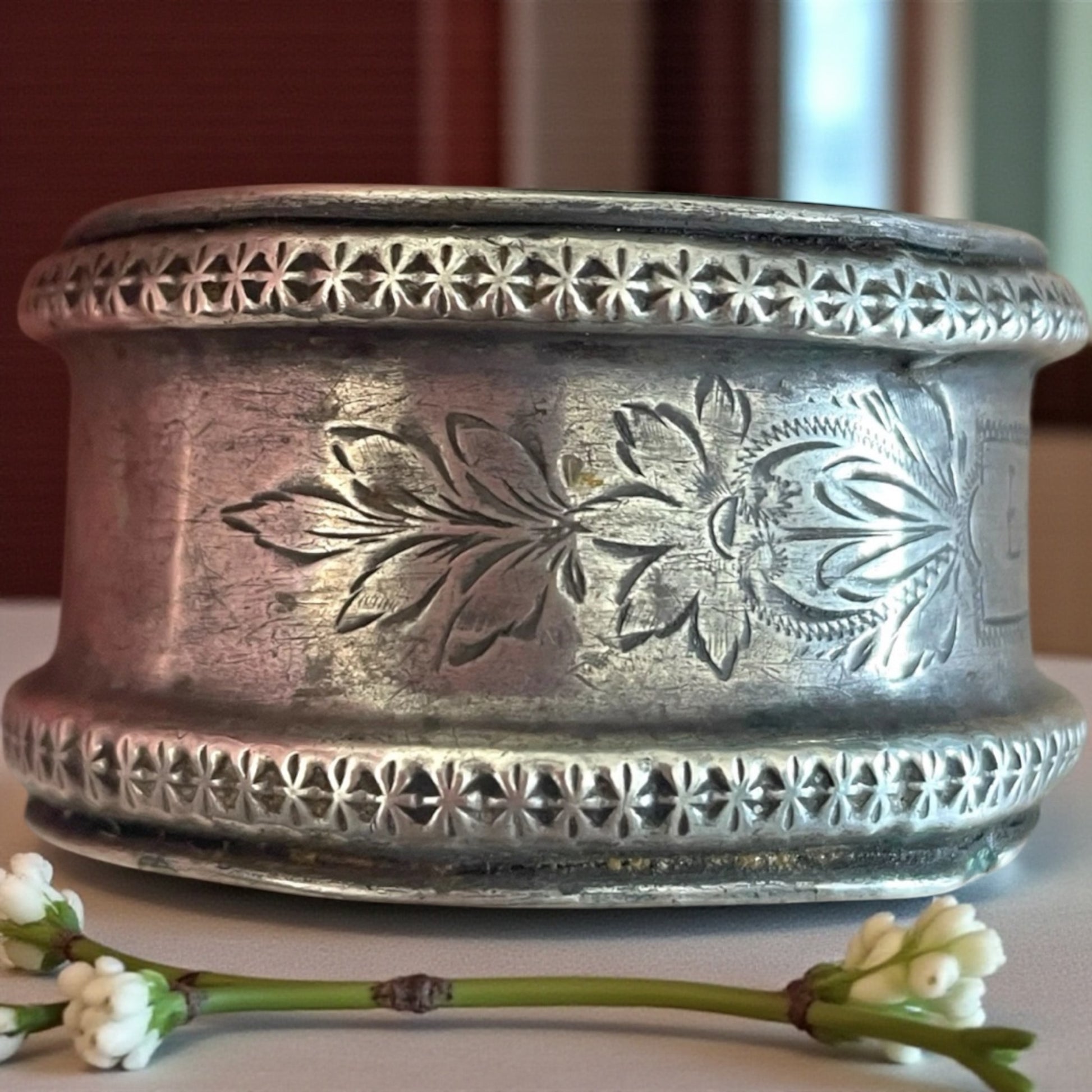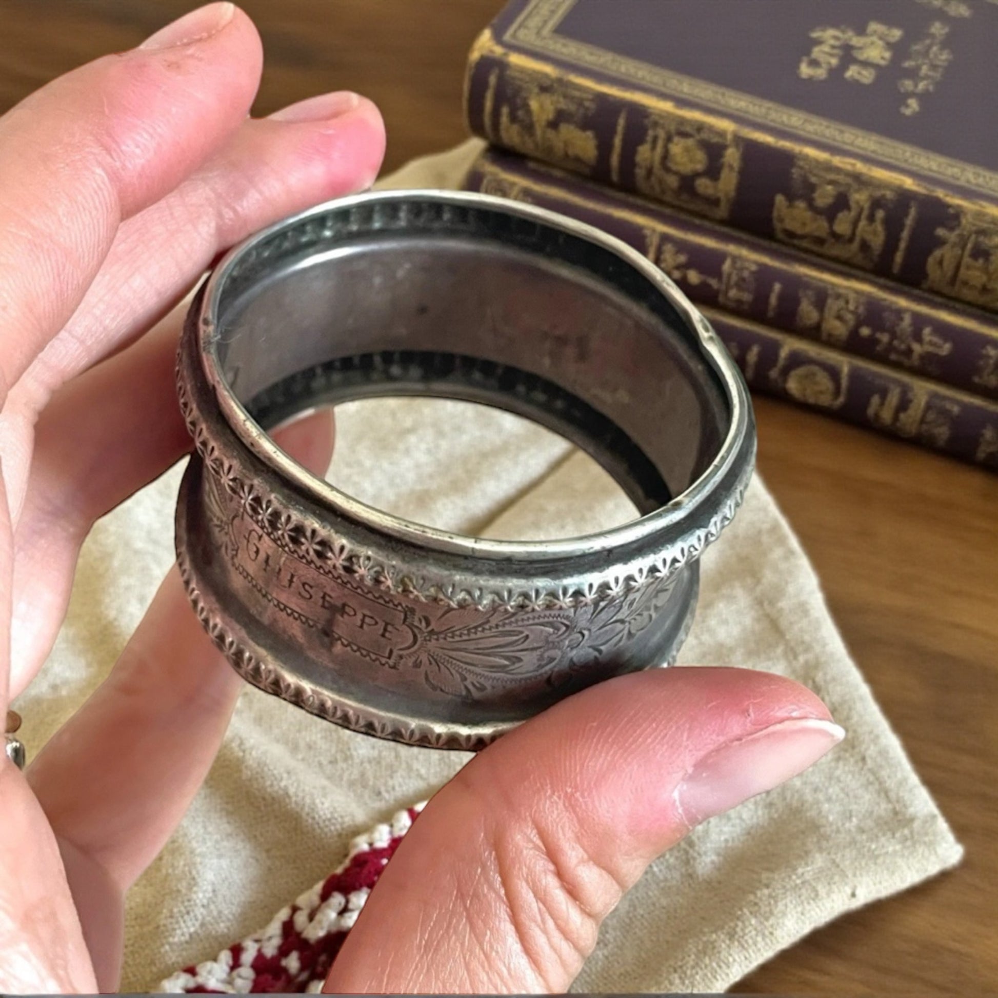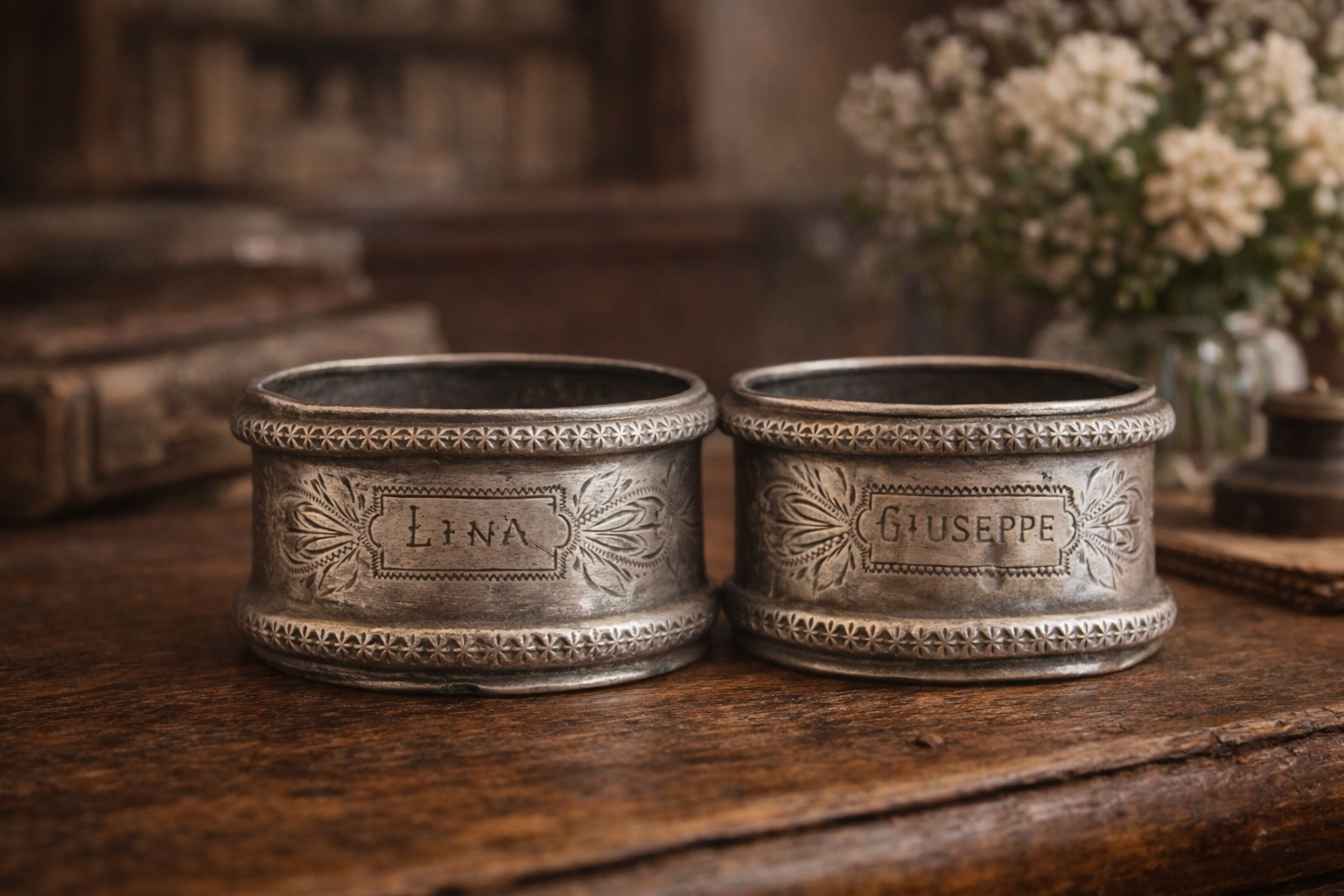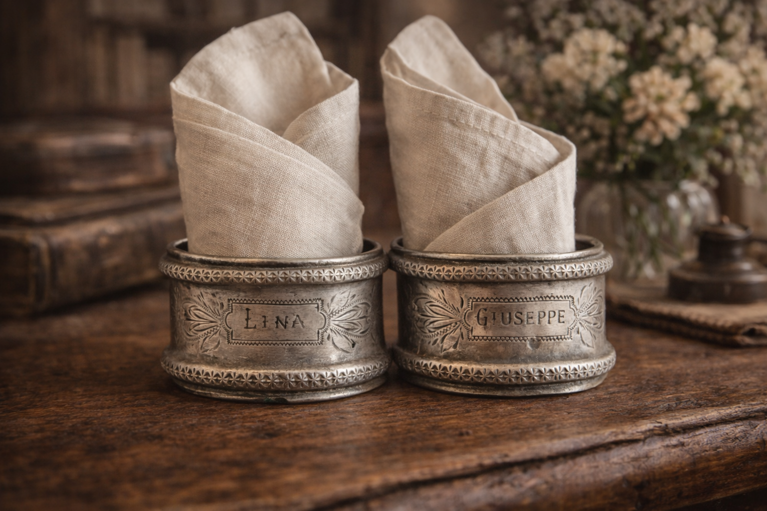 Una tavola apparecchiata per due. Non per fare scena, ma per durare nel tempo. Questi antichi porta tovaglioli in argento 800 portano incisi due nomi: Lina e Giuseppe. Non decorazioni, ma appartenenze. Ognuno il suo posto, il suo tovagliolo, la sua presenza riconosciuta. L’argento, lavorato a mano, conserva una patina autentica e irregolare. Osservandoli di profilo, i bordi non sono perfettamente rotondi: un segno lieve sincero, che racconta la mano dell’uomo e il passare degli anni. Oggetti nati per l’uso quotidiano, non per la vetrina. E proprio per questo oggi parlano ancora. Perfetti come porta tovaglioli, porta salvietta o piccoli contenitori da tavola, sono frammenti silenziosi di una vita condivisa. Potevano essere i nostri bisnonni… chissà a quali cene e discorsi ed amori hanno assistito.