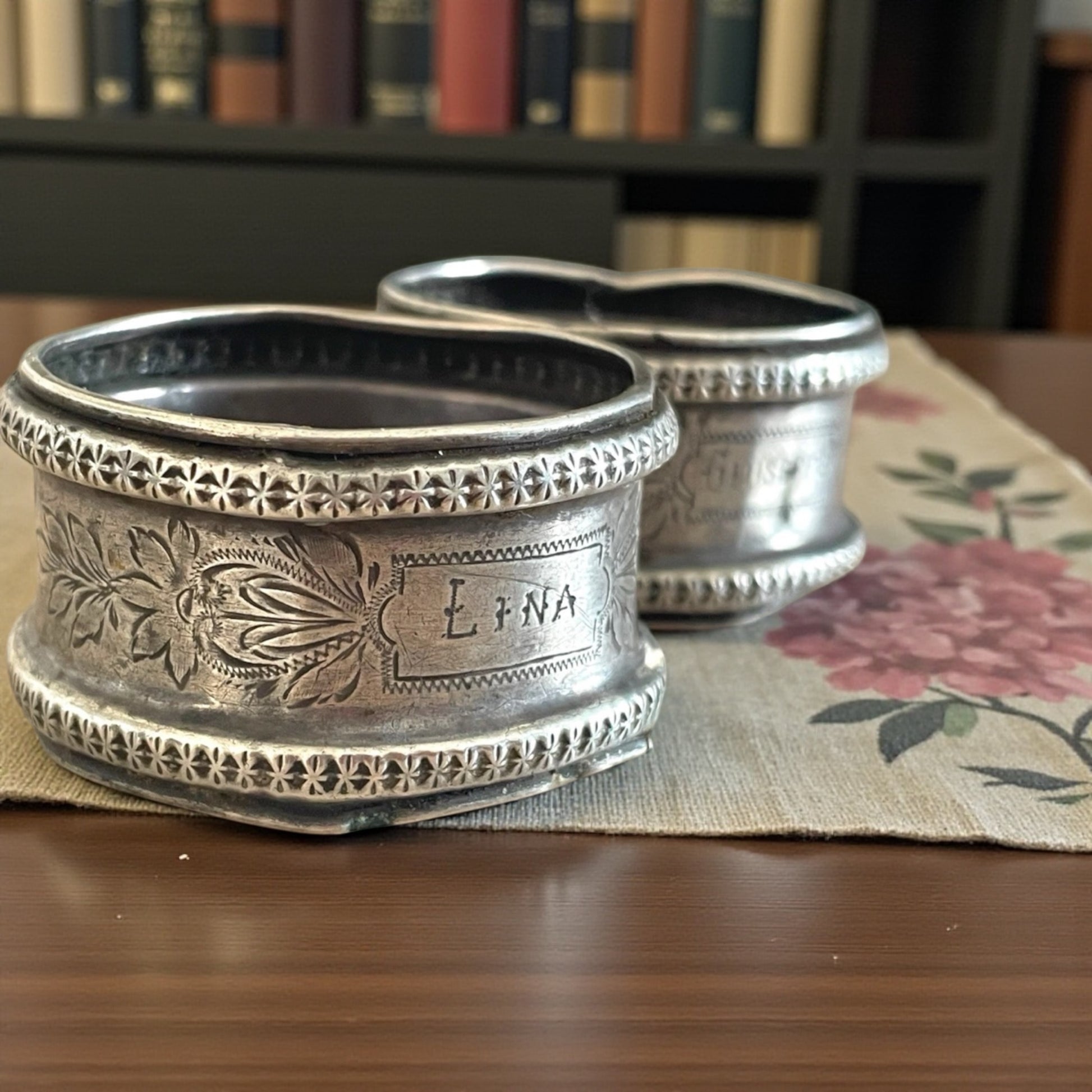 Coppia di porta tovaglioli / porta salvietta. Materiale: argento 800. Epoca: fine XIX – primissimo XX secolo (ca. 1890–1915). Incisioni: nomi “Lina” e “Giuseppe”. Punzonatura: presente. Lavorazione: manuale, a lastra. Stato: buono, con normali segni del tempo. Nota: irregolarità nella rotondità dei bordi, visibili dal profilo.
