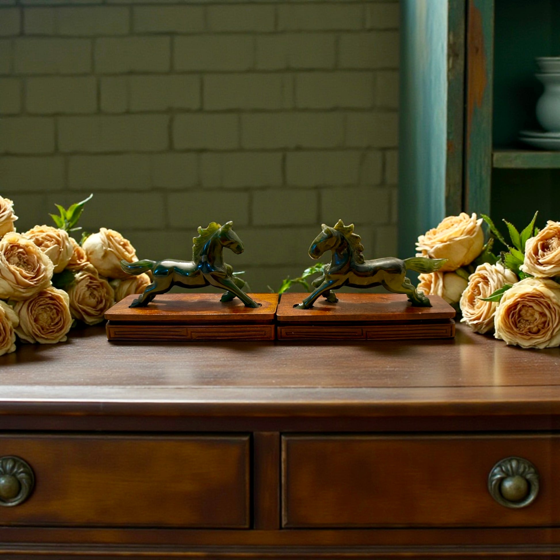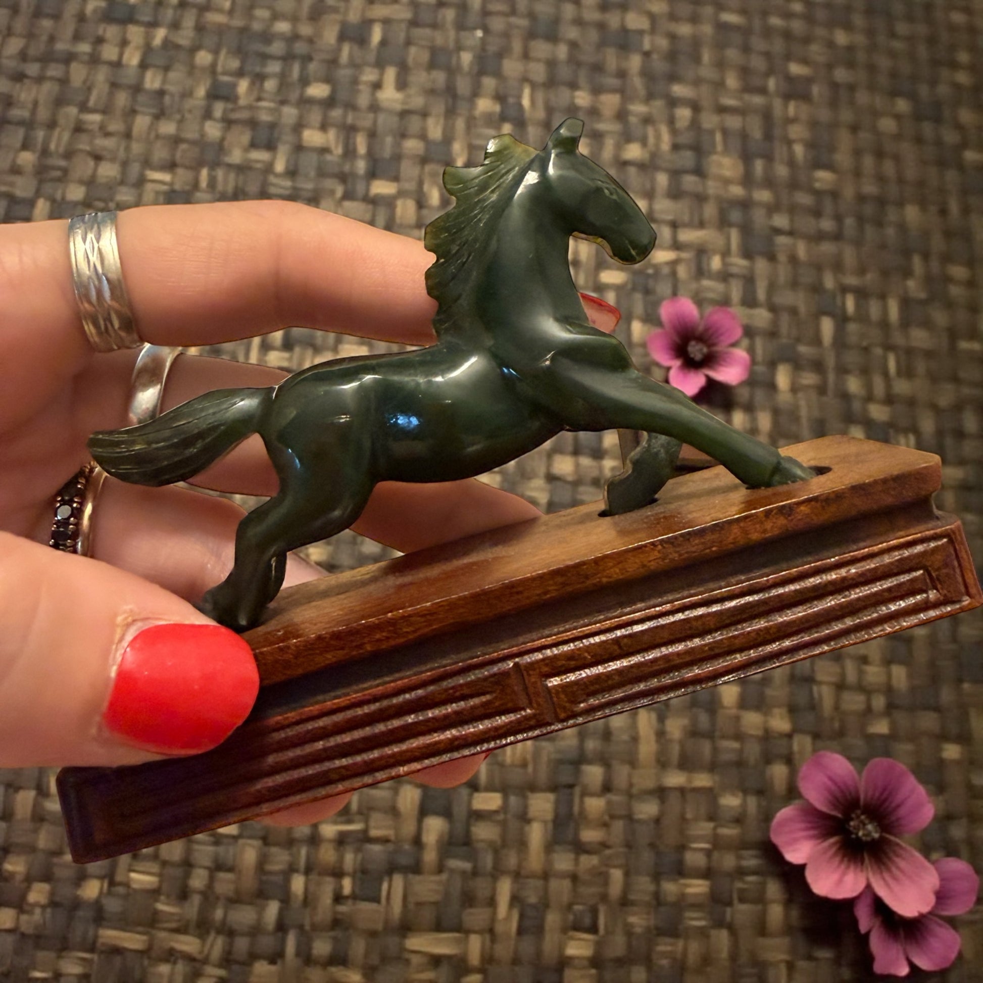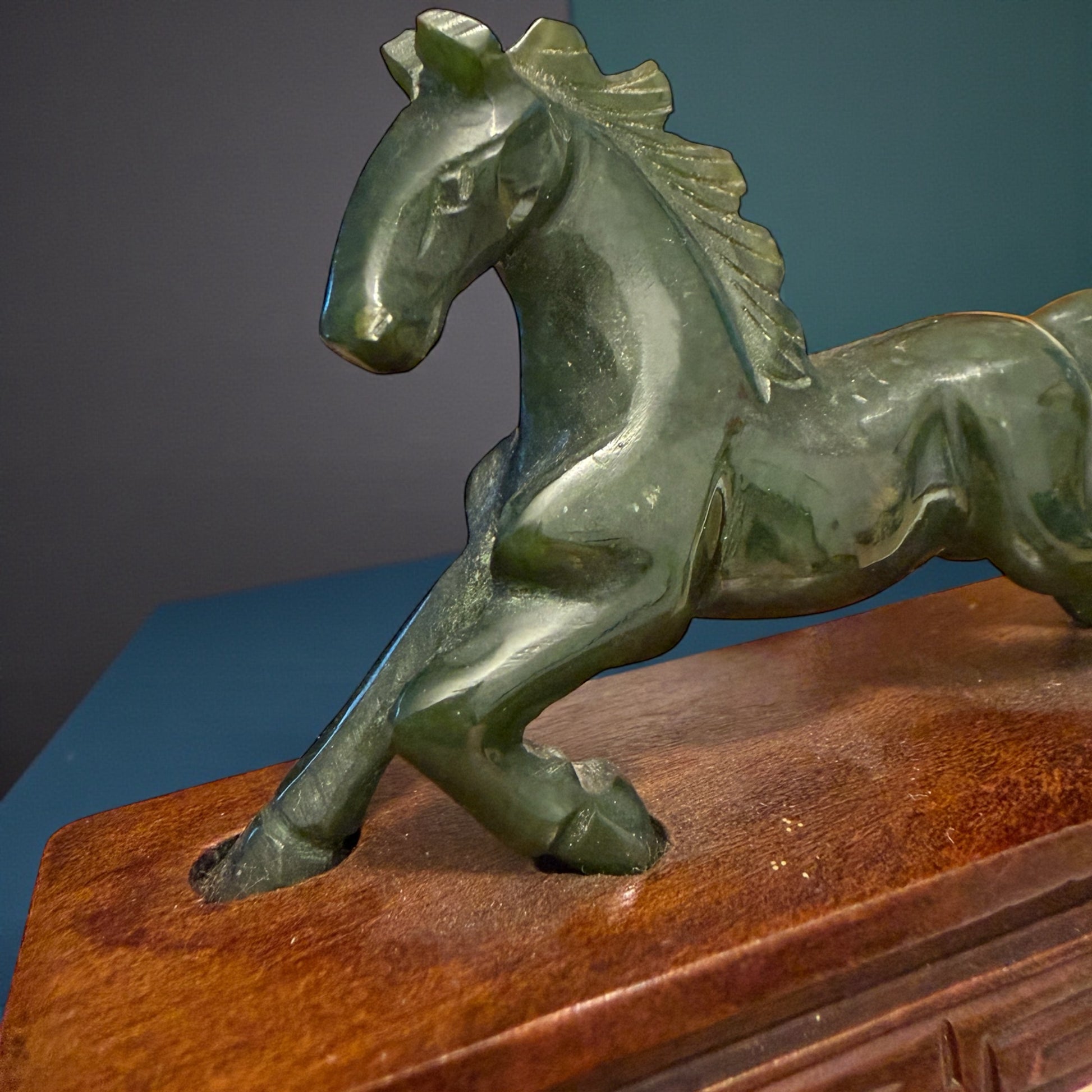 Coppia di cavalli decorativi. Materiale: giada verde / pietra dura verde. Base: legno. Dimensioni base: 10,3 × 3,5 cm. Altezza: circa 7,5 cm. Epoca: metà Novecento. Condizioni: ottime.
