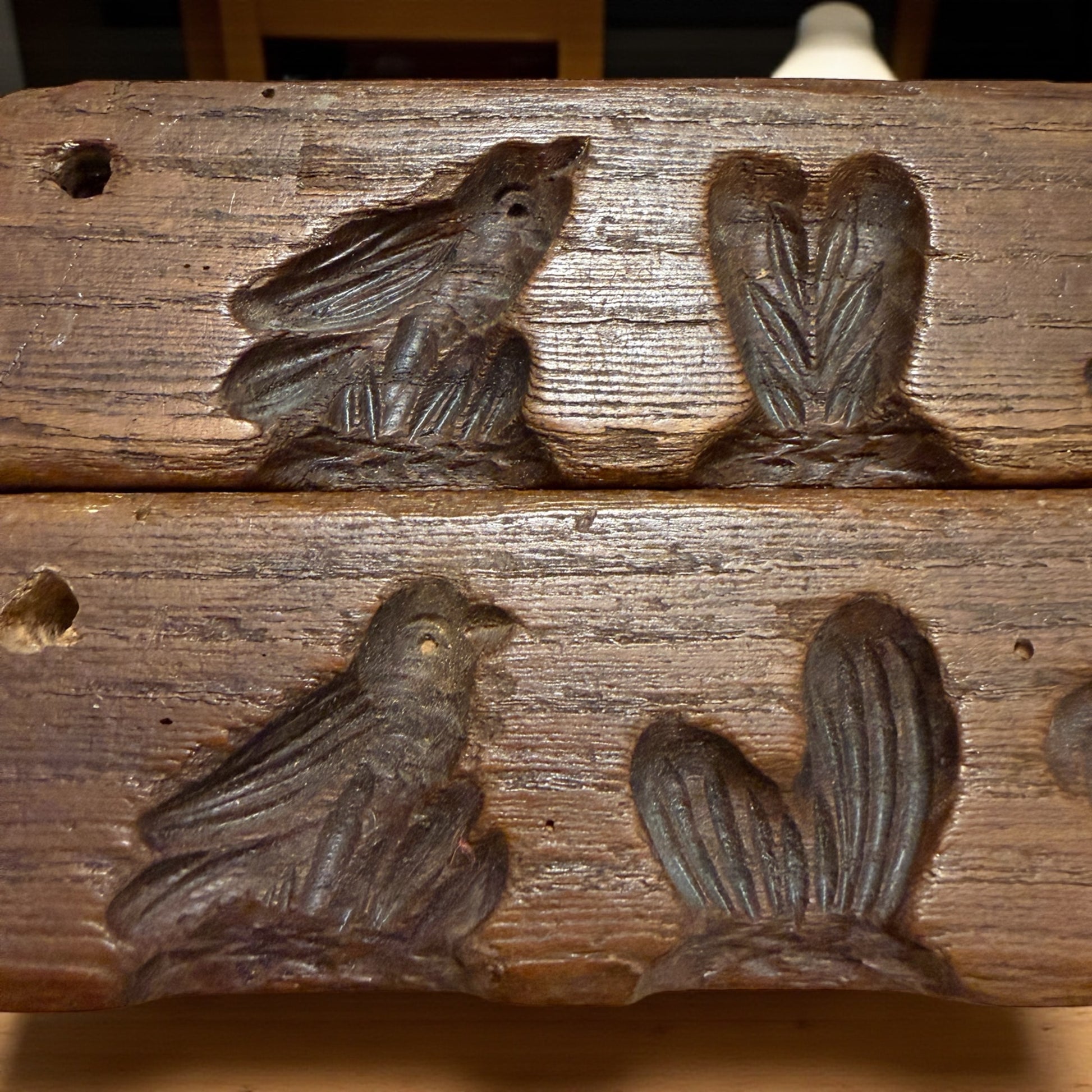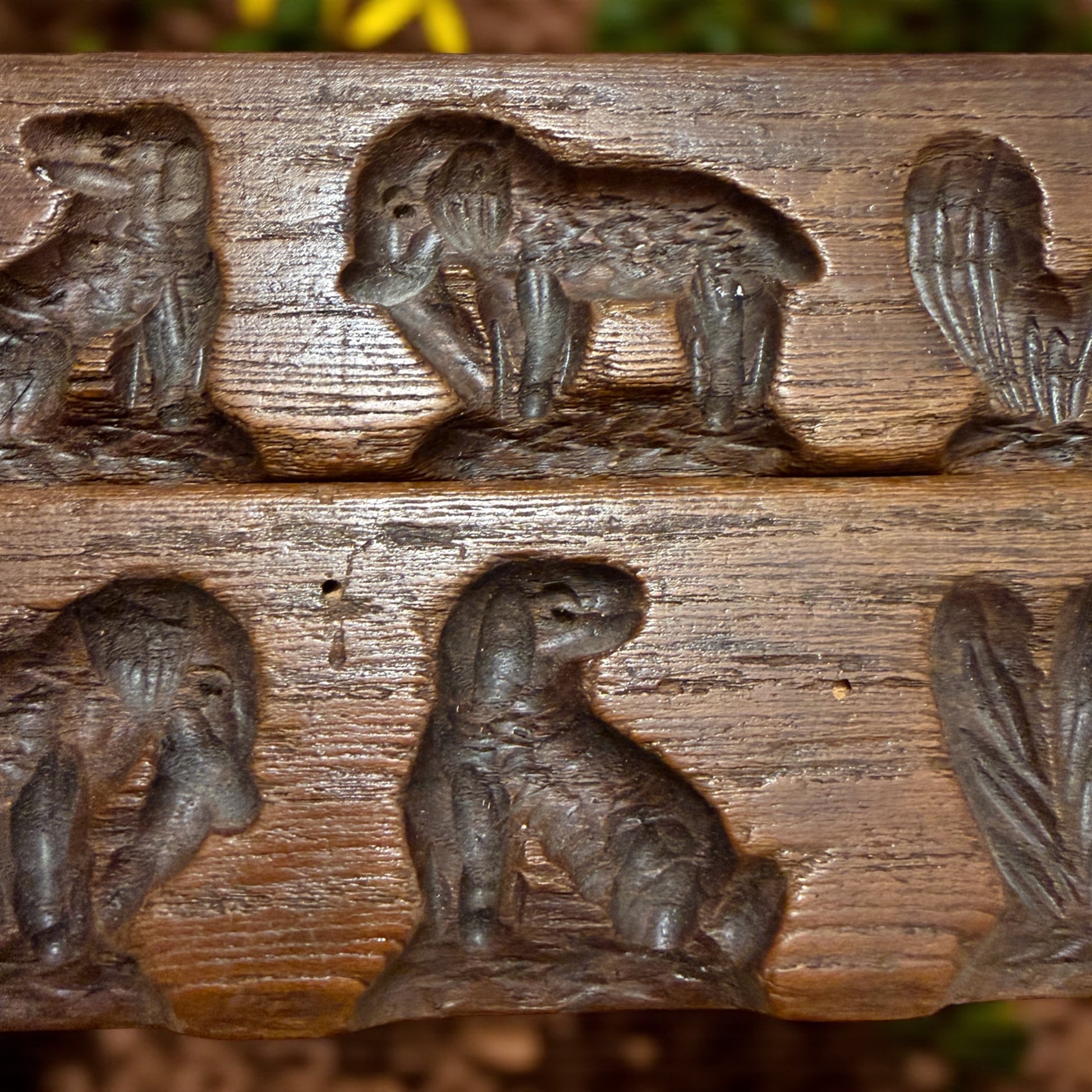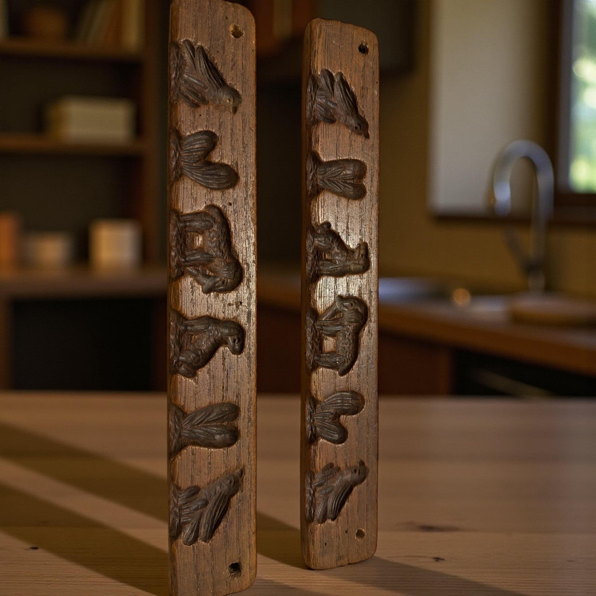 Un tempo, in una cucina olandese di fine Ottocento, queste due placche di legno custodivano un piccolo rituale di profumo e calore. La pasta dolce, spessa e speziata, veniva pressata negli stampi per prendere forma: uccelli, cani, forse un agnello, e tra loro un fiore d’inverno. Poi il forno si apriva e l’aria si riempiva del profumo di speculaas — il biscotto di San Nicola, dorato e croccante, simbolo di festa e fortuna. Oggi il legno si è scurito, le venature raccontano le stagioni trascorse, ma nel silenzio sembra ancora di sentire l’aroma della cannella. Due tavolette che non sono solo utensili: sono frammenti di un’infanzia europea, intagliati con amore e tramandati come amuleti domestici.