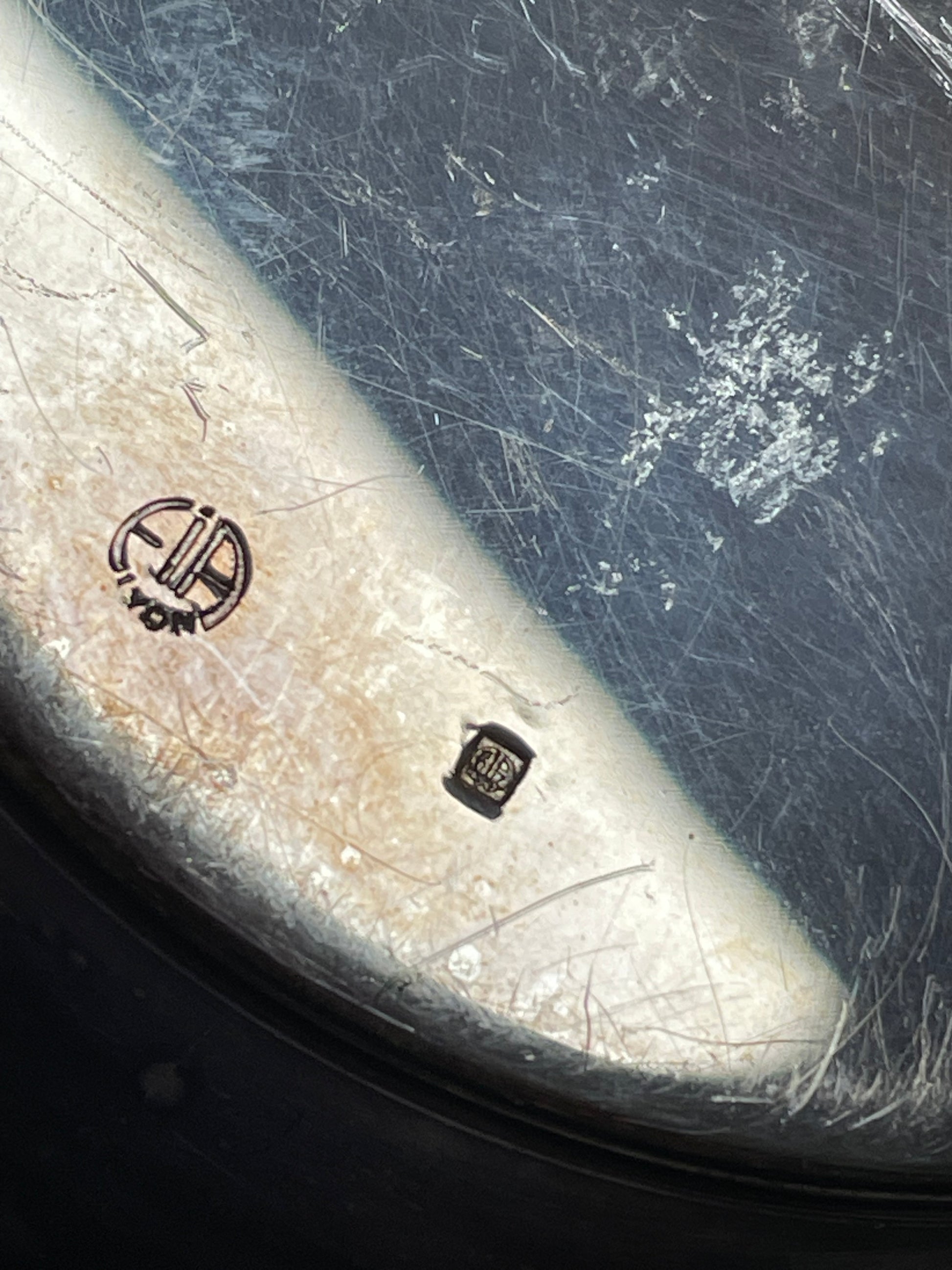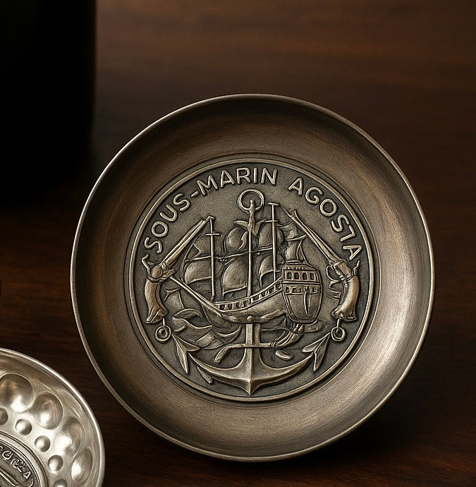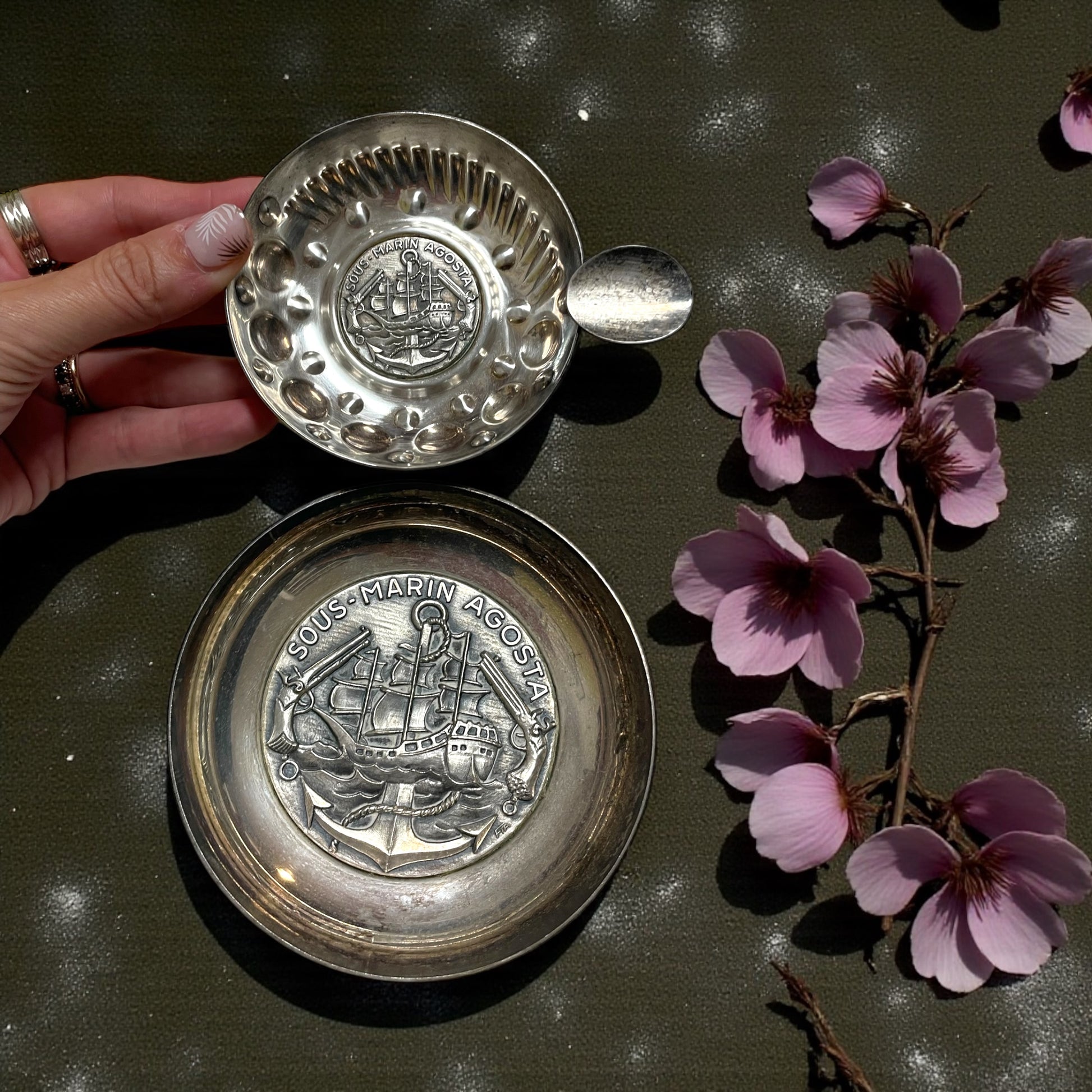 Realizzati negli anni Settanta dalla celebre maison E.I.A. – Établissements Industriels d’Argenterie di Lione, questi due tastevin francesi commemorano il Sous-Marin Agosta, sottomarino d’attacco diesel-elettrico varato nel 1974, fiore all’occhiello della Marina francese e capostipite della classe omonima. Sul fondo di entrambi spicca un medaglione in rilievo raffigurante un veliero stilizzato circondato da ancore, pistole e onde, allegoria di coraggio e memoria navale. Il modello più grande (230 g) reca la firma dell’incisore François Théodore Anfray (FTA), medaglista francese attivo nel XX secolo, autore di molte emissioni commemorative per la Marina nazionale. Sul retro sono visibili i punzoni E.I.A. LYON e AA, che identificano la manifattura e l’impiego di argento massiccio nel medaglione centrale. Il tastevin più piccolo, pur recando lo stesso emblema, è realizzato interamente in metallo argentato. Questi due rari esemplari, probabilmente destinati a ufficiali o a occasioni commemorative legate al varo del sommergibile, uniscono arte, storia e maestria orafa francese in una perfetta sintesi di eleganza e forza.