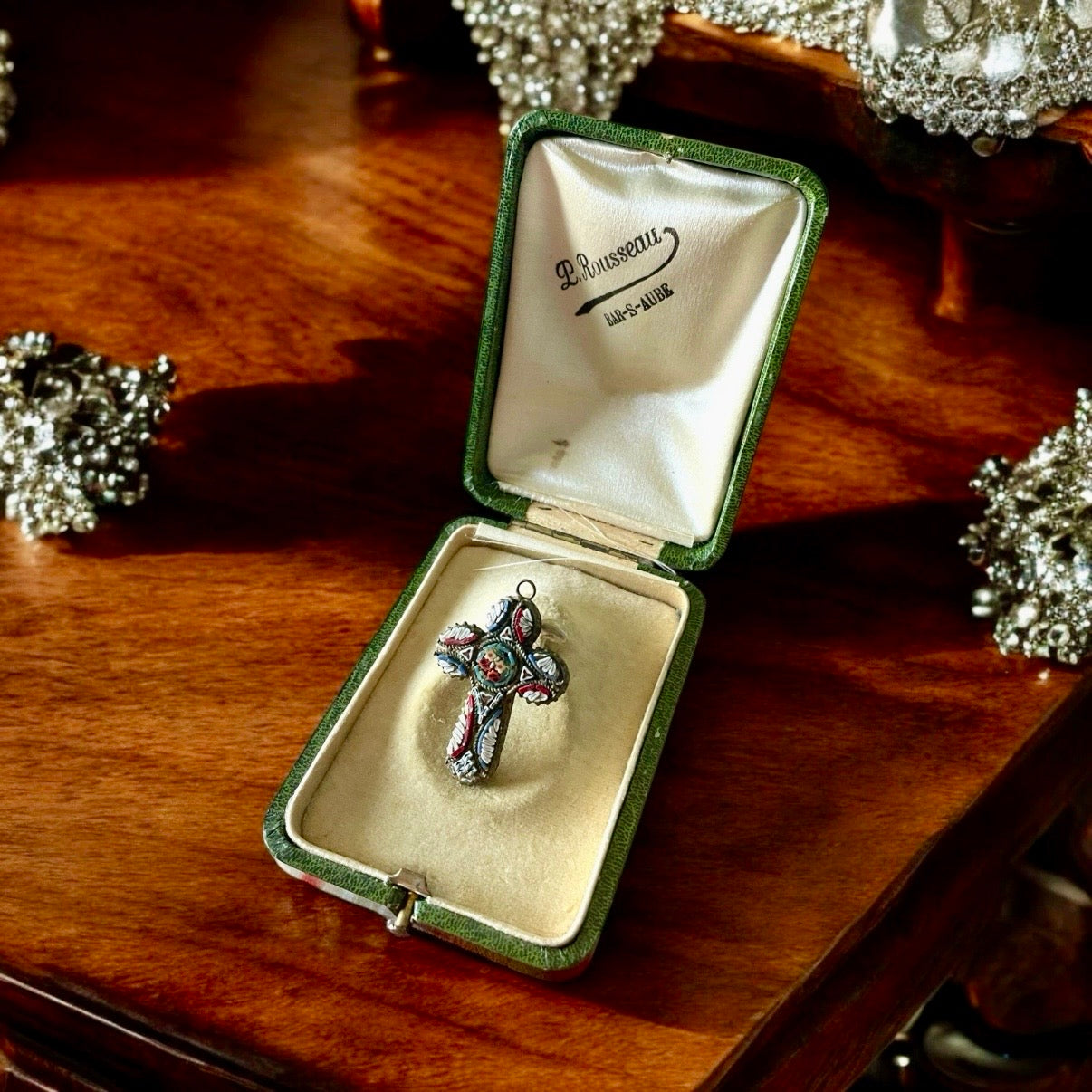 Croce gioiello italiano in micromosaico con paste vitree e ottone, ca anni ‘40