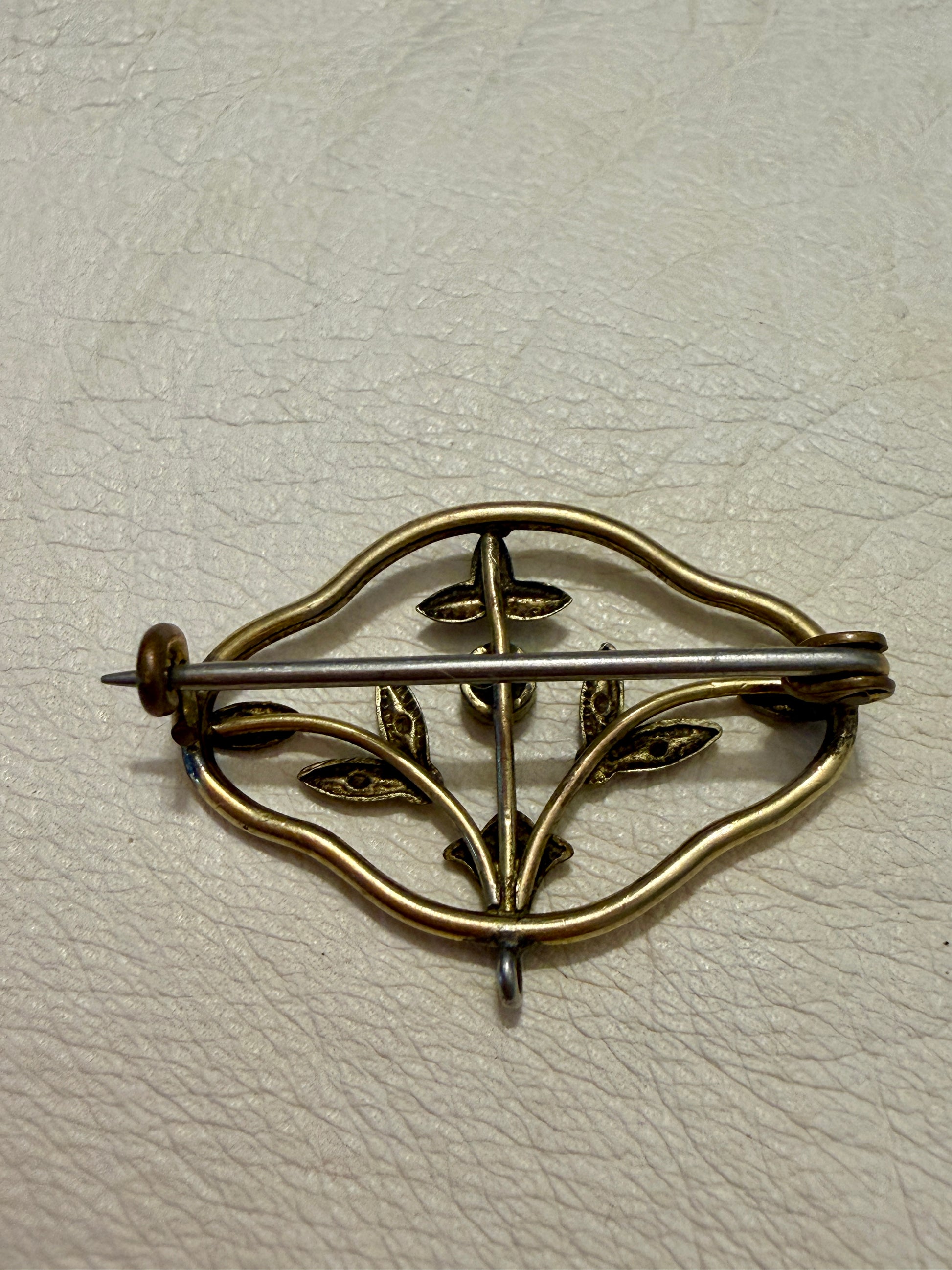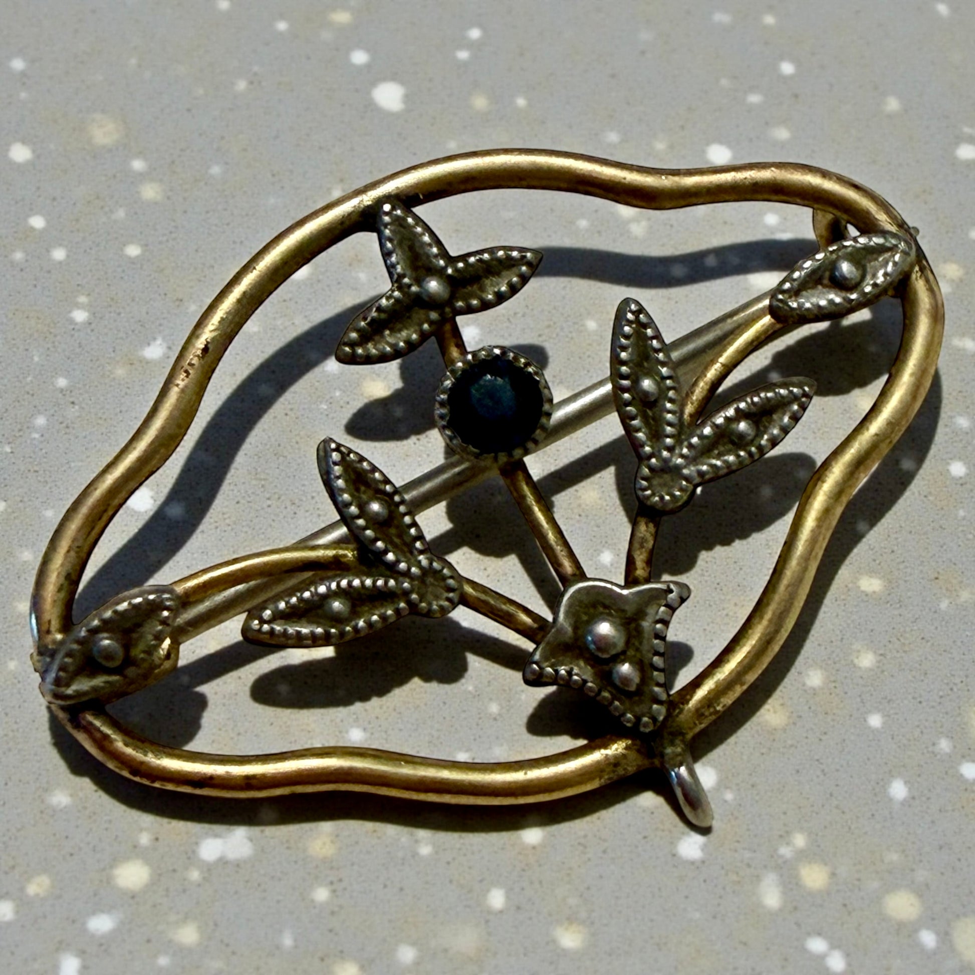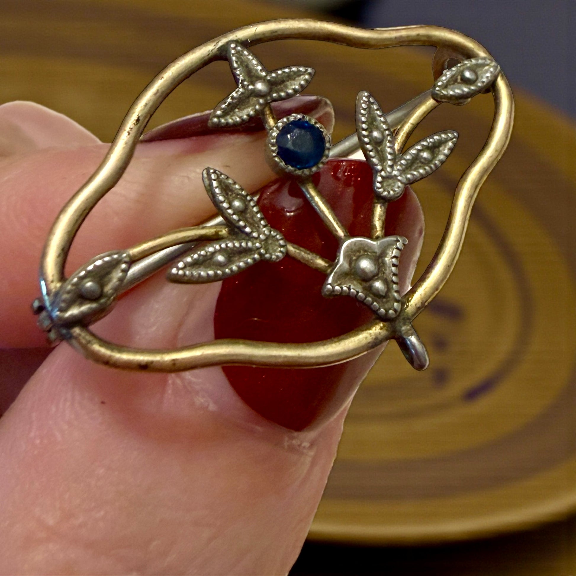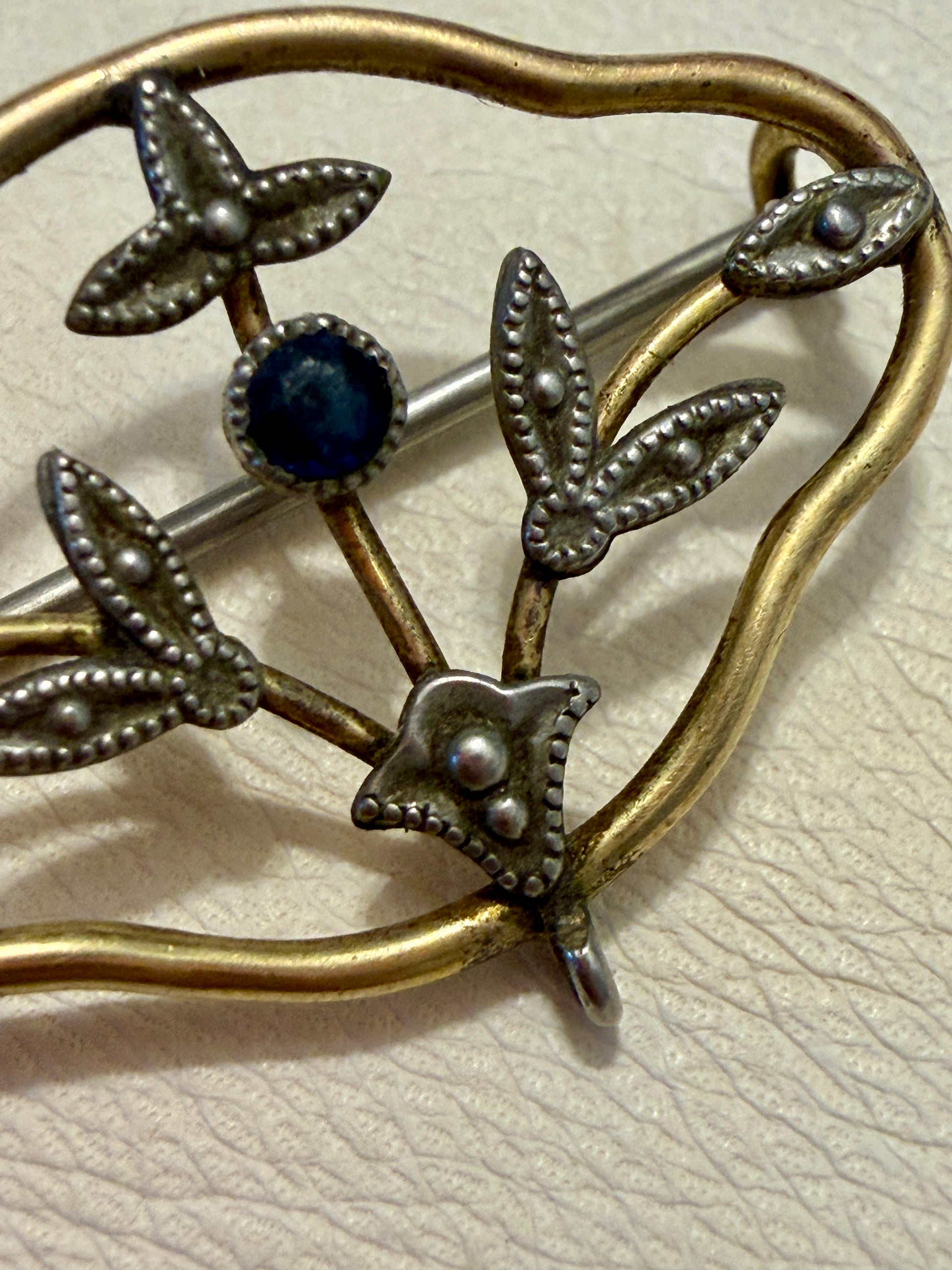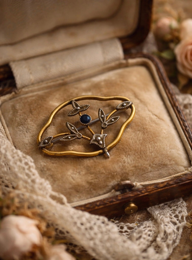 Non è un gioiello da vetrina. È un segno di carattere. Questa spilla di fine Ottocento – primi del Novecento nasce come “spilla da giorno”: un accessorio elegante ma misurato, pensato per accompagnare l’abito senza dominarlo. La cornice placcata oro, morbida e ondulata, racchiude un motivo floreale argentato con micro-granulazioni decorative e una piccola pietra blu centrale.