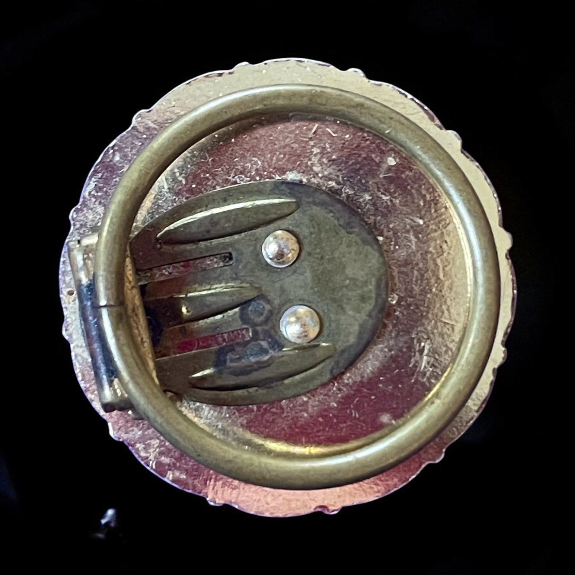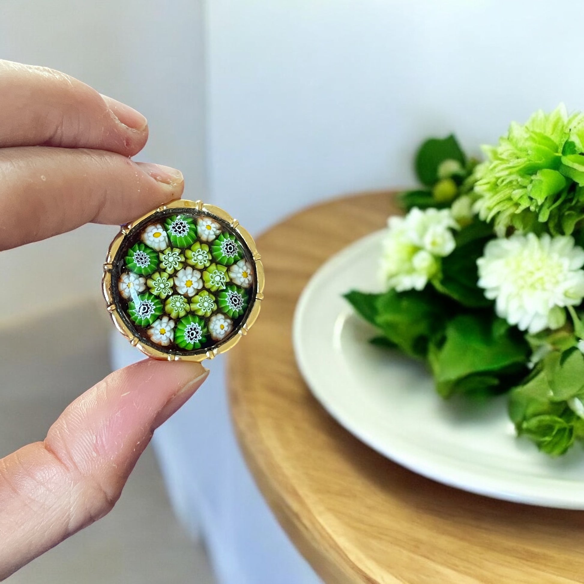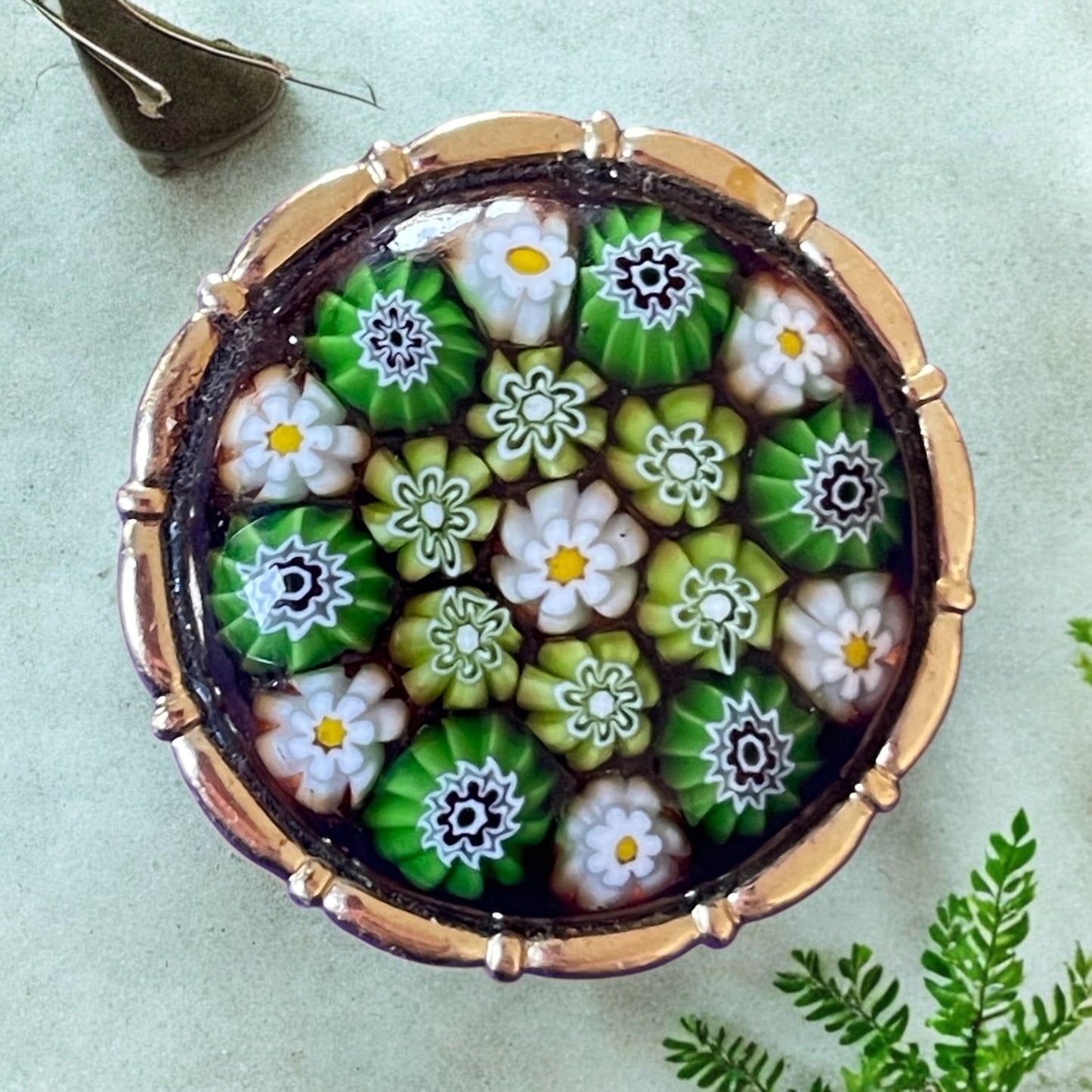 Un piccolo capolavoro di vetro, questo fermaglio per foulard o sciarpe racchiude al suo interno un mosaico di murrine verdi e bianche, fusi in un’unica superficie liscia e luminosa. I delicati fiori, intrappolati nel vetro come sospesi nel tempo, creano un effetto di profondità e armonia cromatica. Il bordo in metallo dorato aggiunge un tocco di eleganza. Anni ‘60. Un oggetto di straordinaria bellezza, che porta con sé la tradizione e la magia della lavorazione artigianale del vetro.