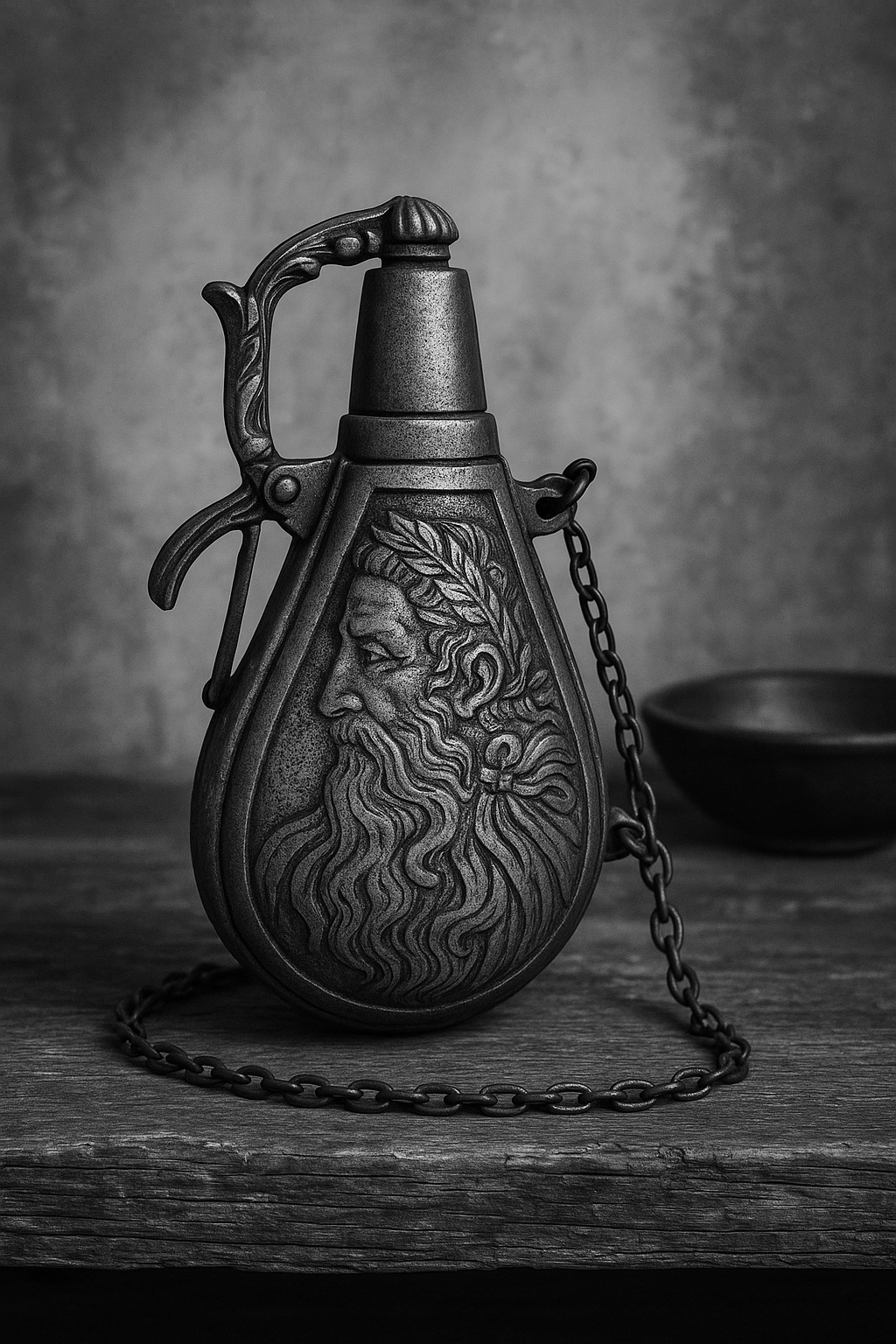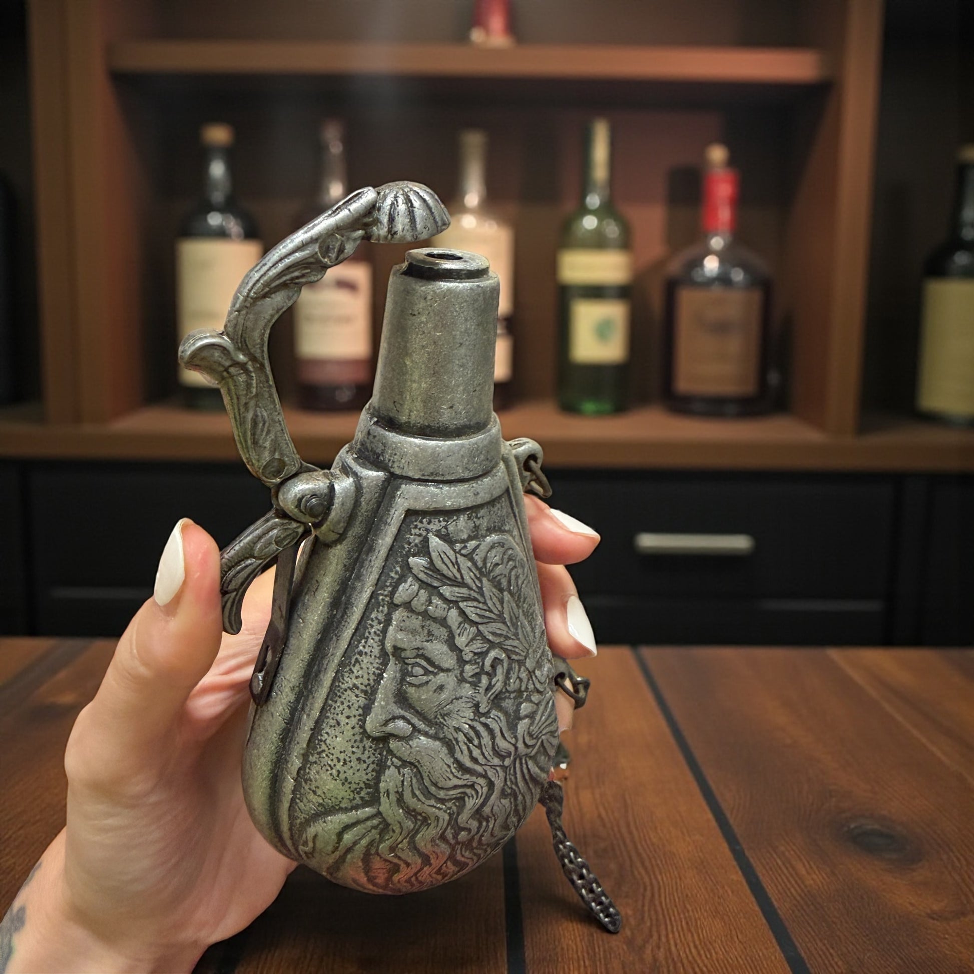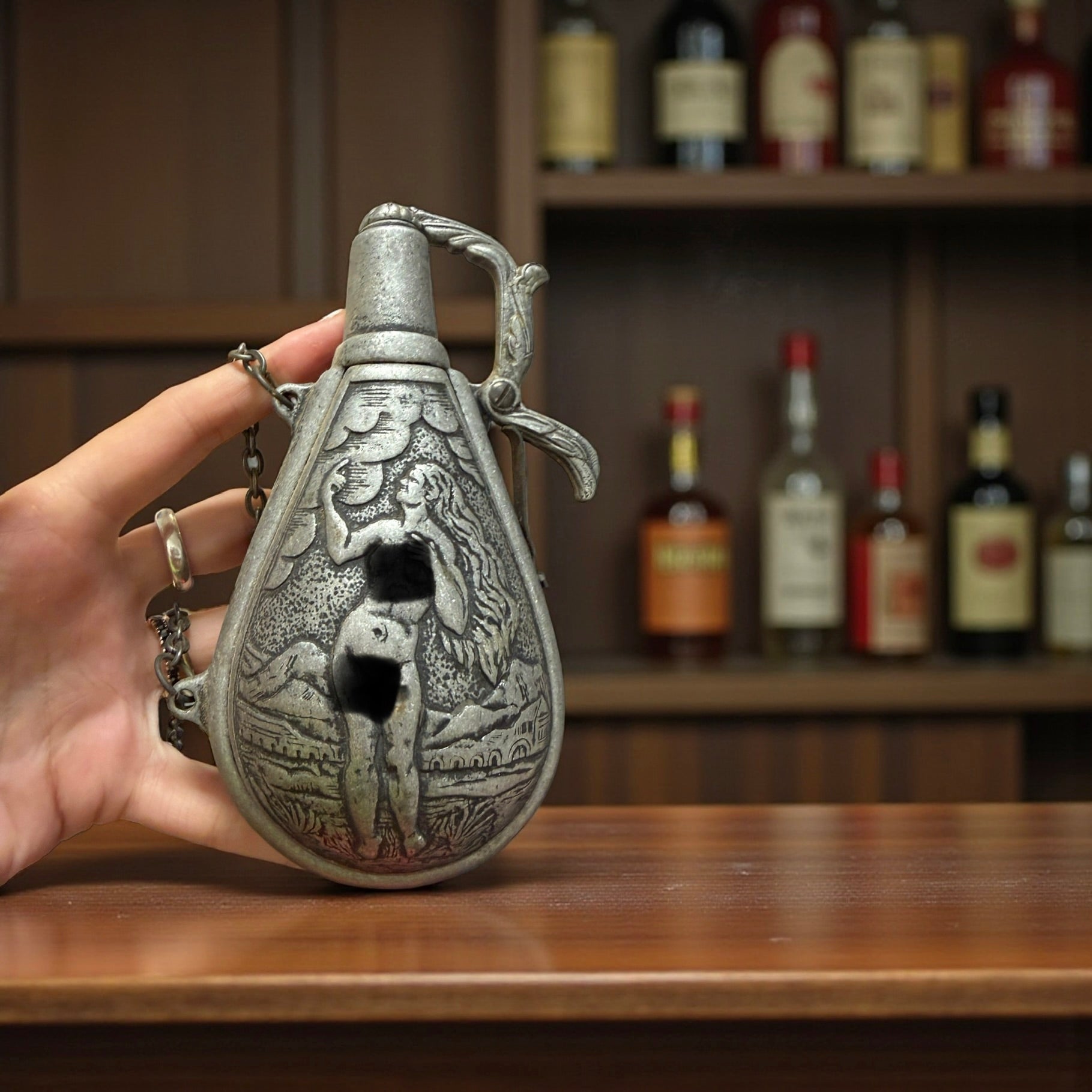 Questa fiaschetta da polvere appartiene arriva a noi dagli anni Cinquanta, quando nelle case italiane e europee iniziavano a comparire oggetti decorativi in lega che univano funzionalità, gusto popolare e un desiderio diffuso e comprensibile di riportare nelle stanze immagini rassicuranti, simboliche, riconoscibili. Non imitava l’antico: interpretava il passato con linguaggio moderno, come si faceva allora. Le officine producevano oggetti solidi, pesanti, destinati ai salotti, alle taverne domestiche, ai mobili “importanti” di un’Italia che stava ricominciando. Per questo presenta figure semplici ma forti: