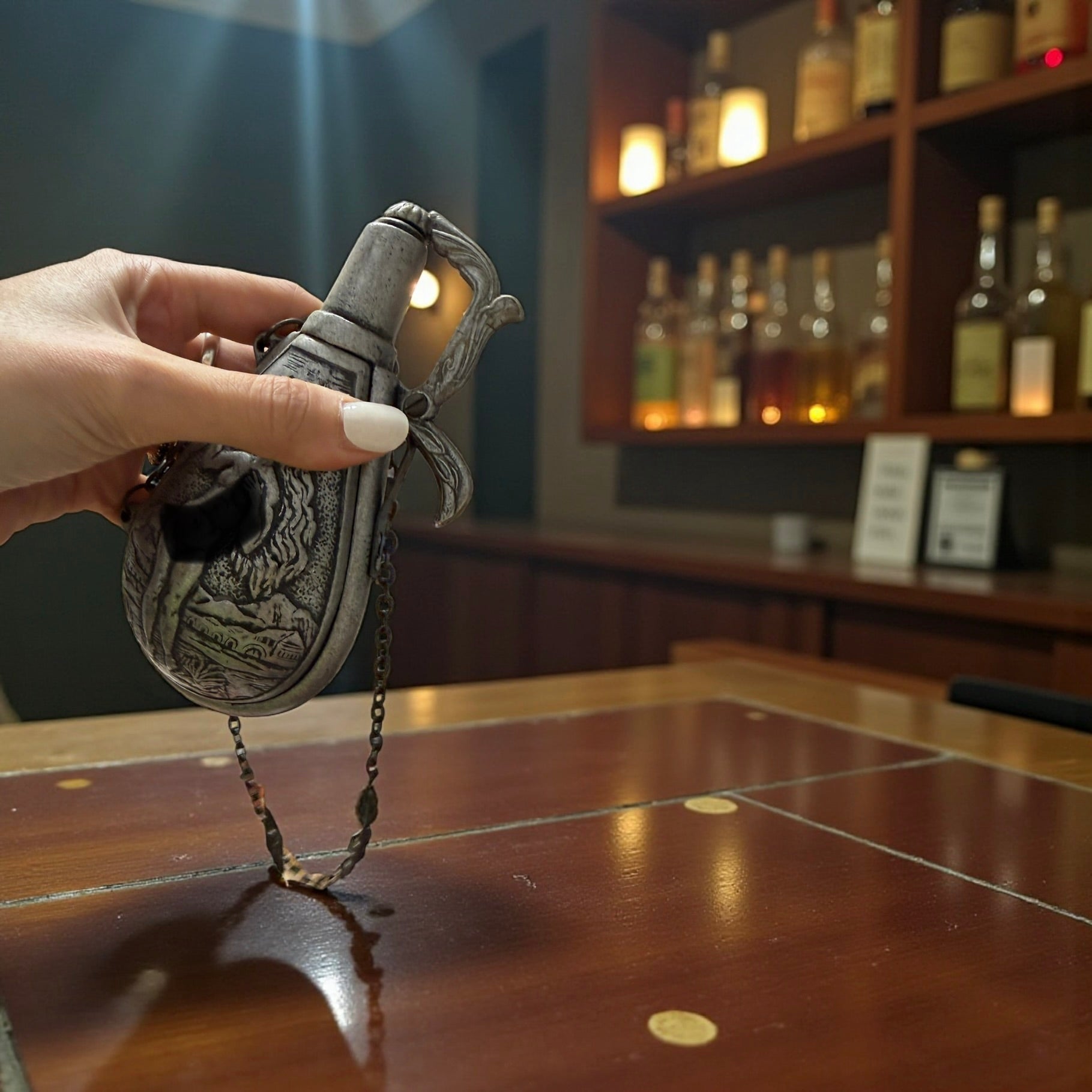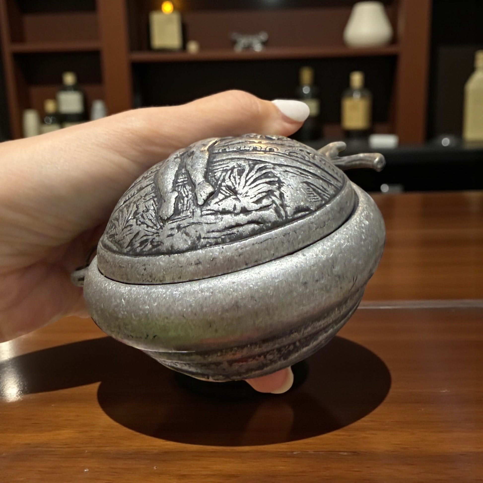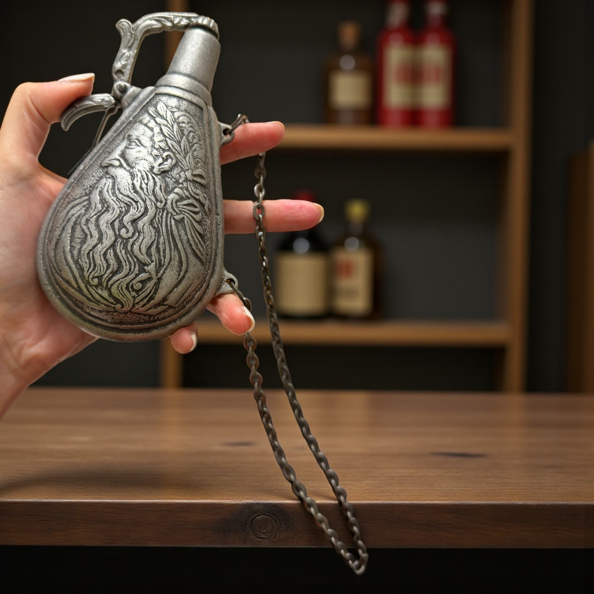 Questa fiaschetta da polvere appartiene arriva a noi dagli anni Cinquanta, quando nelle case italiane e europee iniziavano a comparire oggetti decorativi in lega che univano funzionalità, gusto popolare e un desiderio diffuso e comprensibile di riportare nelle stanze immagini rassicuranti, simboliche, riconoscibili. Non imitava l’antico: interpretava il passato con linguaggio moderno, come si faceva allora. Le officine producevano oggetti solidi, pesanti, destinati ai salotti, alle taverne domestiche, ai mobili “importanti” di un’Italia che stava ricominciando. Per questo presenta figure semplici ma forti: