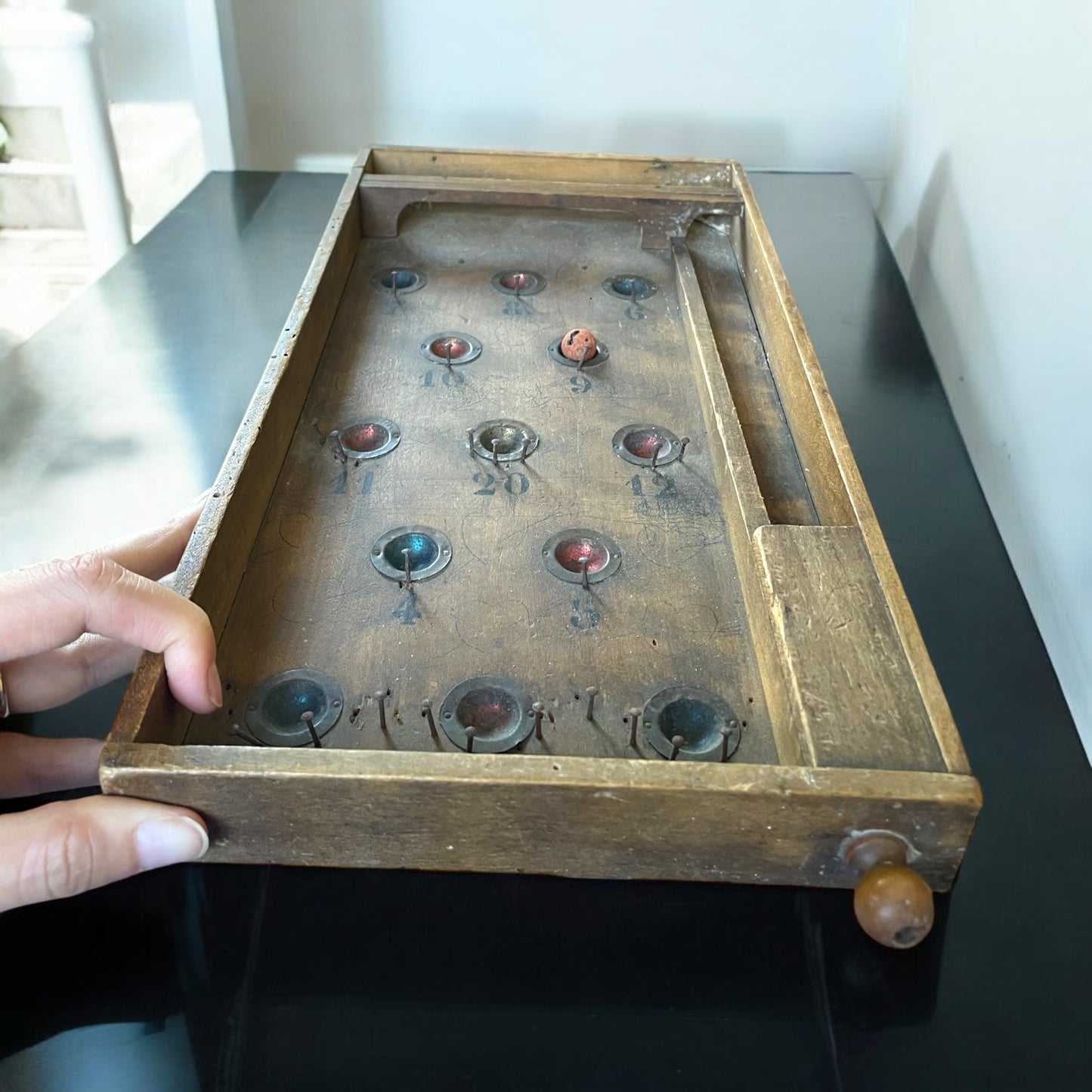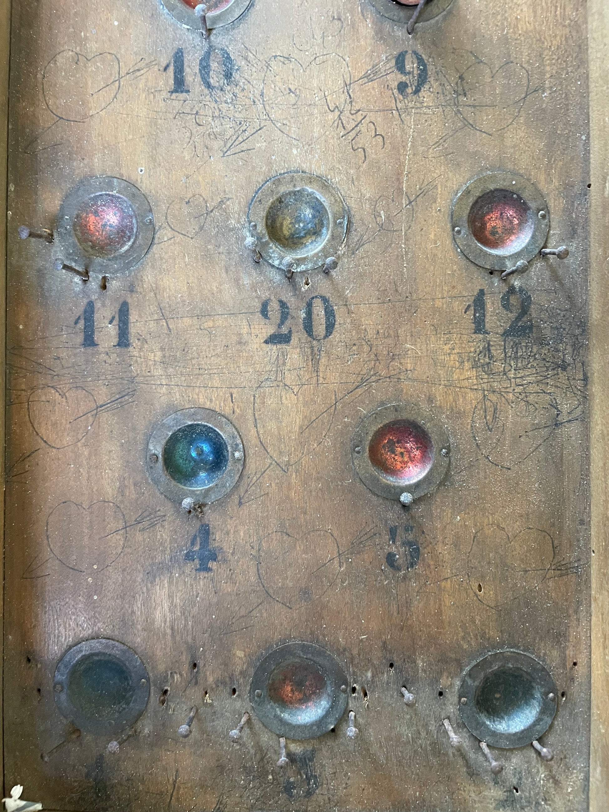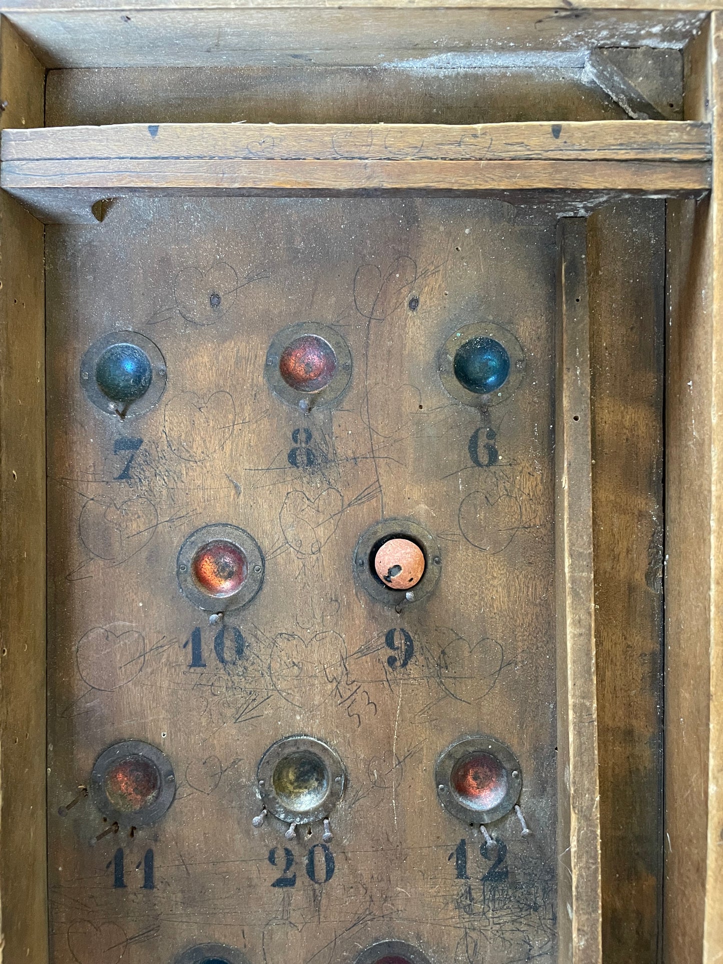 Se volete tornare bambini stamattina avete l’opportunità di mettere le mani su un pezzone… l’antico flipper! Anni ‘20, legno, funziona ancora a destra la molla per lanciare la pallina e… magia! C’è anche quella, che solitamente invece non si trova. Il flipper da tavolo è provvisto di una base d’appoggio posteriore, gli avvallamenti con i punteggi stampigliati sono tutti bordati in ottone e colorati. A completare lo spirito brocante e la storia vissuta di questo oggetto i disegni e le scritte che qualcuno nel tempo vi ha tracciato. Stupendamente unico! Dimensioni: cm 39 x 20