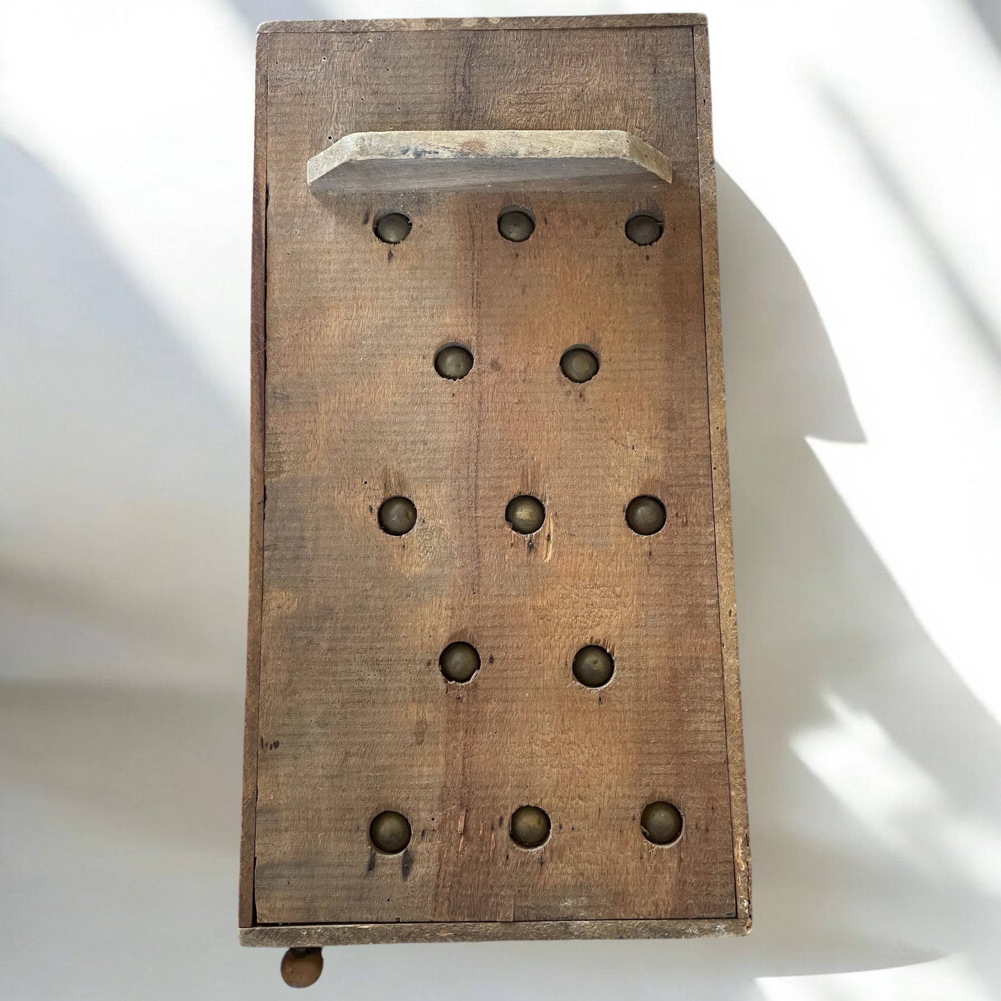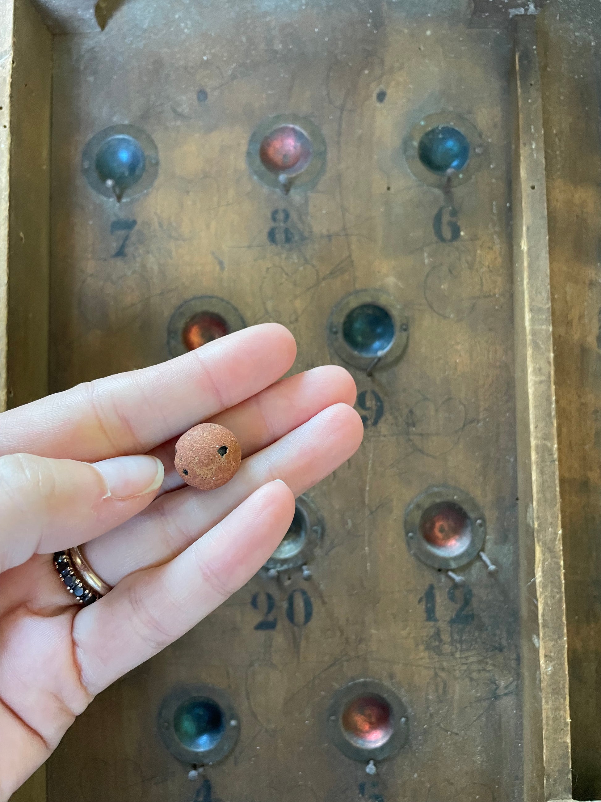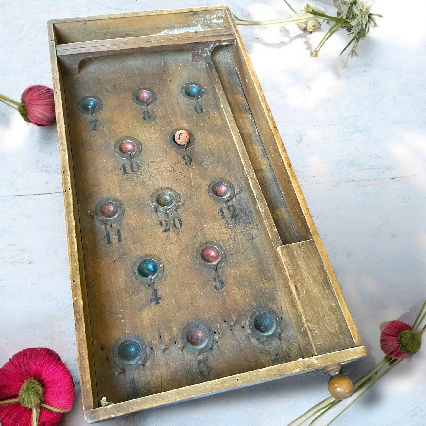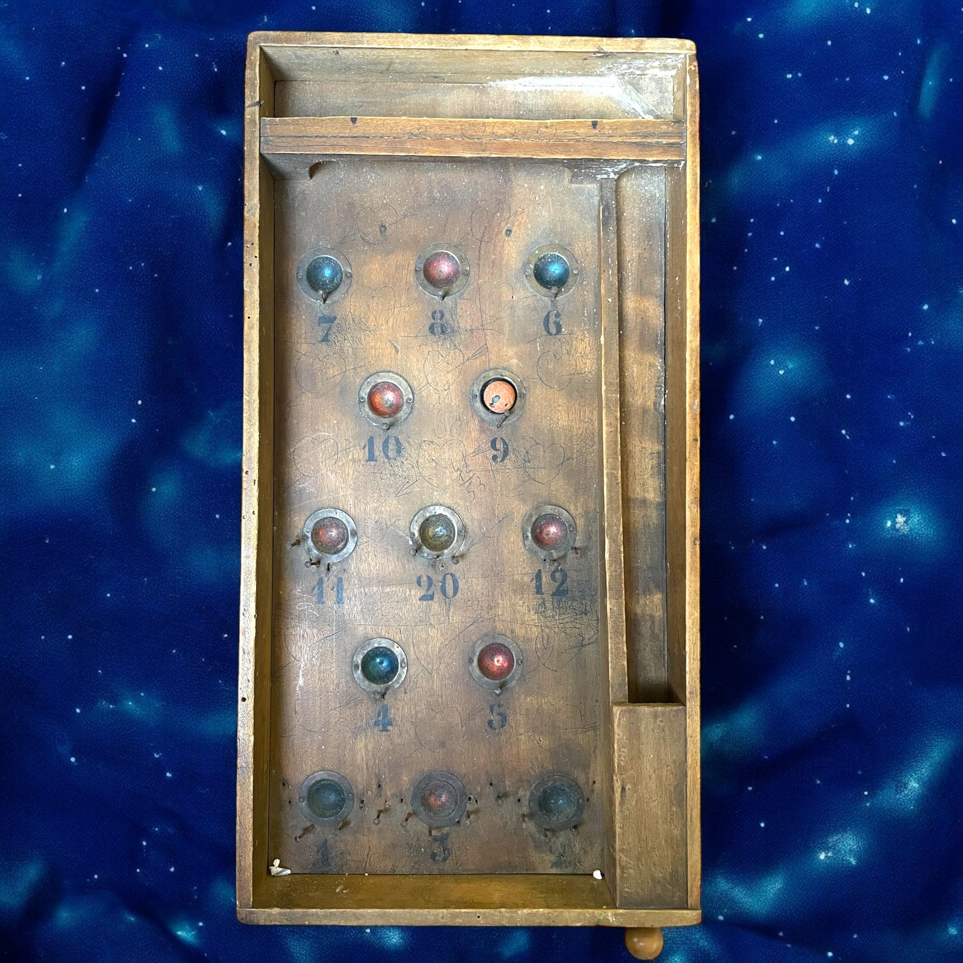 Se volete tornare bambini stamattina avete l’opportunità di mettere le mani su un pezzone… l’antico flipper! Anni ‘20, legno, funziona ancora a destra la molla per lanciare la pallina e… magia! C’è anche quella, che solitamente invece non si trova. Il flipper da tavolo è provvisto di una base d’appoggio posteriore, gli avvallamenti con i punteggi stampigliati sono tutti bordati in ottone e colorati. A completare lo spirito brocante e la storia vissuta di questo oggetto i disegni e le scritte che qualcuno nel tempo vi ha tracciato. Stupendamente unico! Dimensioni: cm 39 x 20