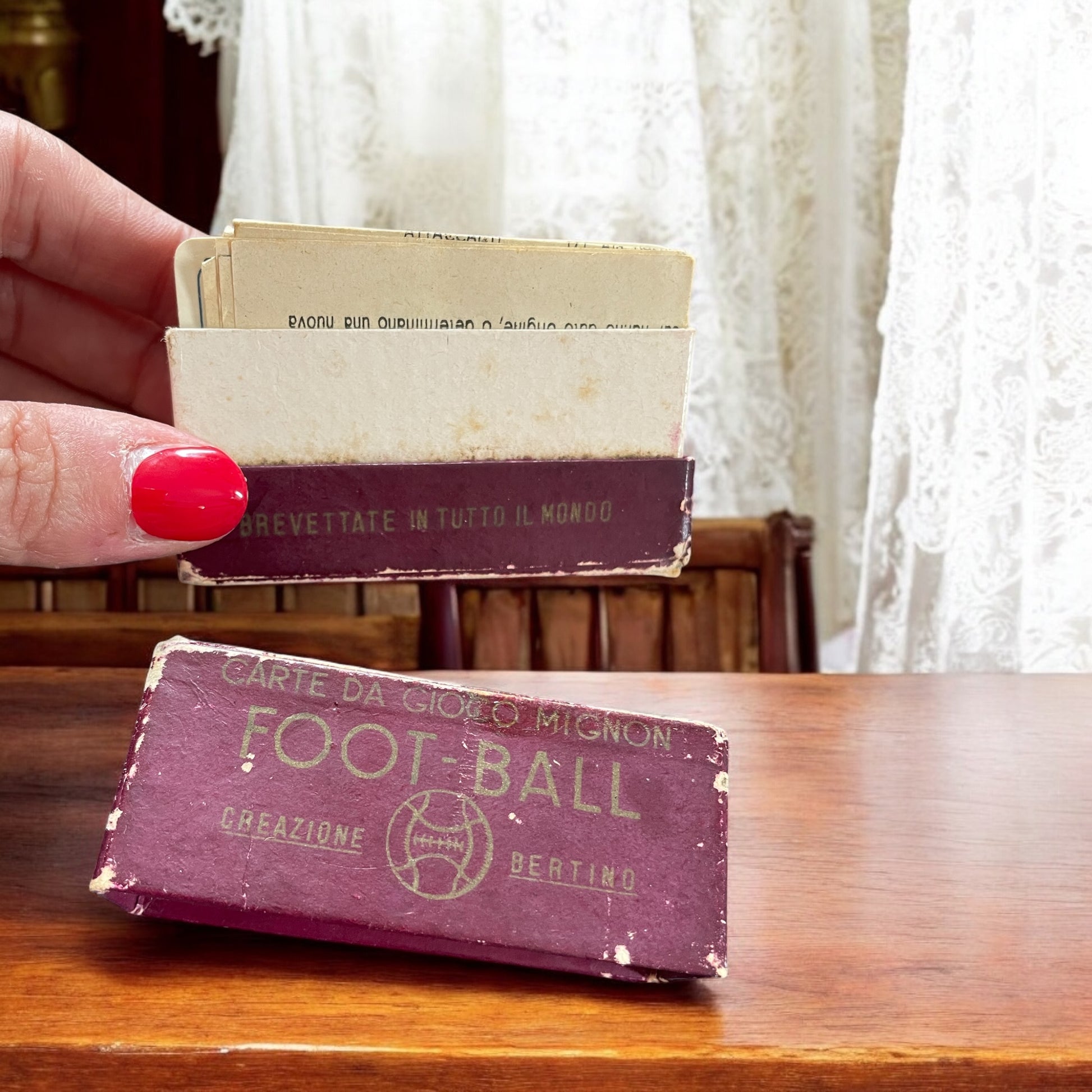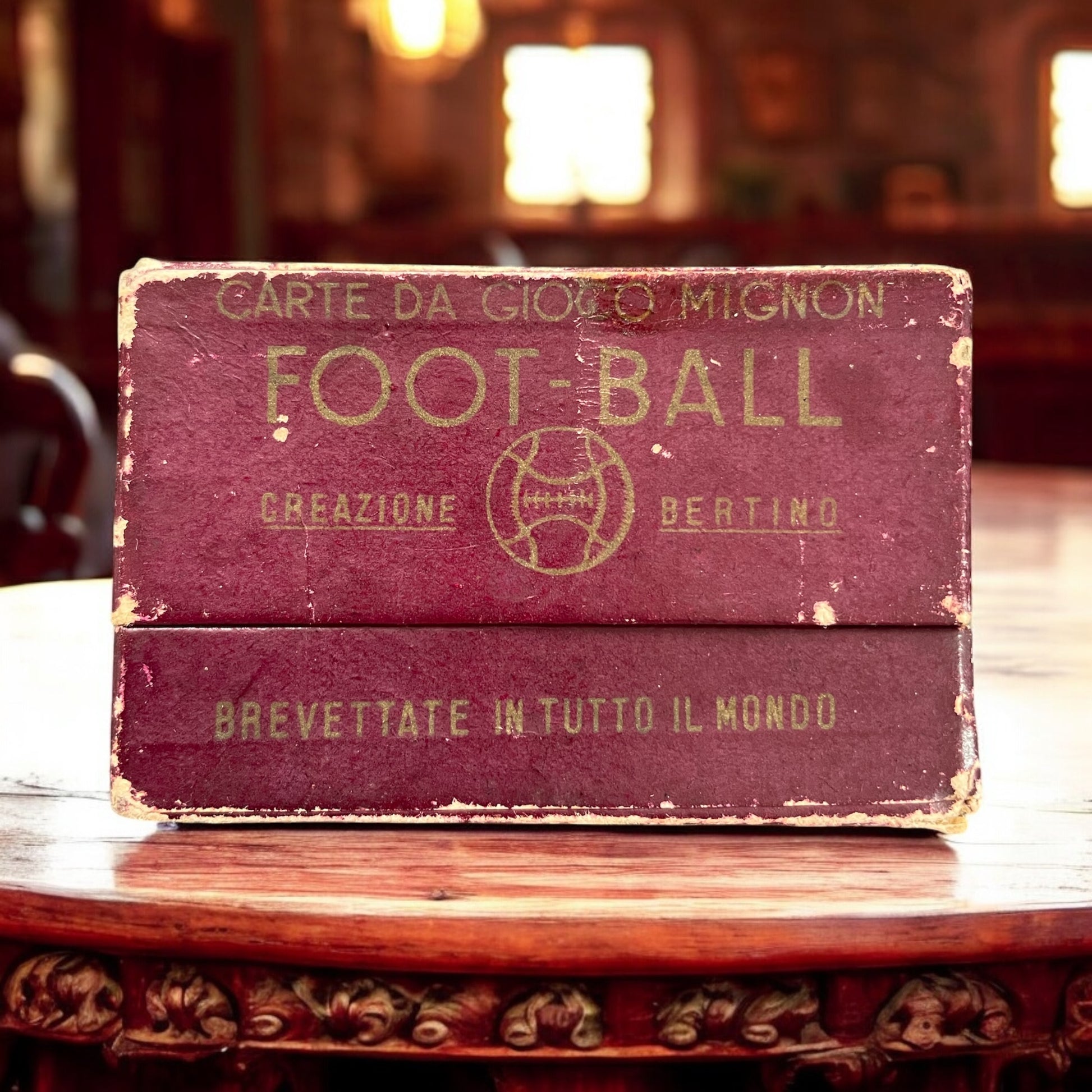 Erano gli anni ’50, e nei bar di paese il calcio non si guardava in TV: si giocava tra battute, mani esperte e carte da mischiare con cura. Questo mazzo di carte “Foot-Ball” – creazione Bertino, brevettato in tutto il mondo – era un piccolo campionato da tavolo, capace di accendere le discussioni più focose tra tifosi e amici.