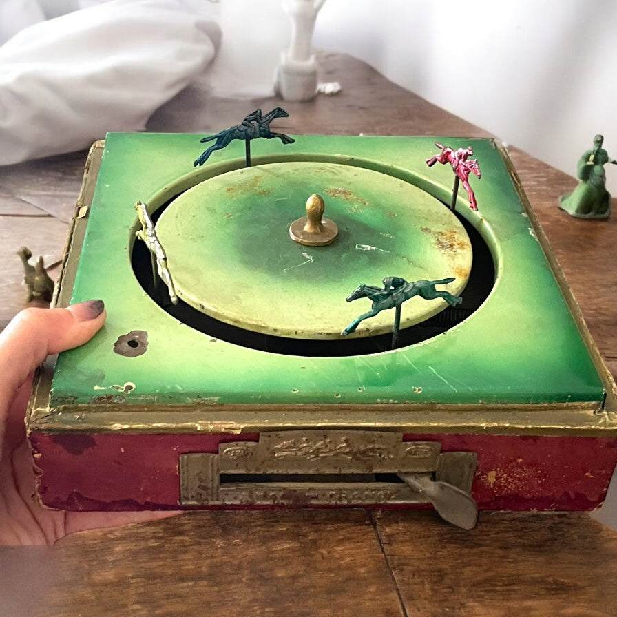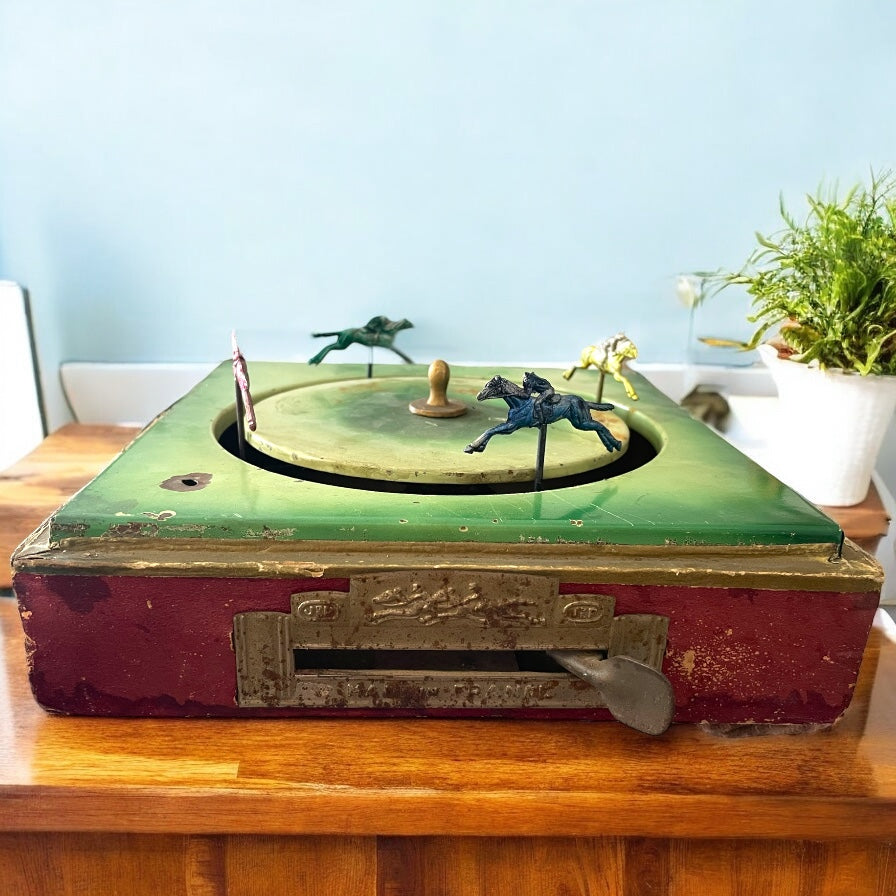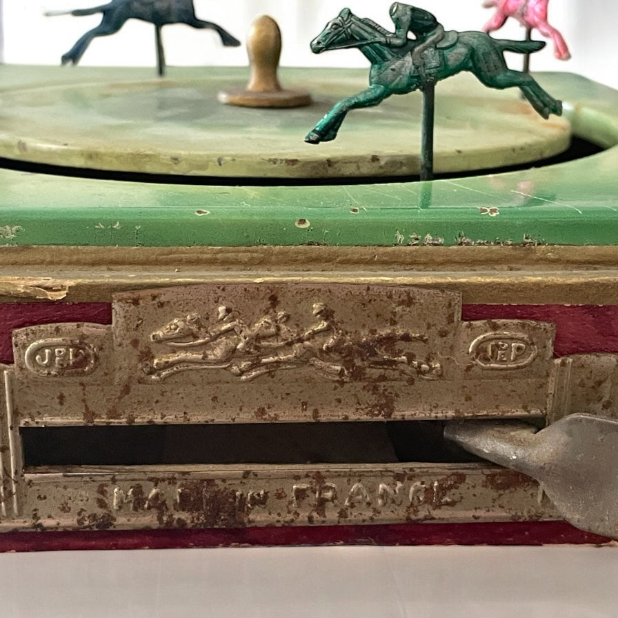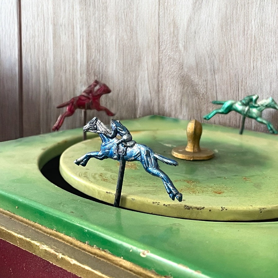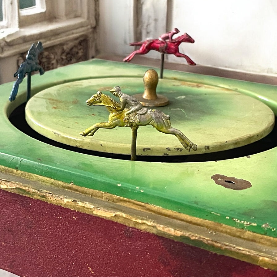Gioco meccanico da corsa dei cavalli (“Horse Racing Game”. Base in cartone pressato con decori in metallo dorato e piano di latta verde, con coperchio. Inizio Novecento, perfettamente funzionante. Dimensioni: 21,5 cm x 21,5 cm (quadrato). Condizioni: usura visibile su verniciatura e metallo (come da fascino d’epoca), manca la piccola bandierina segnaletica ma è completa e integra la meccanica di corsa. Pezzo raro: da collezione e per veri amanti di suggestioni d’altri tempi.