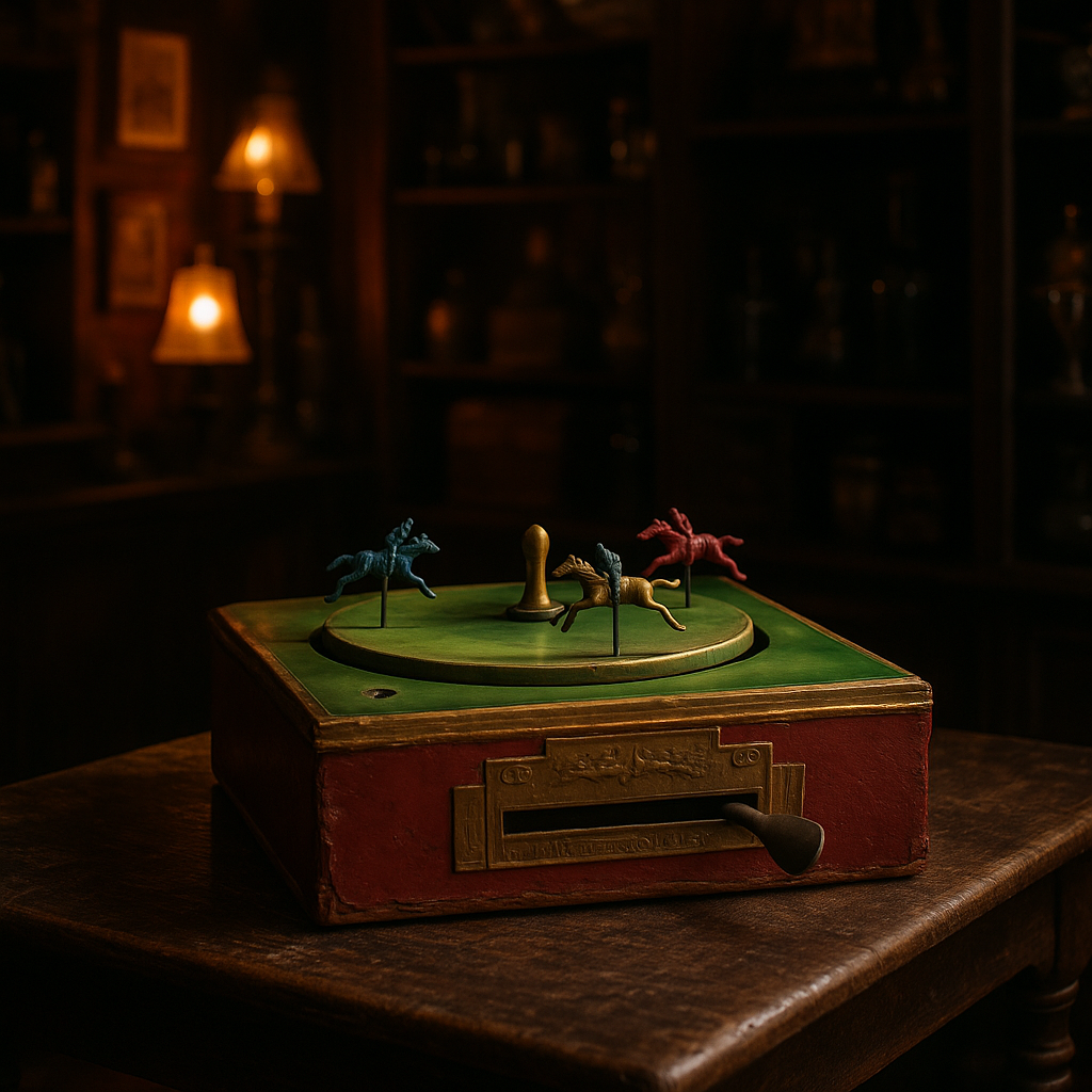 Stava sudando freddo. Attendeva che la corsa dei cavalli si fermasse, il respiro quasi gli mancava. Sul blu aveva puntato tutto. Il meccanismo cigolava piano, mentre i cavalli danzavano attorno al piatto verde come spiriti imprigionati in un rituale antico. Le pareti della stanza sembravano stringersi, un soffio caldo sulla nuca e il cuore in gola: avrebbe vinto? Le luci si riflettevano sul metallo dorato, e nella mente risuonava il monito sussurrato da Leland Gaunt: “Il prezzo non è mai solo denaro”. Era proprio come in “Cose Preziose” di Stephen King: un oggetto apparentemente innocuo, un semplice gioco di latta… eppure un talismano di potere, capace di evocare i sogni più oscuri di chi lo sfidava. E tu? Su quale cavallo punteresti la tua anima?