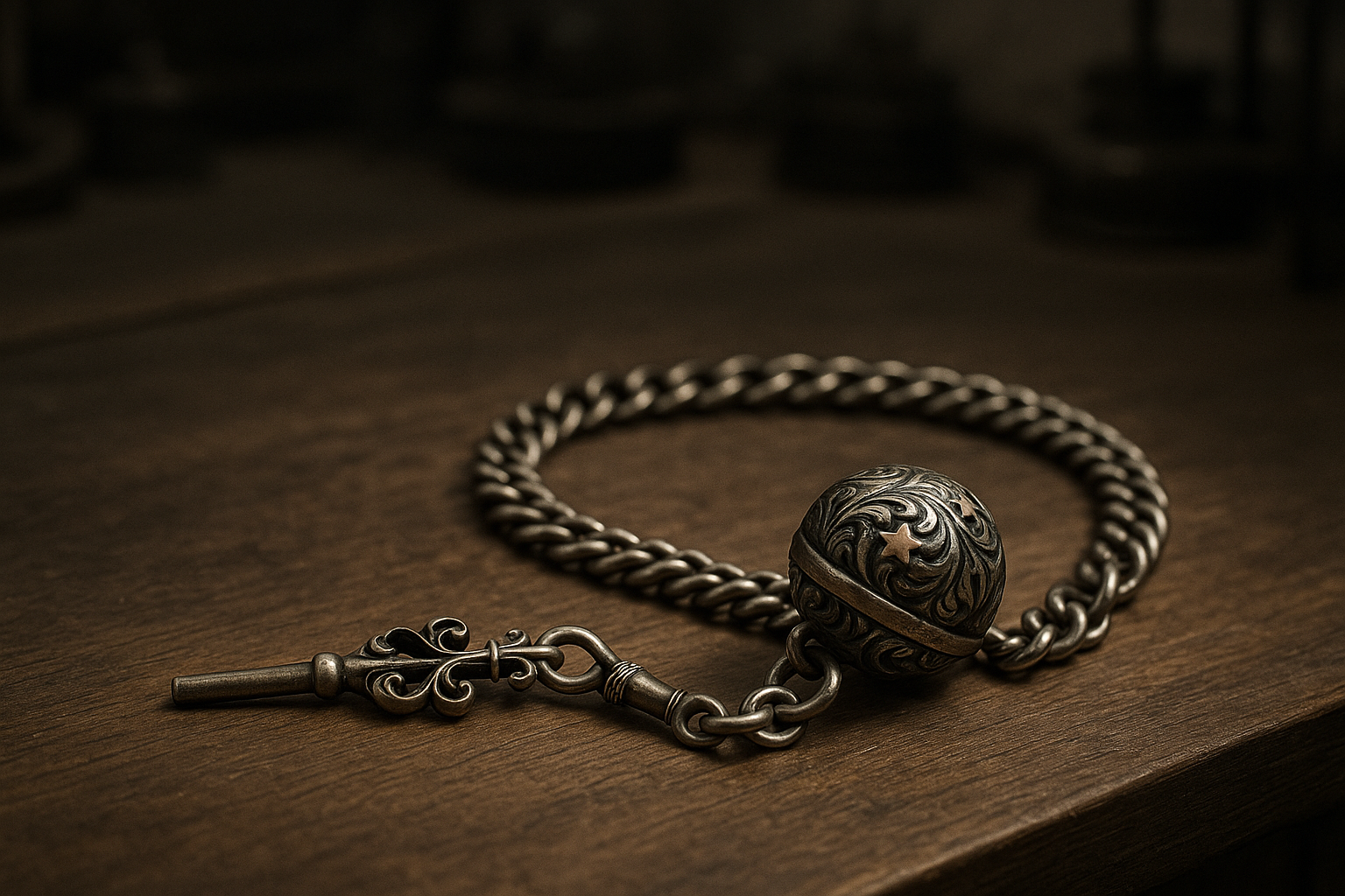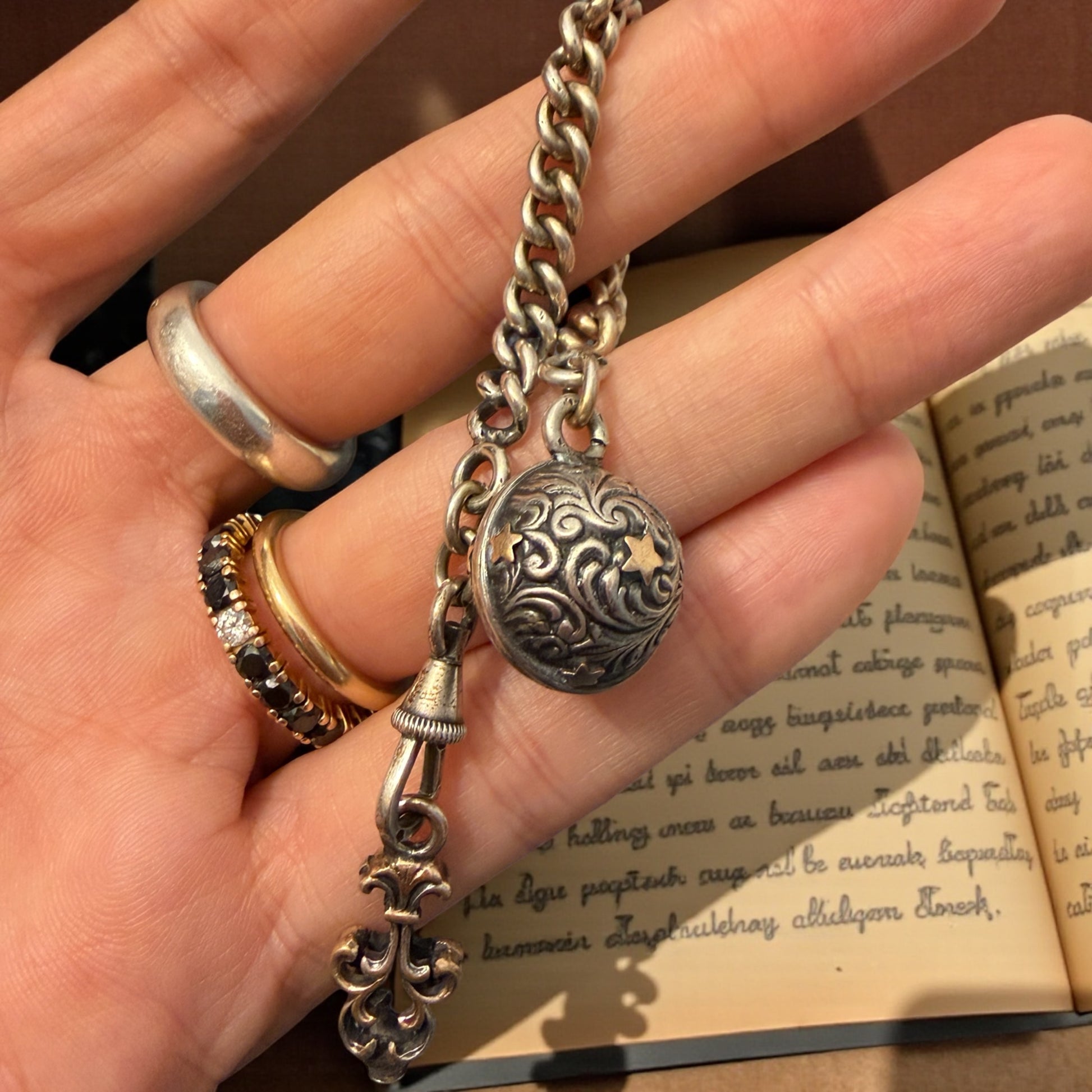 Un piccolo segreto francese dell’Ottocento, nato per il taschino di un uomo elegante. La catena sembra quasi vibrare di una vita passata: il peso, il suono morbido dei metalli antichi, l’intreccio delle maglie che conta gli anni. Era fatta per restare vicino al cuore, appoggiata al panciotto di chi si preparava a uscire di casa con il proprio orologio da tasca, come un rito quotidiano di precisione e bellezza. Dall’estremità, la chiave di carica continua a raccontare la stessa storia: un piccolo fiore di metallo in stile neorocaille, modellato con una cura che non si trova più. Dall’altra parte, la sfera cesellata sembra un piccolo cielo: volute vegetali che si avvolgono come un vento leggero e, tra di esse, stelle oro che brillano ancora oggi, dopo più di un secolo. È un dettaglio raro, tipico degli atelier francesi dell’Ottocento, quando il gioiello maschile era poesia discreta, mai ostentazione. E mentre la chain scivola lentamente tra le dita, è facile immaginare quante mattine abbia accompagnato, quanti orari abbia scandito, quante tasche abbia sfiorato. Non è soltanto un accessorio per orologio: è un frammento di eleganza, un gesto d’altri tempi rimasto sospeso fin qui. E tu, dove ti immagini che abbia iniziato il suo viaggio?