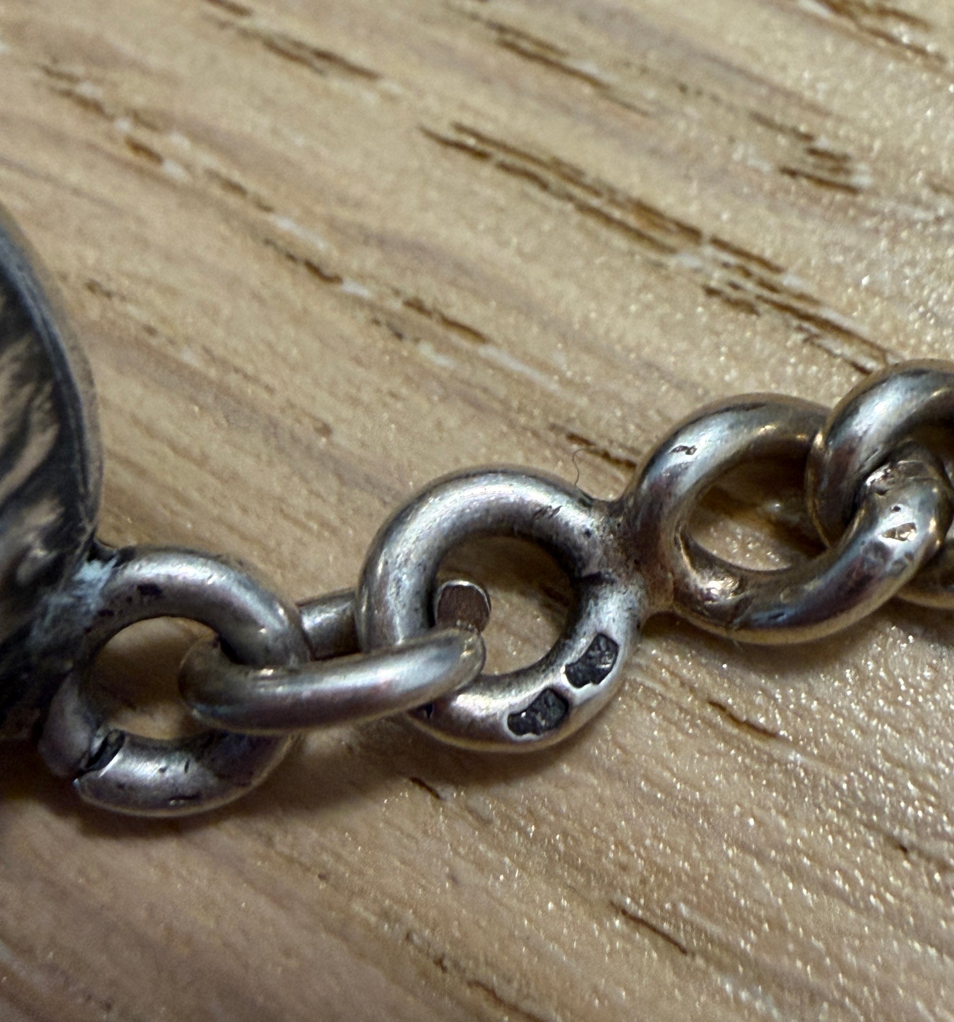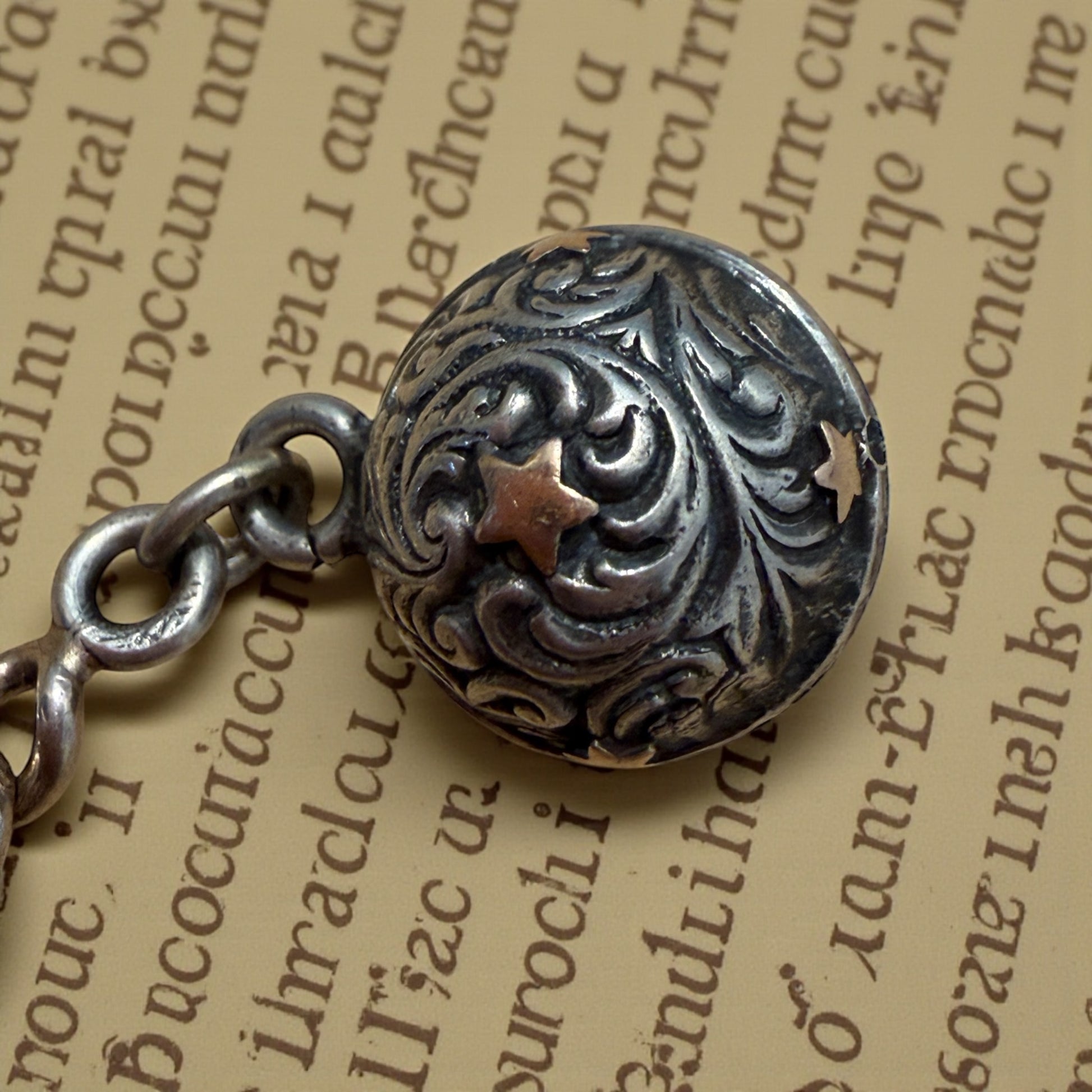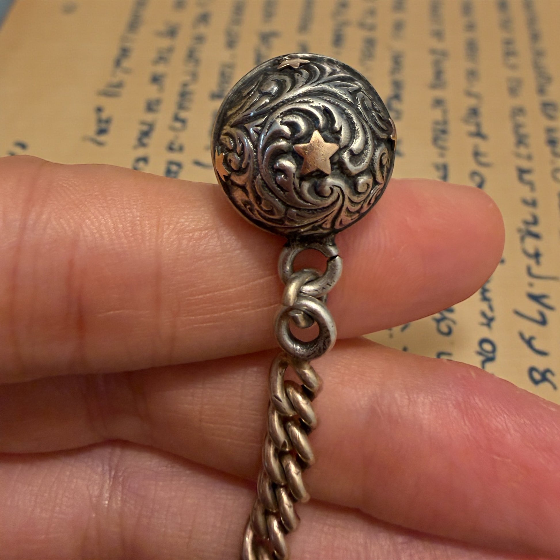 Catena da panciotto francese, fine XIX secolo (ca. 1885–1895). Argento punzonato Francia (probabile titolo 800/900). Fob sferico ornamentale in argento cesellato, stelle placcate oro. Chiave di carica originale, decorata stile neorocaille. Lunghezza complessiva: 16,5 cm. Peso totale: 12 g. Condizione: ottima, patina originale conservata. Provenienza: Francia.