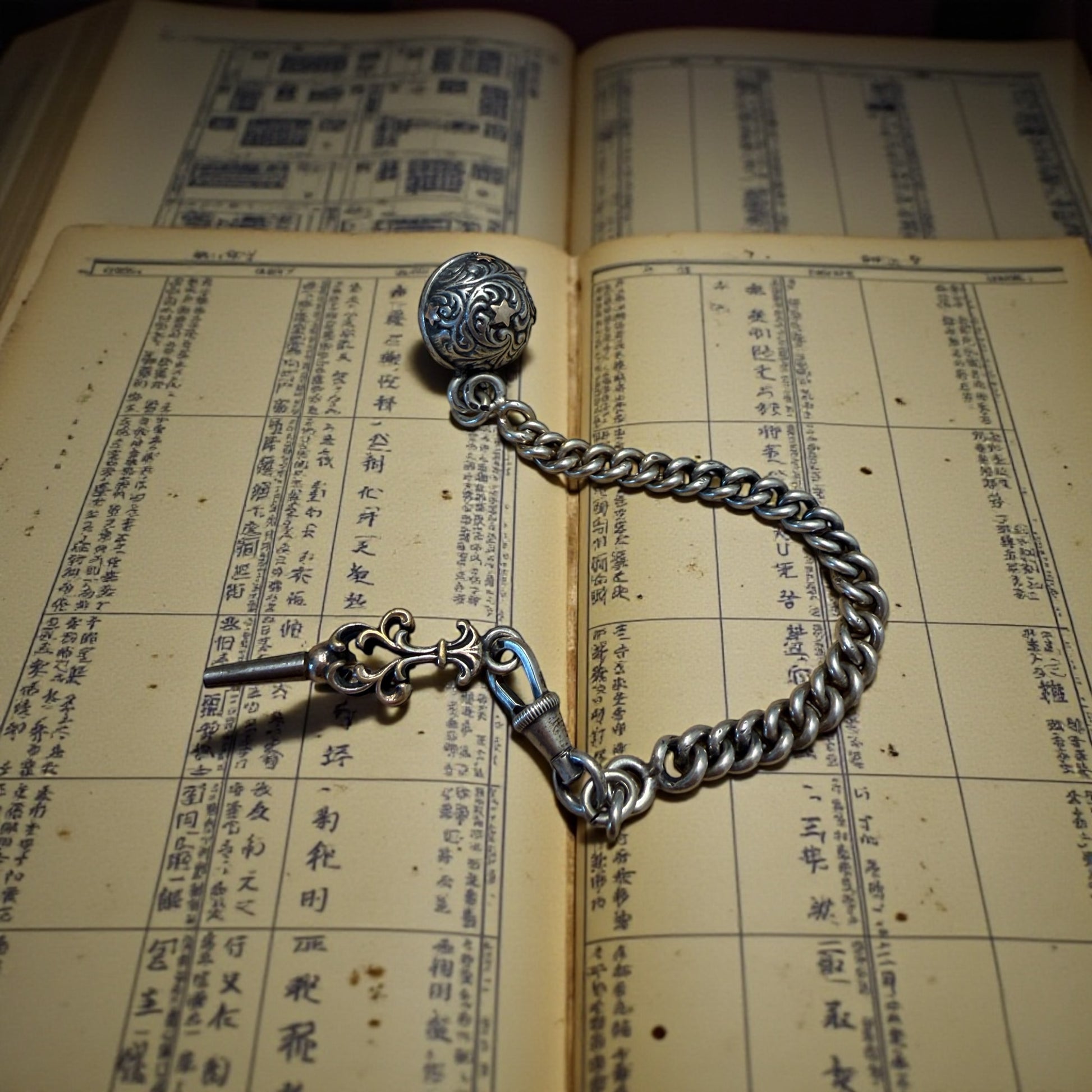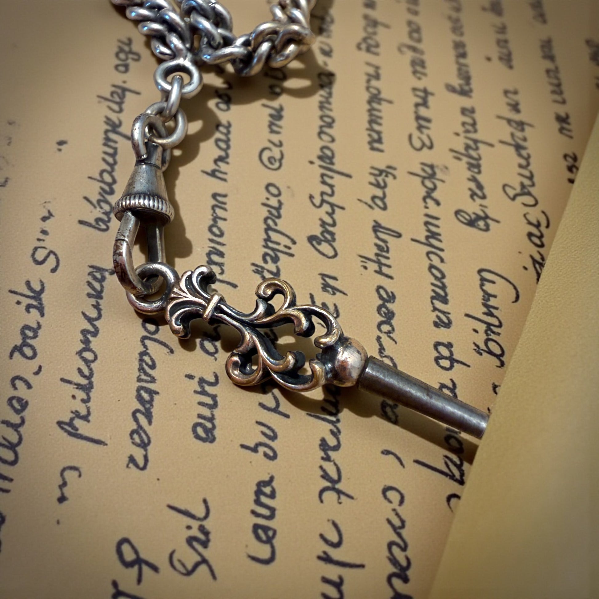 Gioiello maschile, tardo ottocentesco, catena da panciotto con chiave di carica e pendente fob
