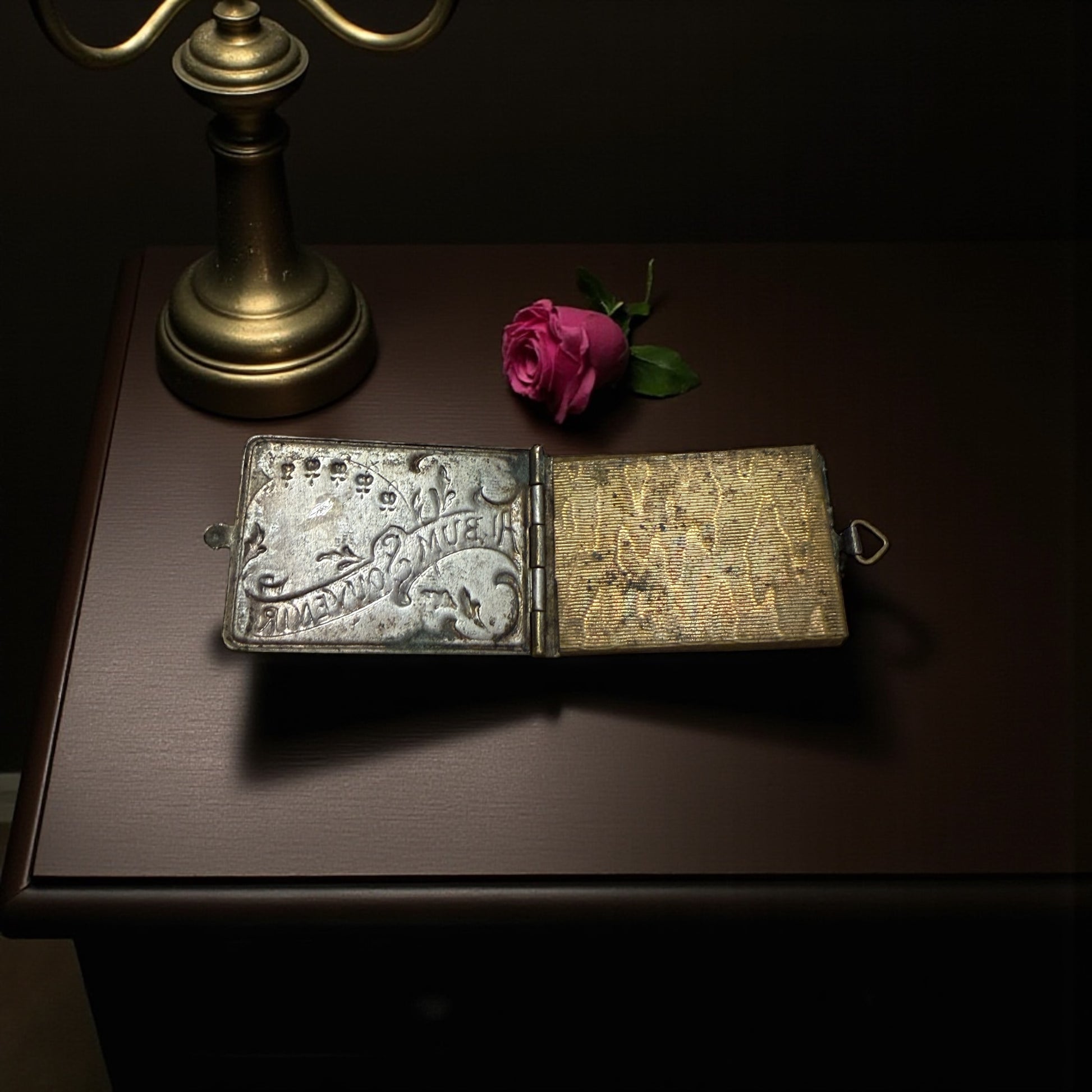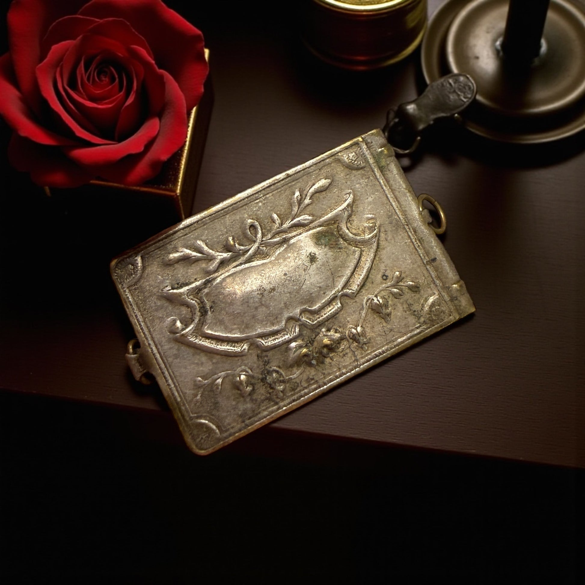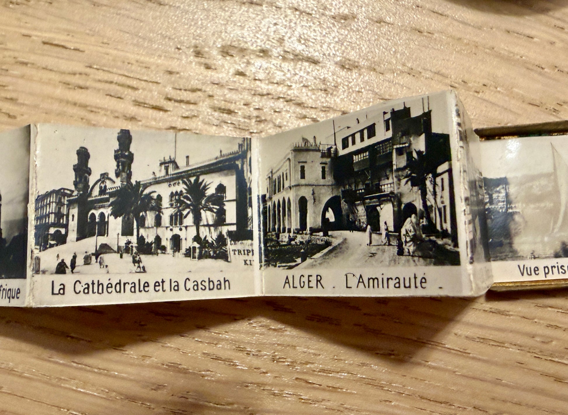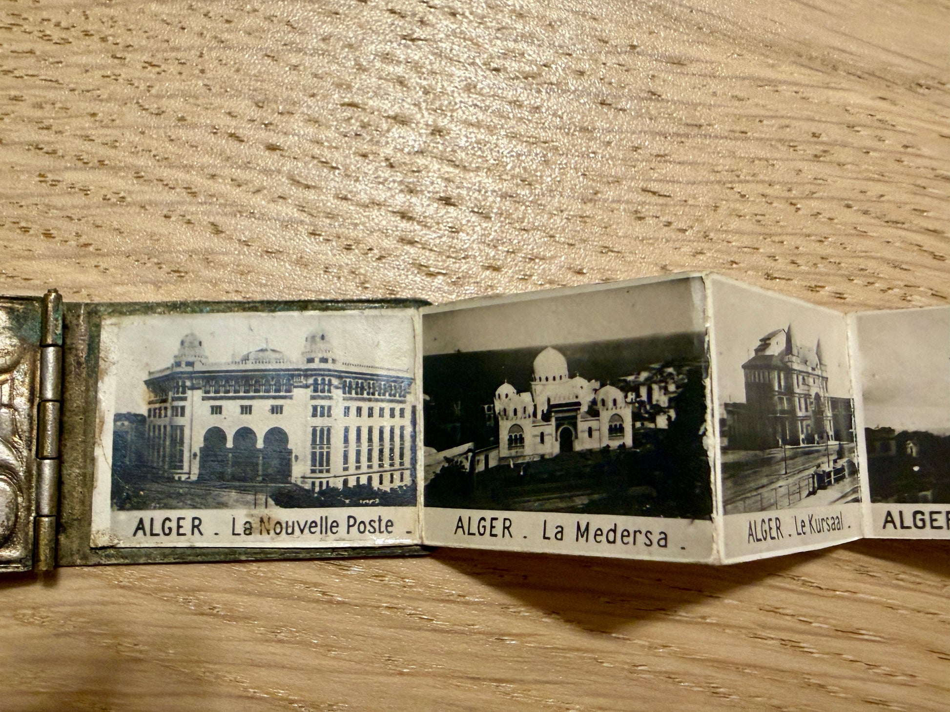 Un pendente che sembra un libro… ma custodisce un segreto. A prima vista, sembra un libriccino argentato. Poi lo giri tra le dita e capisci che non è un libro… È un pendente. È un gioiello. Ed è un gioiello che nasconde una storia. La copertina incisa, con volute eleganti e floreali, rivela tutta la cura della gioielleria di primo ’900: linee morbide, gusto Liberty, piccoli dettagli cesellati che brillano anche dopo più di cent’anni. Sul retro una cornice ornamentale, pensata per custodire iniziali. La chiusura, ancora perfetta, è un gancino minuscolo, delicato ma preciso, che scatta come un meccanismo segreto. Ed è proprio qui che il pendente rivela la sua magia. All’interno non c’è un cameo, non c’è una fotografia singola, non c’è una miniatura. C’è un mondo nascosto. Una fisarmonica di micro-fotografie originali dell’Algeri coloniale (1910–1920): la Nouvelle Poste, la Medersa, Notre Dame d’Afrique, la Cattedrale, l’Amirauté, il Kursaal oggi perduto. E qui nasce la vera curiosità: chi lo indossava? Una turista elegante arrivata da Marsiglia? Un ufficiale francese che lo regalò a una donna? Una giovane viaggiatrice italiana, affascinata da Algeri? Di questo oggetto colpisce proprio la duplice natura: è un gioiello da indossare e un souvenir segreto da aprire solo a chi si vuole mostrare un ricordo prezioso. È un pezzo raro, non tanto perché antico, ma perché appartiene a quella categoria di oggetti che un tempo si chiamavano curiosités: piccoli misteri portati al collo, pronti a raccontare una storia solo a chi sapeva guardare. E quando lo apri, la sua storia sembra chiederti: “E tu, a chi lo racconterai?”
