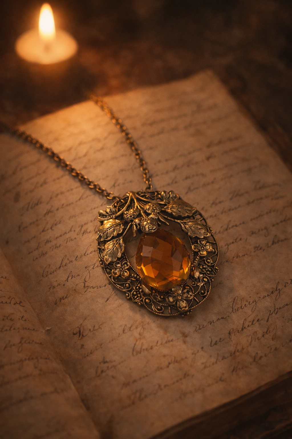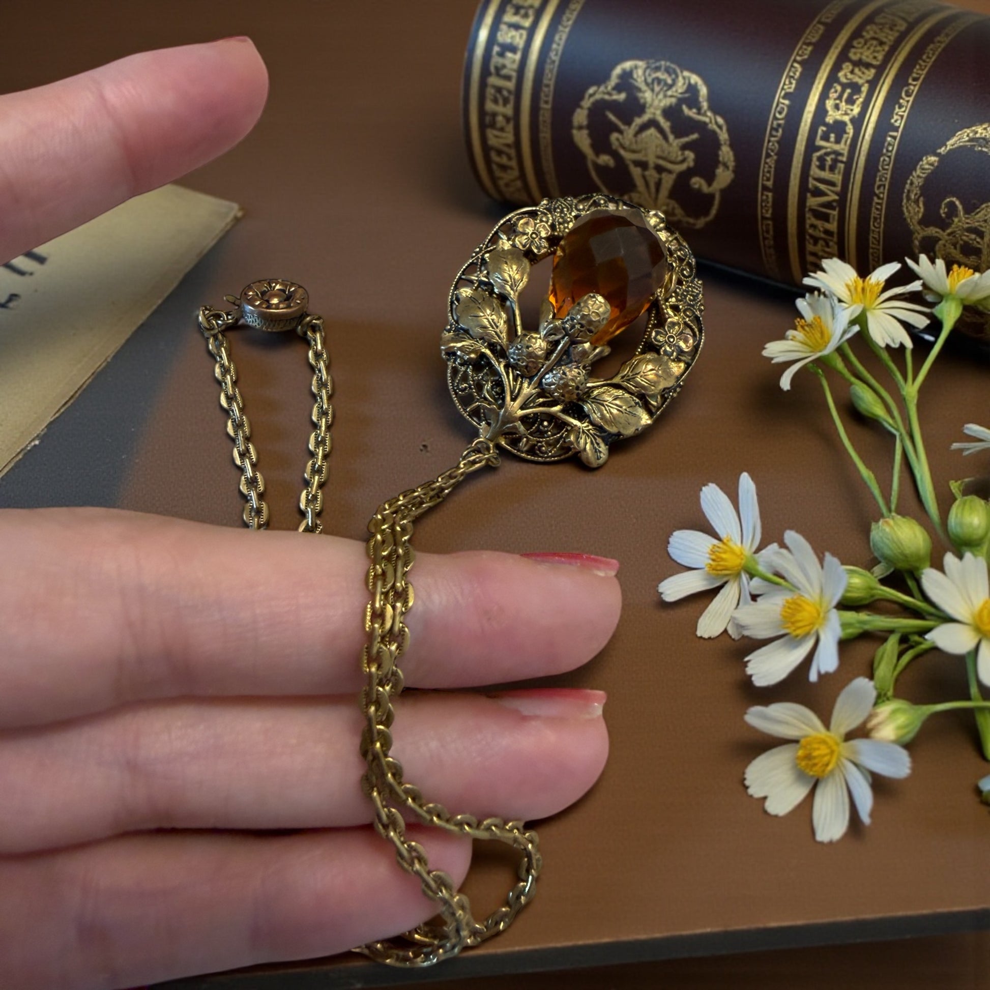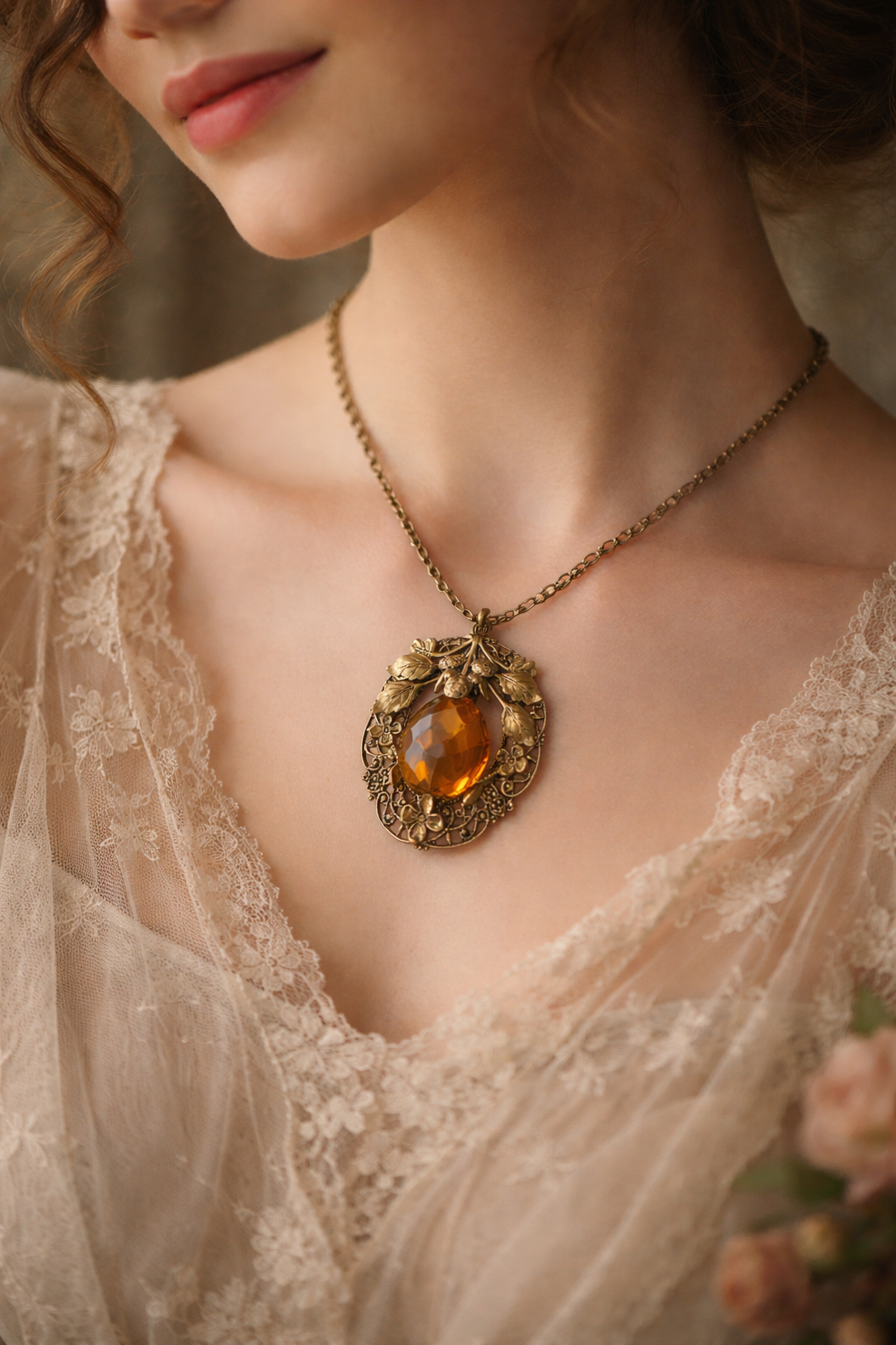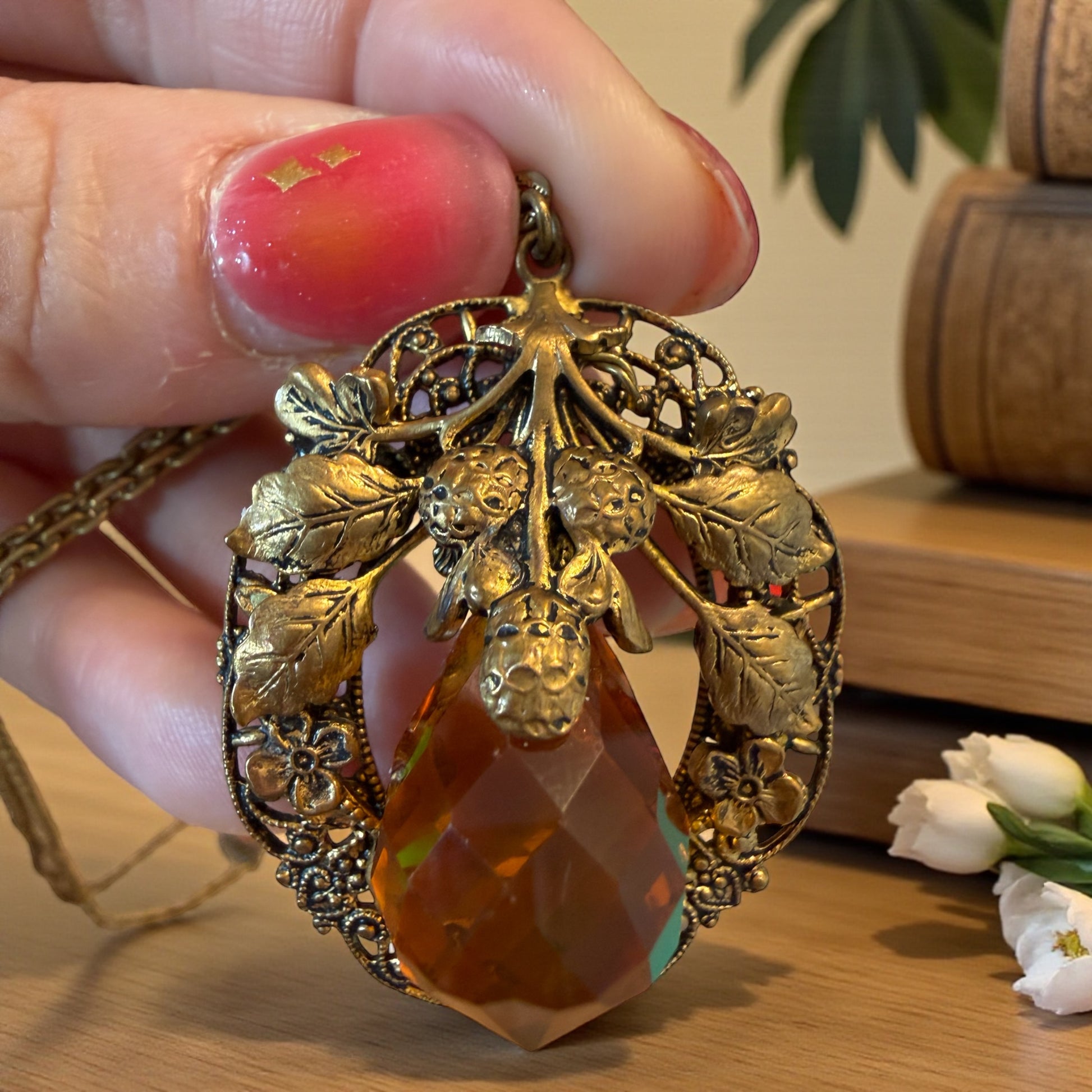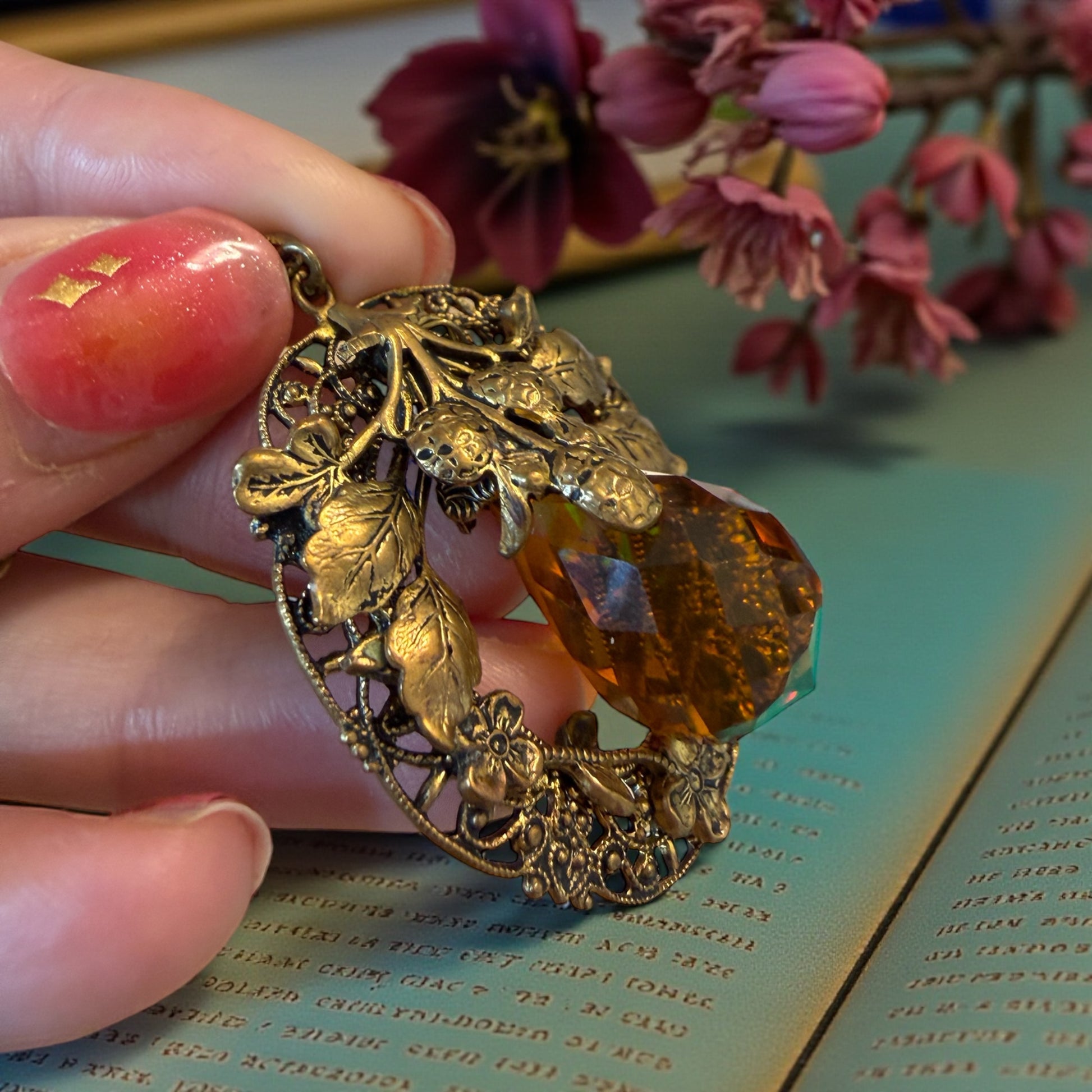 Se lo guardi da vicino, sembra che il ramo abbia trattenuto il respiro fino all’ultimo frutto - e poi lo abbia lasciato andare, maturo, femminile, succoso. Questo pendente Liberty è un piccolo mondo vegetale: foglie, frutti, nervature sottili, tutto scende dall’alto in modo naturale, come in una crescita lenta e silenziosa. E alla fine, sospesa, una goccia color ambra che non è fissata, ma lasciata libera di muoversi, oscillare, riflettere la luce a ogni passo. È proprio questo dettaglio a renderlo vivo: il frutto finale non è bloccato, ma segue il corpo di chi lo indossa, come se fosse ancora parte della pianta. La catena, corta e raffinata, fa sì che il pendente rimanga quasi a girocollo, vicino alla pelle, come un talismano discreto ma presente. Bellissima la chiusura d’epoca a levetta con rosetta superiore.