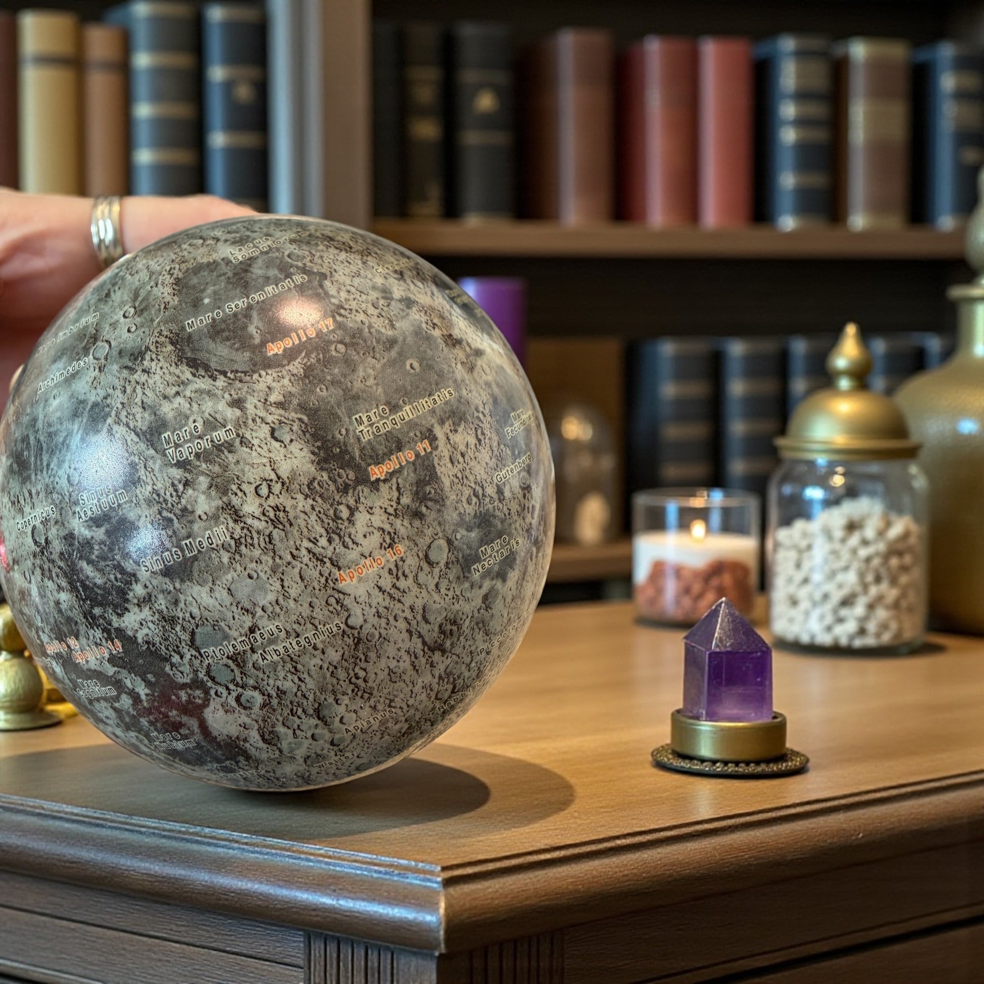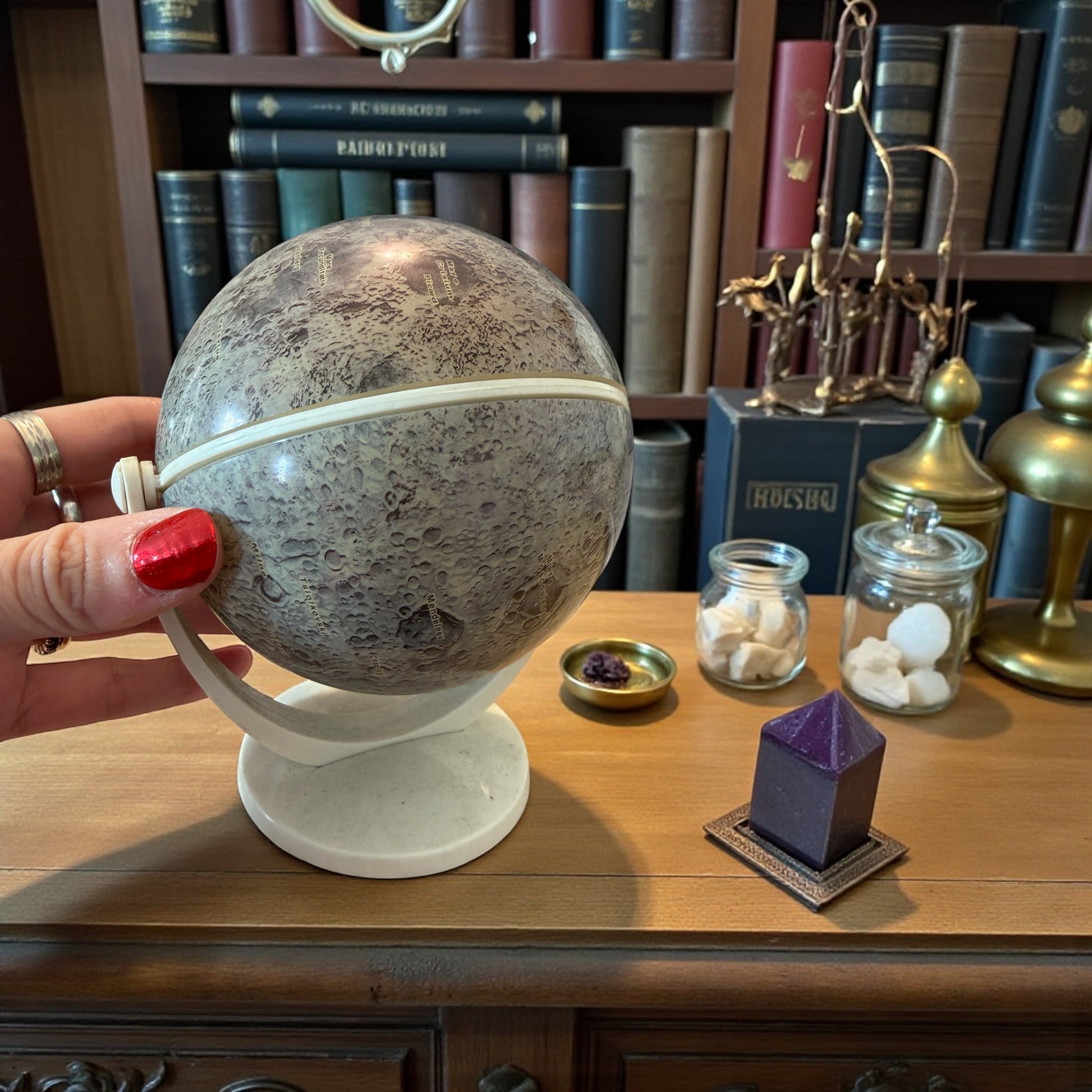 È uno di quegli oggetti che raccontano un’epoca in cui lo spazio non era ancora spettacolo, ma studio. Un mappamondo lunare da scrivania, compatto e solido, che invita a seguire con lo sguardo i crateri, i mari e i nomi delle missioni Apollo, come si faceva prima delle immagini digitali ad alta definizione. La superficie è dettagliata, sobria, scientifica. Nessun effetto scenografico inutile: solo la Luna, osservata con rispetto. La sfera ruota completamente, sia in verticale che in orizzontale, permettendo una lettura continua e naturale, proprio come gli strumenti da studio di una volta. Prodotto nei primissimi anni ’90, quando il marchio CE diventava obbligatorio, questo oggetto conserva ancora quell’equilibrio raro tra funzione educativa e presenza estetica. Sta bene su una scrivania, in una libreria, in uno studio: non invade, accompagna rimandando gentilmente ed elegantemente all’occulto, alla sete di conoscenza, al lato oscuro della luna.