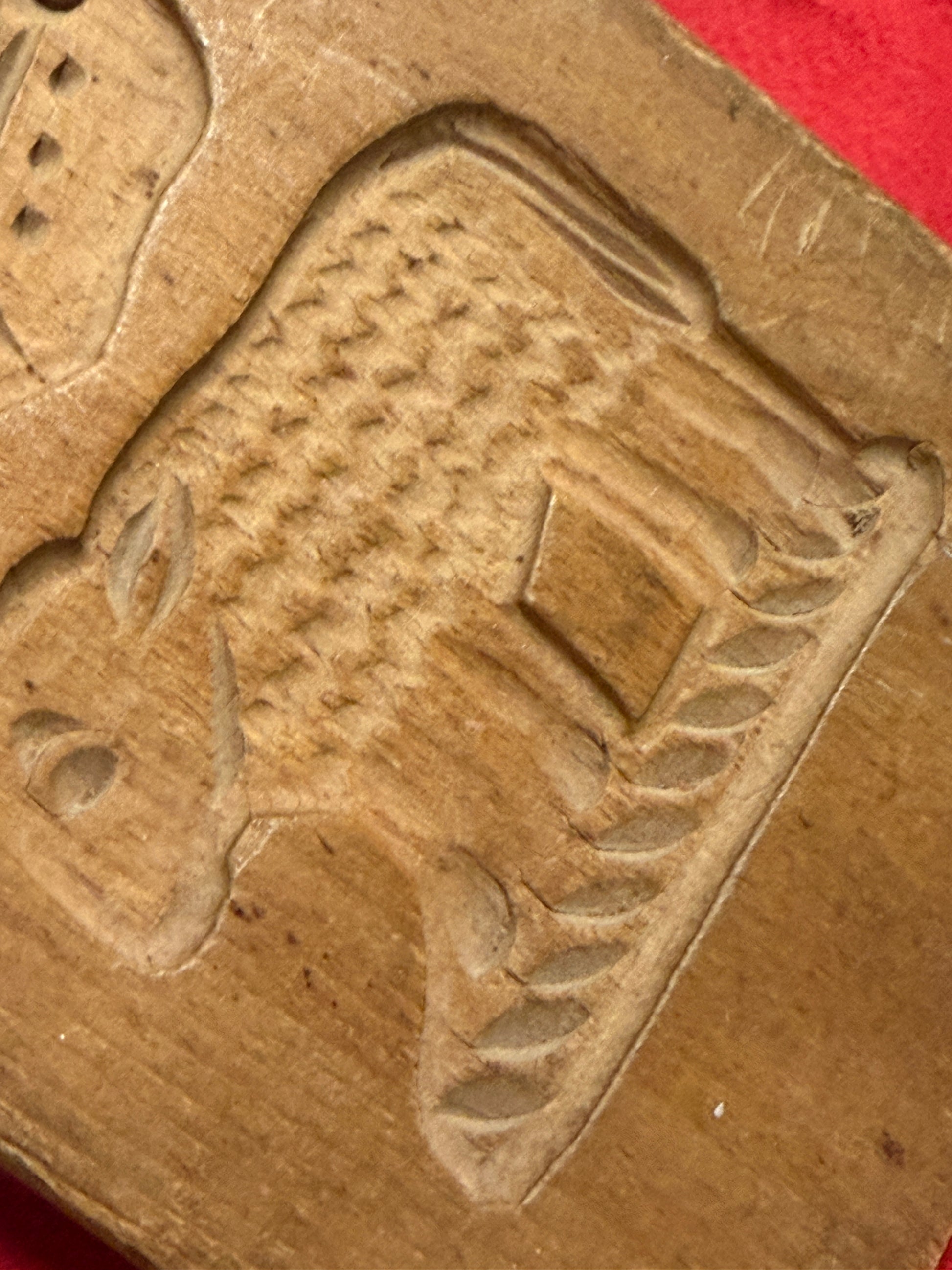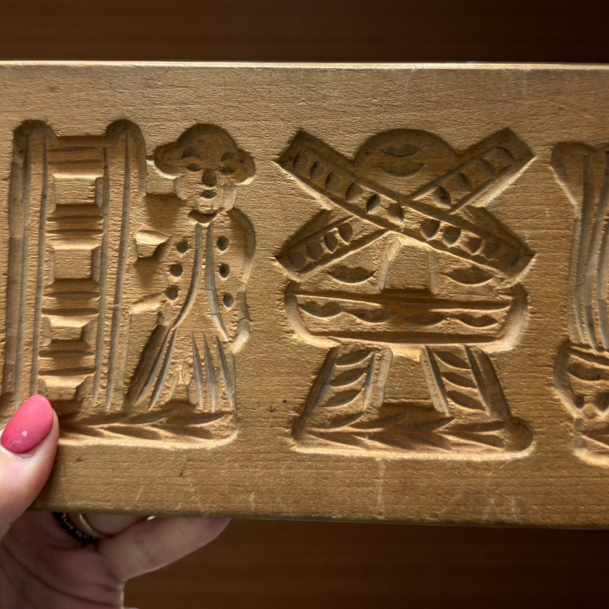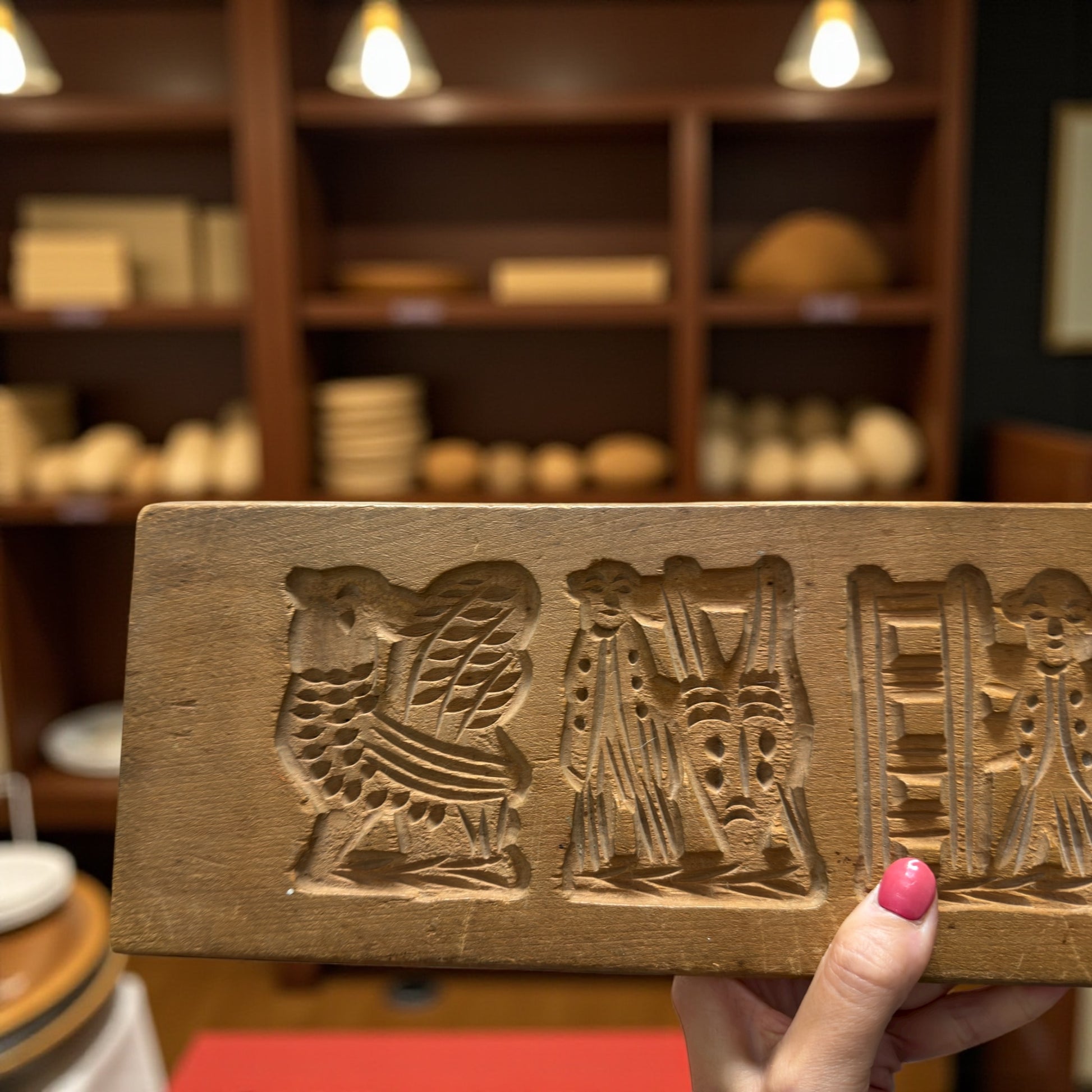 C’è un tempo che sa di miele e cannella, di mani che impastano lente mentre fuori l’aria odora di neve. Questa grande placca in legno di faggio, nata nella prima metà del Novecento nei Paesi Bassi, custodisce le forme antiche dei biscotti speculaas, i dolci che annunciavano le feste. Tra le figure incise — un mulino a vento, animali, uomini in abiti d’un tempo — sembra di vedere ancora i sorrisi riflessi nel vetro delle cucine, quando il profumo del burro caldo riempiva le stanze. Un oggetto che parla piano, come una fiaba che ritorna ogni inverno. Meraviglioso appeso al muro: crea da solo un’atmosfera unica 🌸 Dimensioni: 60,5 x 13 cm. Ganci a tergo già predisposti.