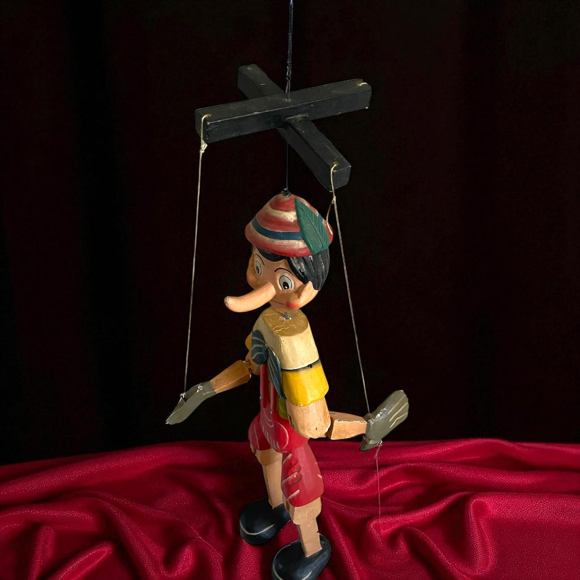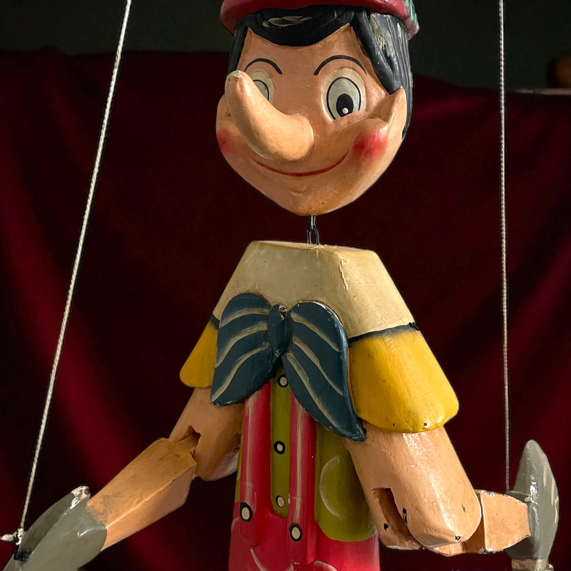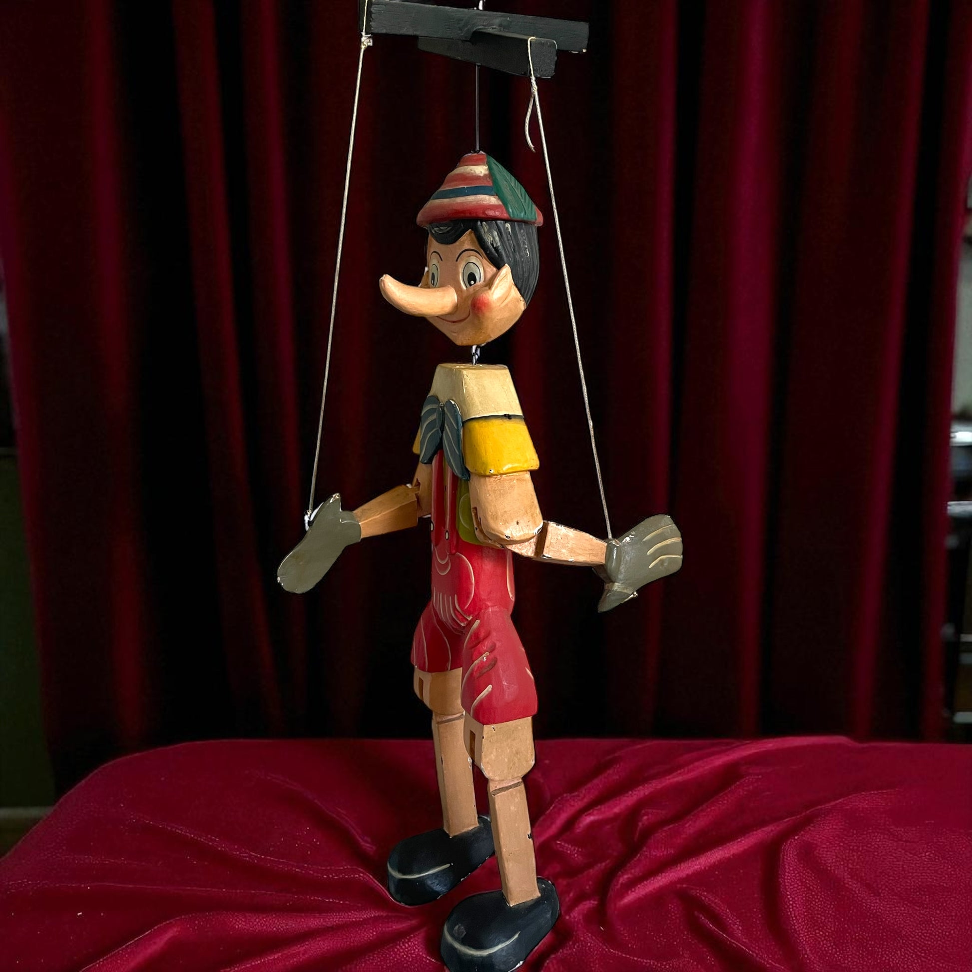 “Ti racconto una bugia?” Appeso a un filo, con lo sguardo furbo e quel naso impertinente, questo grande burattino in legno sembra uscito da una bottega artigiana dove i sogni prendono forma tra trucioli di legno e colori ad olio. Alto ben 70 cm, questo Pinocchio non è un giocattolo qualunque: è un piccolo attore pronto a incantare chi lo guarda. Le sue mani larghe, i pantaloni rossi dipinti con grazia infantile, il cappello a righe con la fogliolina verde, tutto in lui racconta la meraviglia dell’infanzia e il fascino del teatro delle marionette. Segni di vita vissuta ne impreziosiscono l’espressione: piccole abrasioni sulla vernice, un tocco di usura che parla di mani che lo hanno fatto danzare, forse per raccontare una bugia… o forse no.