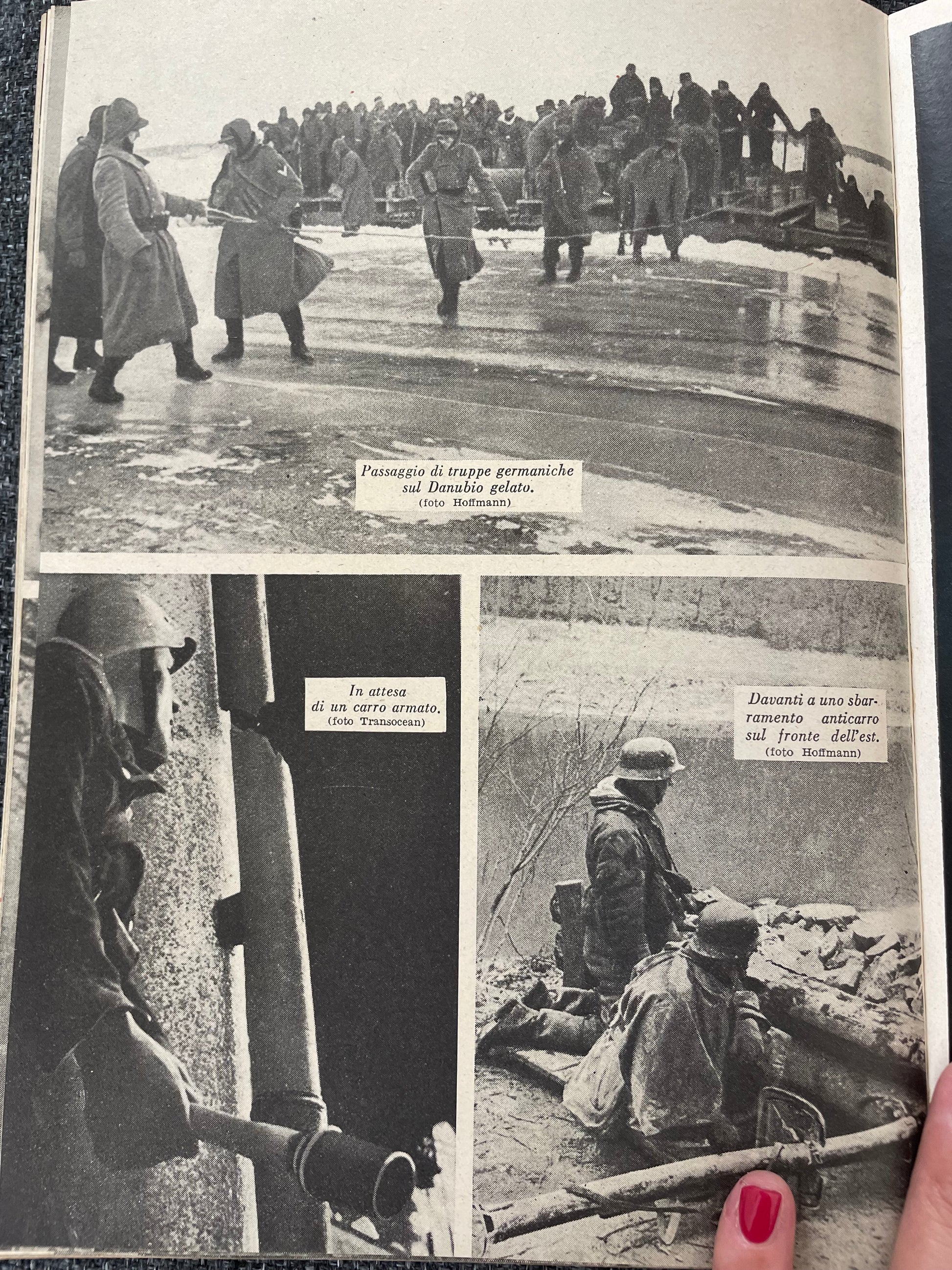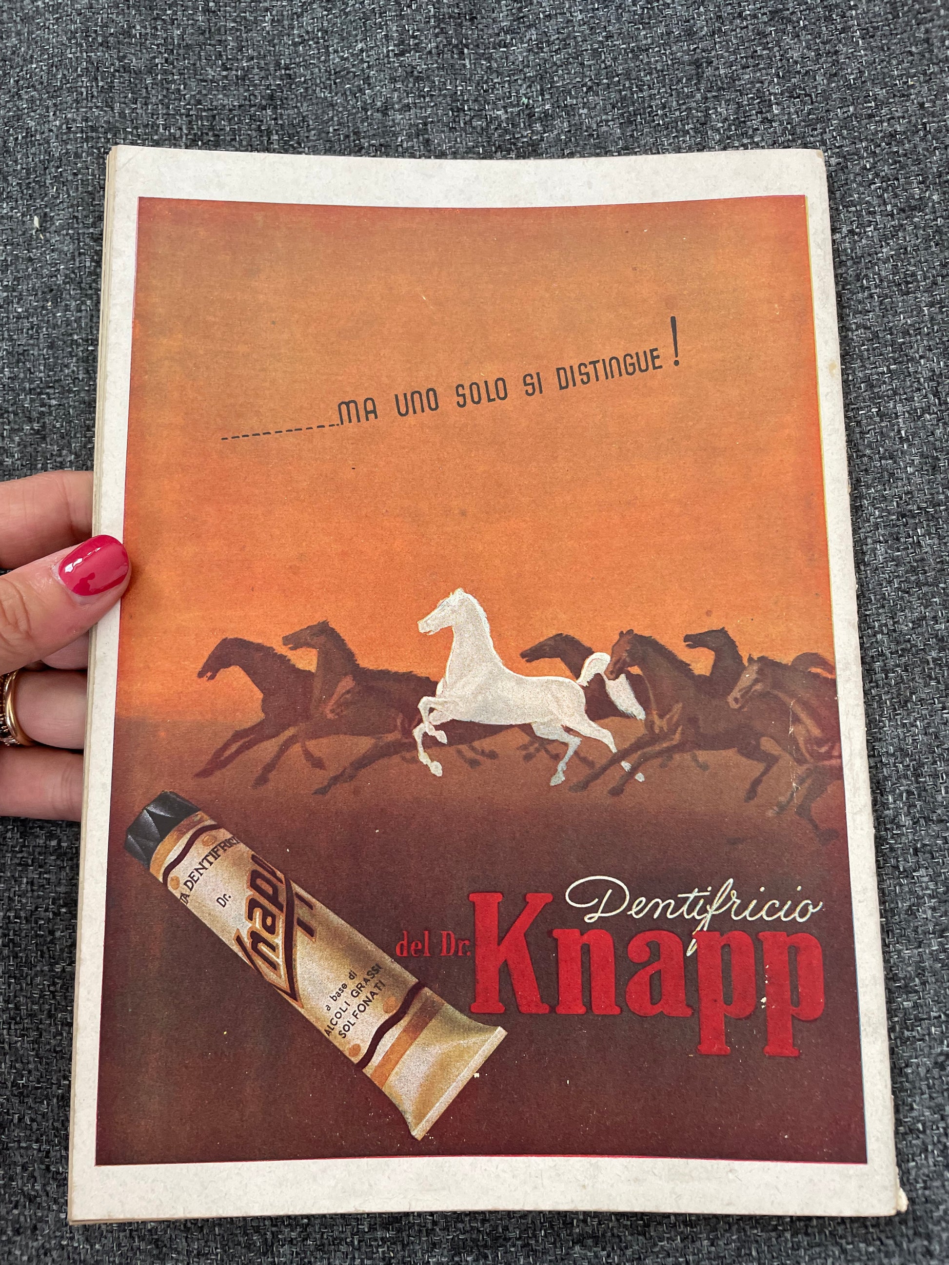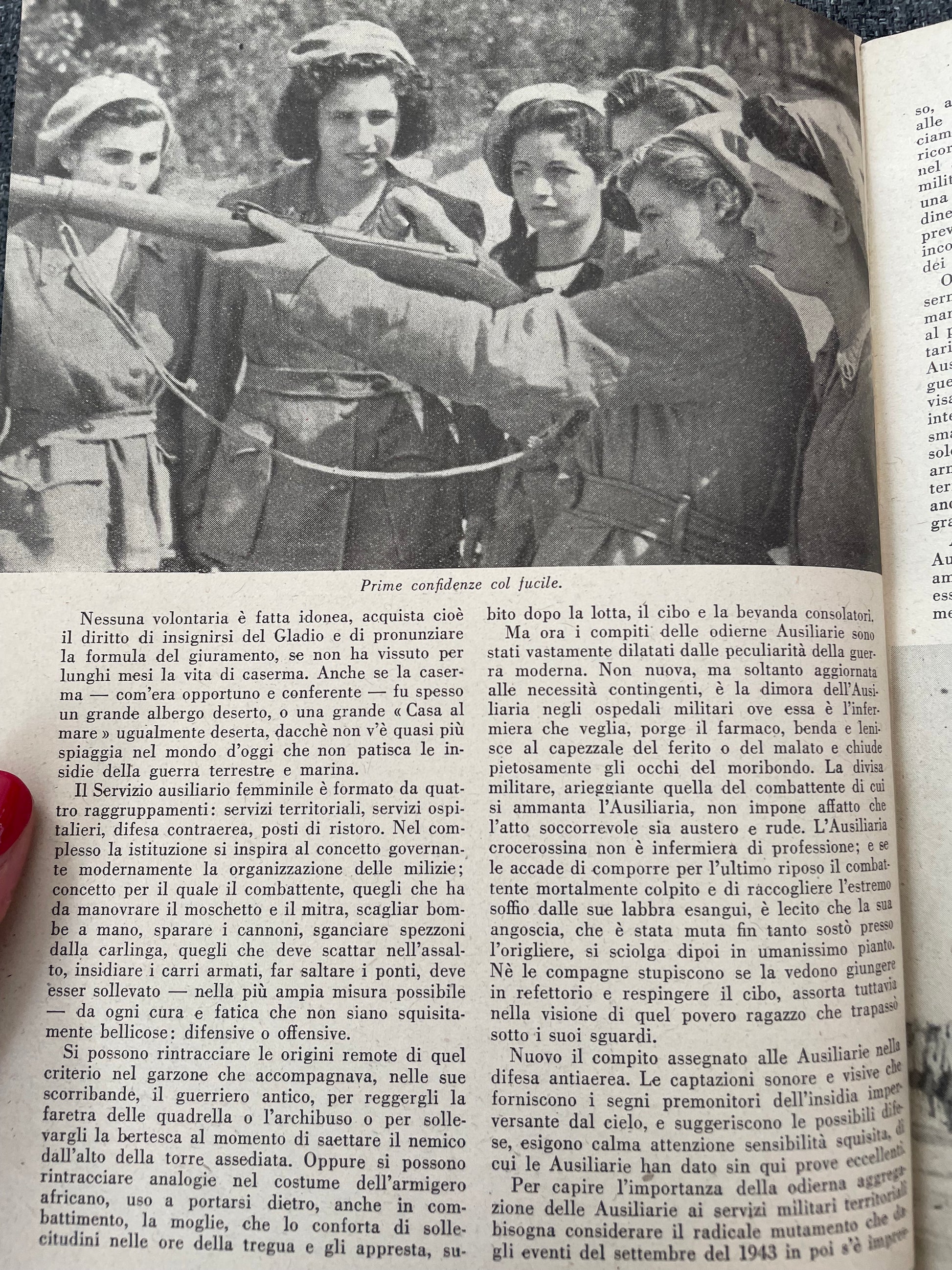 Questo fascicolo documenta un momento cruciale della propaganda e del costume italiano. Gli articoli dedicati alle Ausiliarie, le donne inquadrate nei servizi militari della RSI, raccontano la partecipazione femminile alla guerra con un tono marziale e retorico, tipico della narrazione di fine conflitto. Le fotografie mostrano sfilate, addestramenti e momenti di vita quotidiana delle Ausiliarie, immortalando la tensione tra dovere patriottico e identità femminile. Accanto ai contenuti politici e bellici, emergono anche pubblicità d’epoca straordinarie — come quelle dei dentifrici Jodont e Dr. Knapp, o dei cosmetici Klytia — che restituiscono l’immaginario estetico e commerciale degli anni ’40, unendo eleganza, ottimismo forzato e desiderio di normalità in un Paese distrutto dalla guerra. C’è un silenzio sospeso tra le pagine di questa rivista del 1945. Ogni immagine, ogni parola, porta il peso di un Paese in bilico tra il crollo e la speranza. “La Lettura” di febbraio racconta non solo la guerra, ma la vita che cercava di continuare accanto ad essa: toni solenni che nascondono la paura. Sfogliare questo fascicolo significa toccare con mano l’ultima eco di un’epoca, il tentativo di resistere alla dissoluzione attraverso la parola, l’immagine, l’illusione.