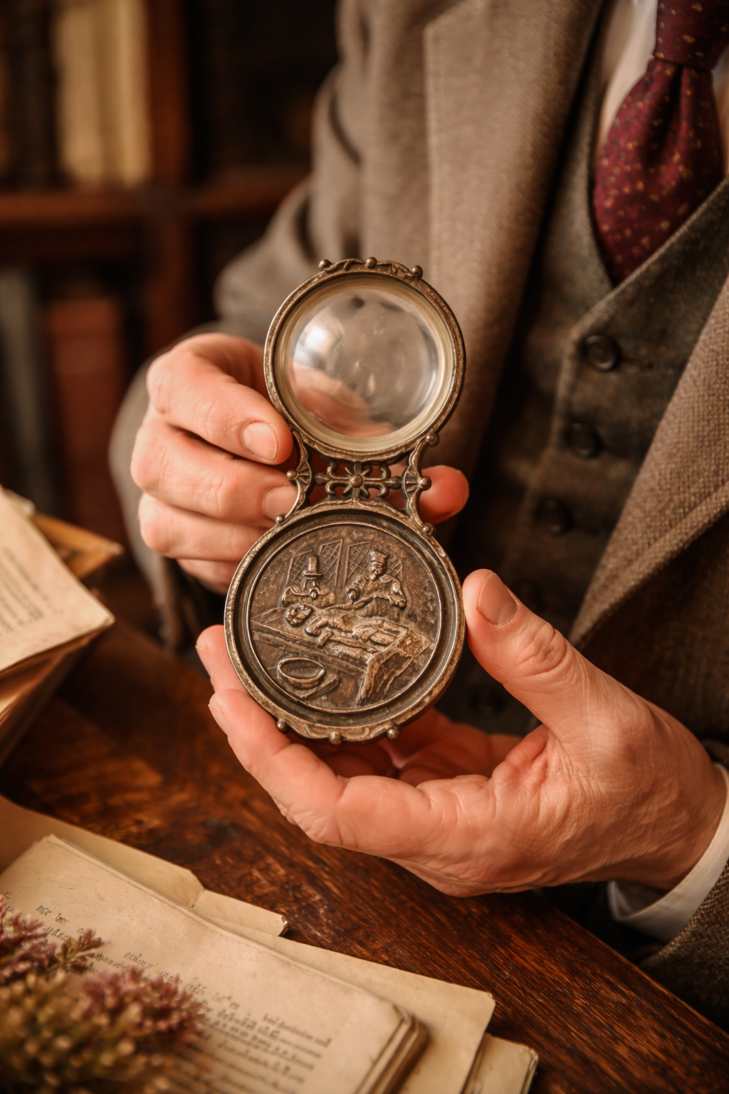 Contemplarla è come assistere a una lezione silenziosa, dove il sapere passa attraverso il corpo e lo sguardo. Questa lente di ingrandimento sembra appartenere a uno scrittoio ottocentesco, forse quello di un medico o di uno studioso, uno di quelli che leggevano lentamente e osservavano a lungo. Sullo sportello inferiore, una scena di anatomia in rilievo: un corpo disteso, il gesto preciso del medico, l’assistente che osserva. Non c’è crudezza, ma concentrazione. È il momento in cui il sapere si fa gesto. La lente in vetro è limpida, pronta a tornare a servire. La montatura in metallo e celluloide, con la sua patina vissuta, racconta il tempo senza bisogno di parole. È un oggetto che invita a fermarsi, ad avvicinare il testo, a guardare meglio. E mentre lo si fa, ci si accorge che anche l’oggetto, a sua volta, ci sta osservando.