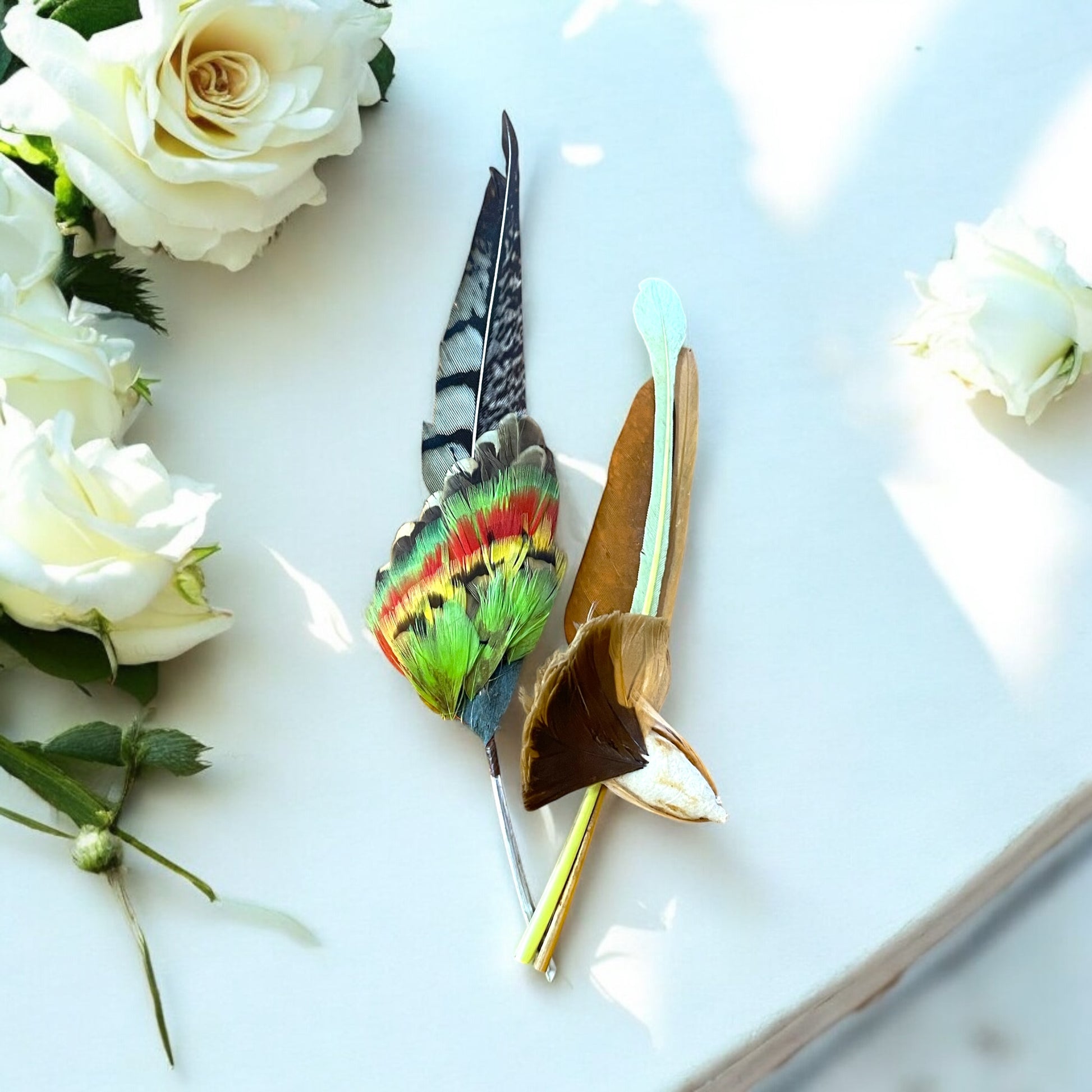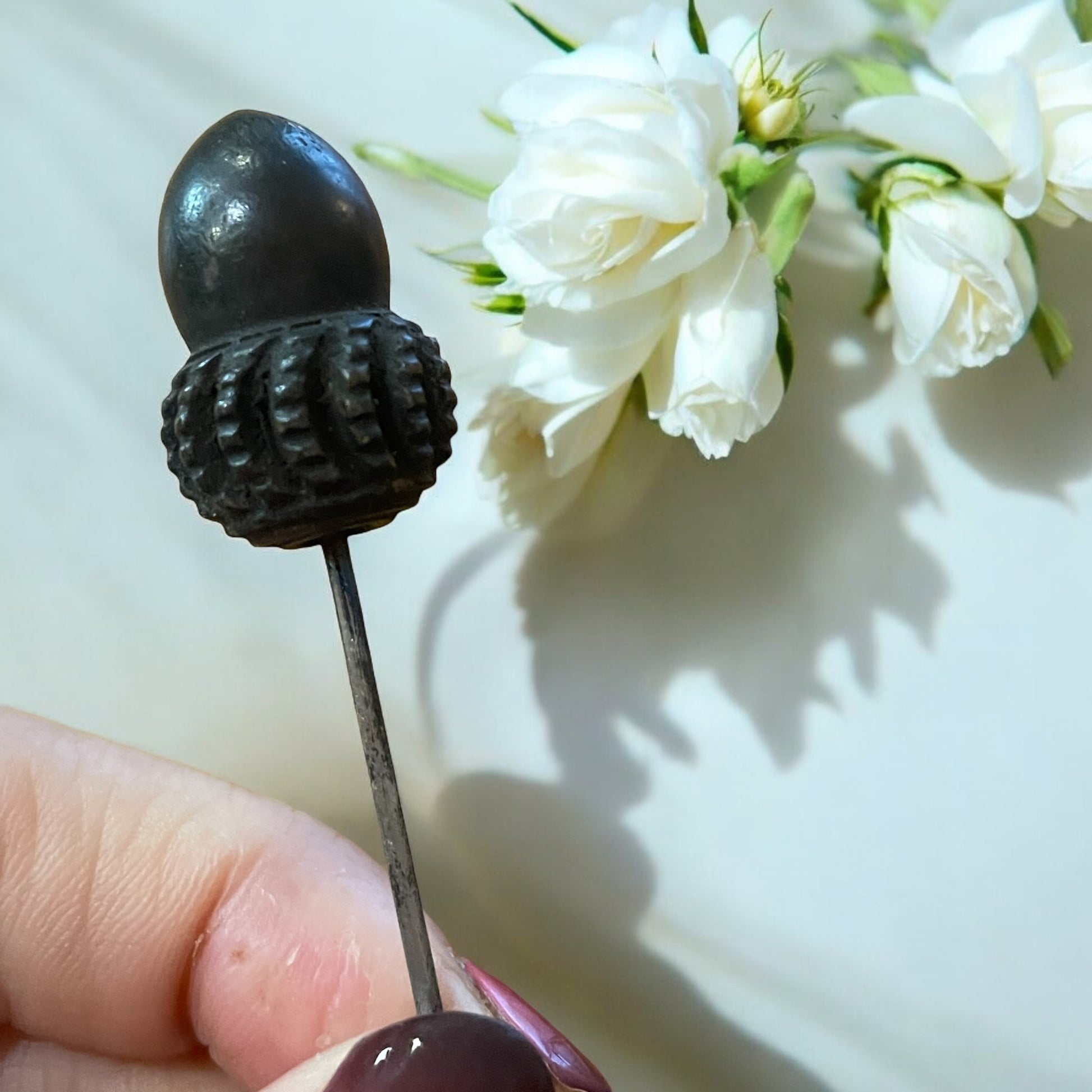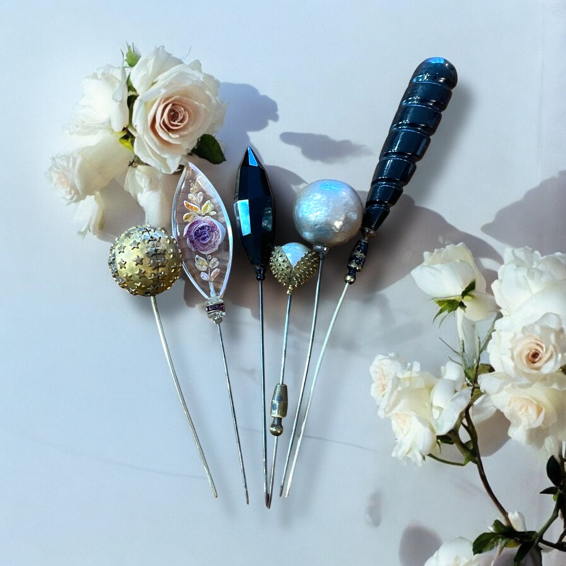 C’è una boutique nascosta tra le strade acciottolate del Marais, lontano dalle vetrine scintillanti, dove il tempo si è infilato nei cassetti e ha lasciato le sue tracce tra velluti, piume e spille È lì, in un angolo silenzioso e pieno di memoria, che si nascondeva questa collezione. Una piccola eredità silenziosa, proveniente da una costumista francese attiva tra i teatri e le maisons di moda di Parigi, tra la fine dell’Ottocento e gli anni Cinquanta del Novecento. Gli spilloni lunghi, dal fusto slanciato e dalle teste scolpite, per i cappelli ampi e strutturati del periodo vittoriano ed edoardiano (circa 1890-1910). Alcuni in guttaperca nera o bachelite — materiali tipici dell’epoca — altri con elementi in celluloide ed ottone e motivi floreali e geometrici. Le piume, invece, sono il respiro del tempo leggero. Una composizione vivace, con toni verdi e rossi, sembra danzare ancora sulle note di un grammofono nel cuore degli anni Venti: un’epoca Art Déco. L’altra, più naturale, in toni bruni e crema, richiama le mode della Belle Époque. Poi ci sono gli spilloni più corti, più gioiello che accessorio. Alcuni presentano sfere traforate, altri sfere sintetiche, vetro, resine decorate. Spicca uno spillone con una foglia trasparente che racchiude un fiore: siamo arrivati agli anni ‘50. C’è una testa quadrata nera, con fregi incisi su ogni lato e un fusto ritorto: un oggetto dalla linea decisa, dal sapore maschile, che potremmo collocare tra anni ’30 e ’40, quando lo stile diventava più sobrio. In totale sono 20, per 20 sogni diversi. Alcuni hanno qualche segno del tempo, non impattante, le sotto dovrebbero mostrare tutto.