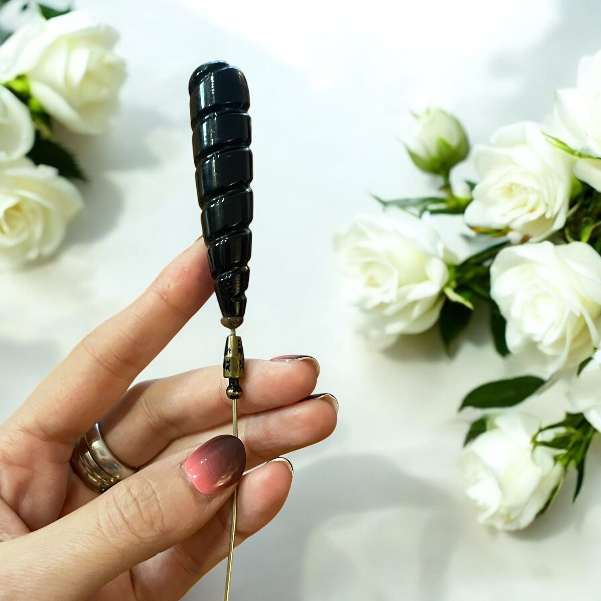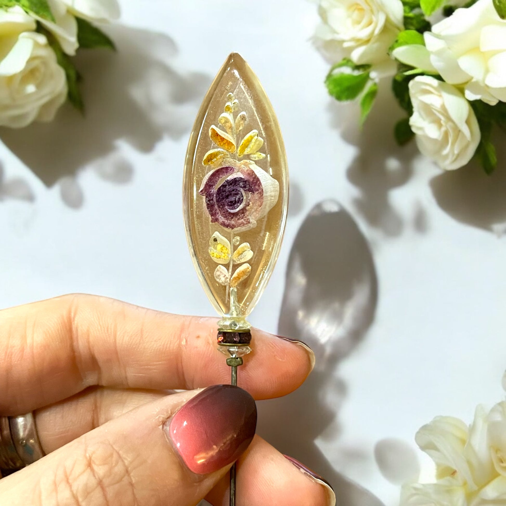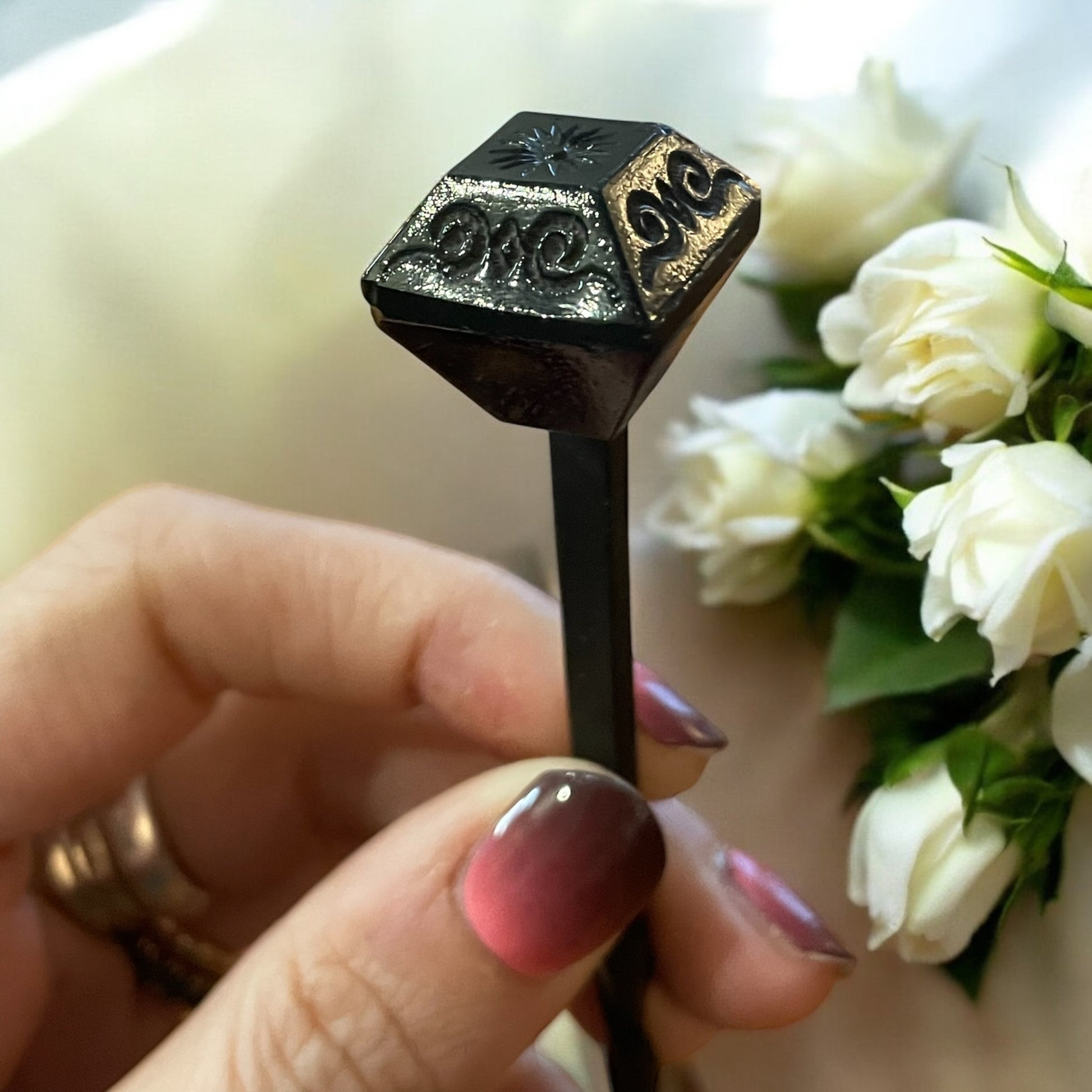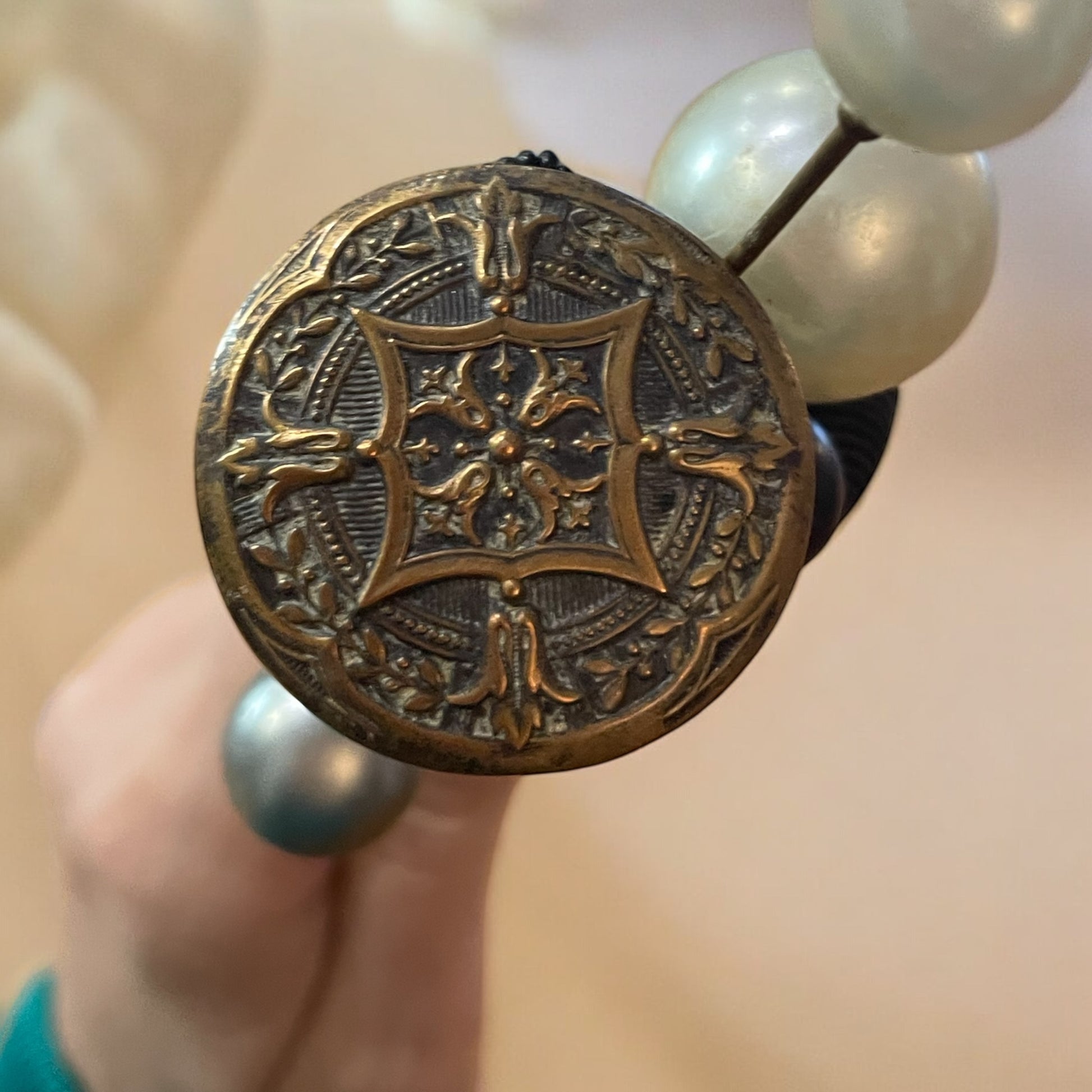 C’è una boutique nascosta tra le strade acciottolate del Marais, lontano dalle vetrine scintillanti, dove il tempo si è infilato nei cassetti e ha lasciato le sue tracce tra velluti, piume e spille È lì, in un angolo silenzioso e pieno di memoria, che si nascondeva questa collezione. Una piccola eredità silenziosa, proveniente da una costumista francese attiva tra i teatri e le maisons di moda di Parigi, tra la fine dell’Ottocento e gli anni Cinquanta del Novecento. Gli spilloni lunghi, dal fusto slanciato e dalle teste scolpite, per i cappelli ampi e strutturati del periodo vittoriano ed edoardiano (circa 1890-1910). Alcuni in guttaperca nera o bachelite — materiali tipici dell’epoca — altri con elementi in celluloide ed ottone e motivi floreali e geometrici. Le piume, invece, sono il respiro del tempo leggero. Una composizione vivace, con toni verdi e rossi, sembra danzare ancora sulle note di un grammofono nel cuore degli anni Venti: un’epoca Art Déco. L’altra, più naturale, in toni bruni e crema, richiama le mode della Belle Époque. Poi ci sono gli spilloni più corti, più gioiello che accessorio. Alcuni presentano sfere traforate, altri sfere sintetiche, vetro, resine decorate. Spicca uno spillone con una foglia trasparente che racchiude un fiore: siamo arrivati agli anni ‘50. C’è una testa quadrata nera, con fregi incisi su ogni lato e un fusto ritorto: un oggetto dalla linea decisa, dal sapore maschile, che potremmo collocare tra anni ’30 e ’40, quando lo stile diventava più sobrio. In totale sono 20, per 20 sogni diversi. Alcuni hanno qualche segno del tempo, non impattante, le sotto dovrebbero mostrare tutto.