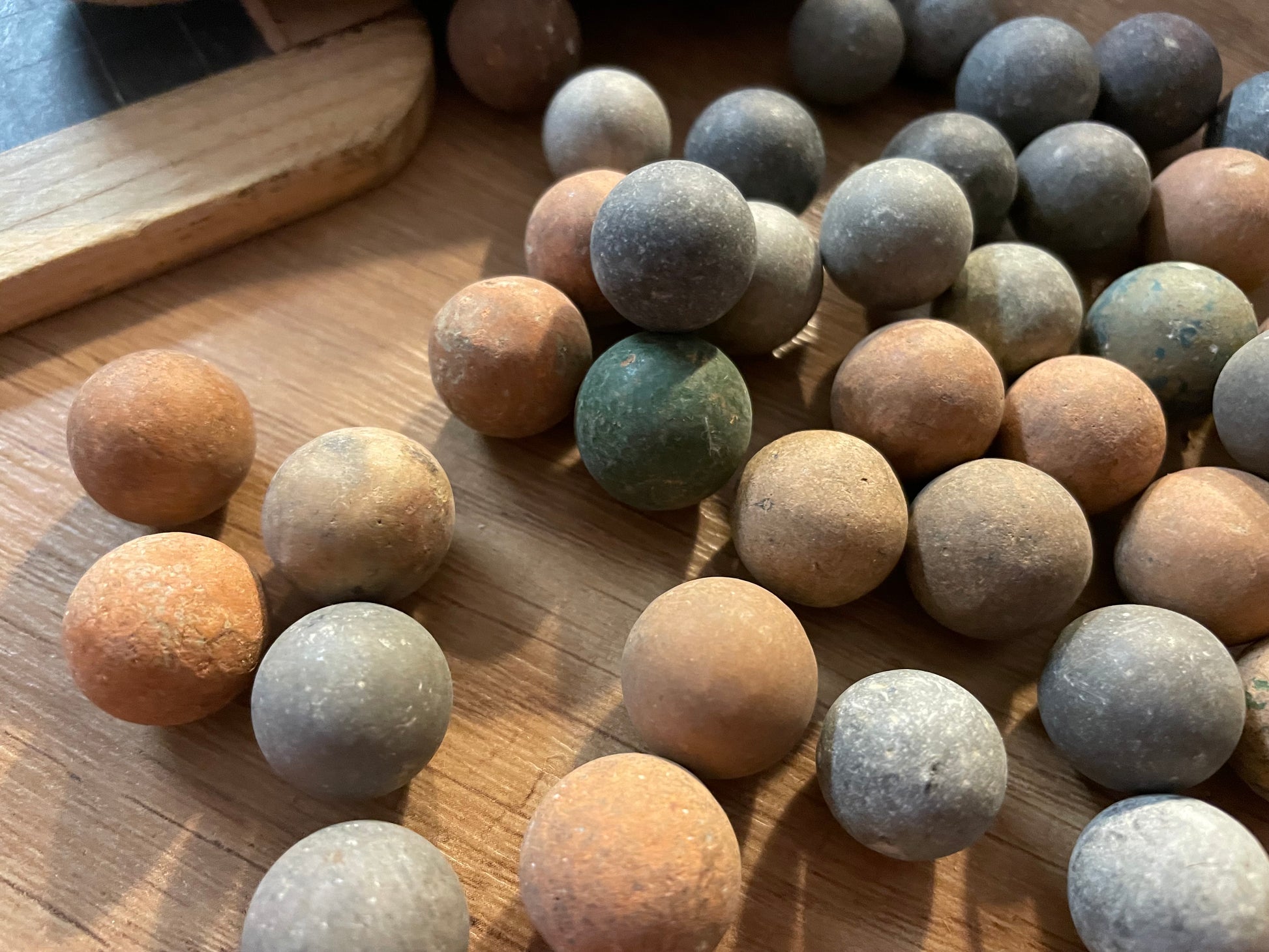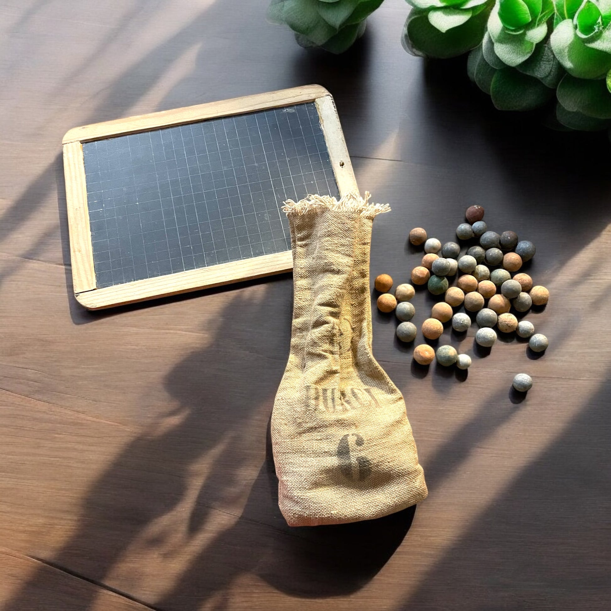 Lotto biglie anni ‘30 in sacchetto di iuta e ardesia lavagnetta