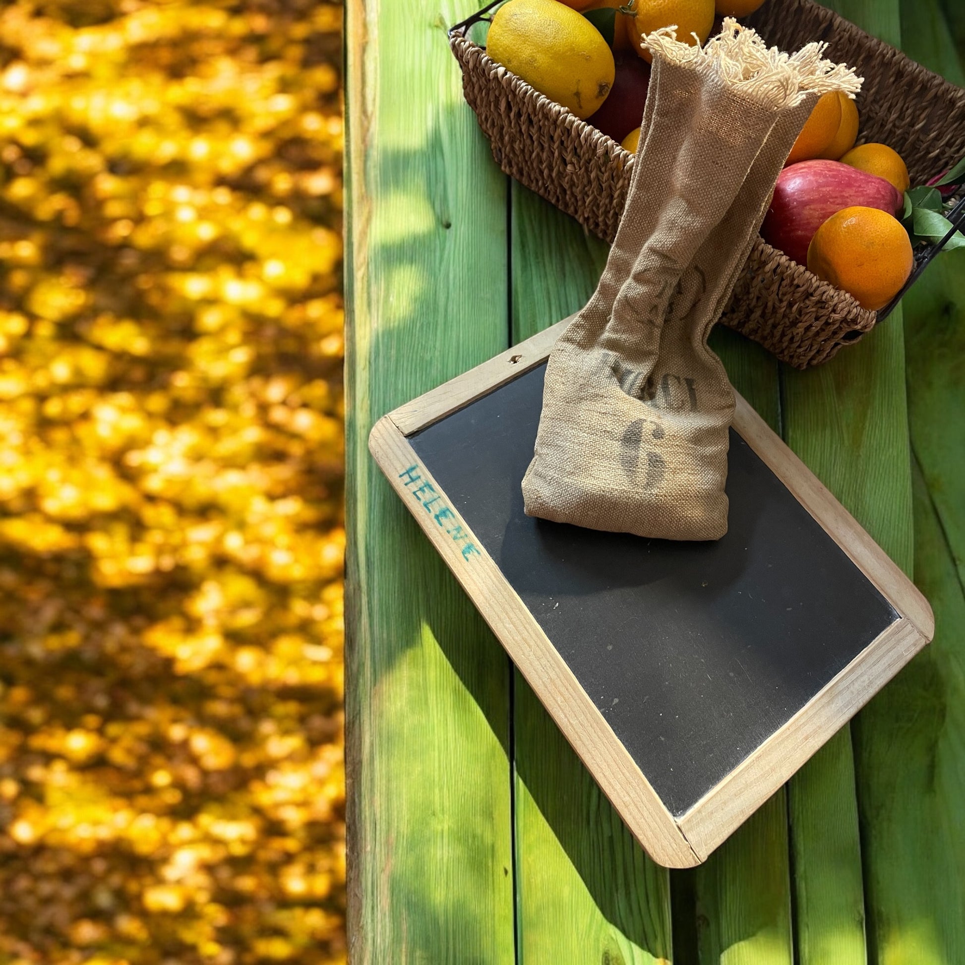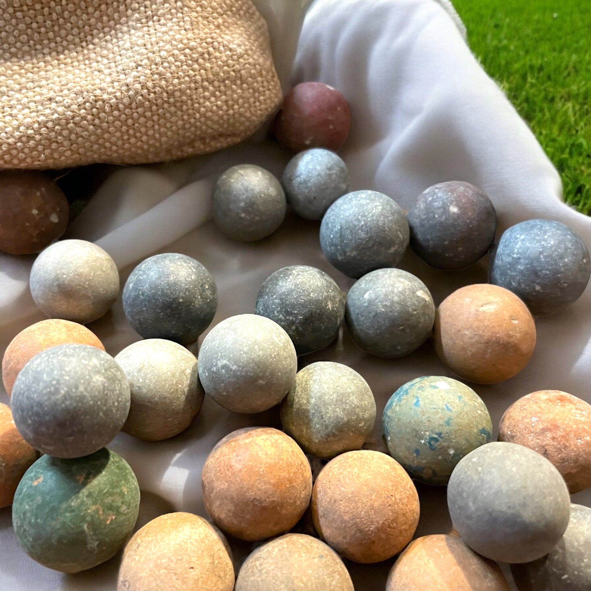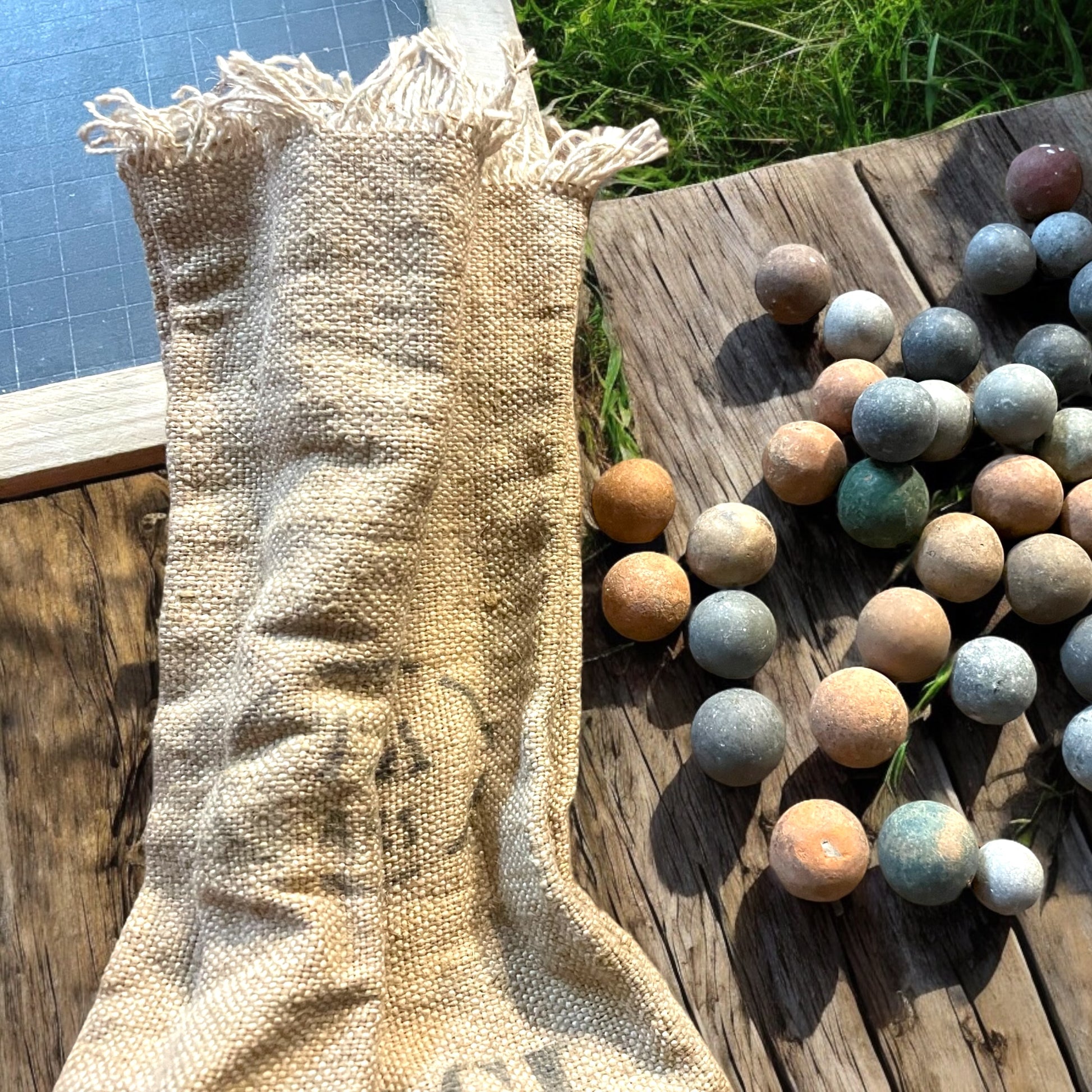 Nascosto in un vecchio baule, polveroso e dimenticato, ho trovato questo antico sacchetto di iuta, sbiadito dal tempo e consumato dalla storia. All’interno, un tesoro di biglie colorate, ognuna con una sua sfumatura unica, ormai segnata dagli anni. Immagino le risate di una bimba degli anni ‘30, intenta a sfidare le amiche in giochi spensierati sul selciato di un cortile polveroso. Le mani piccole che le stringevano, il suono delle biglie che rotolavano a terra, e la luce dorata di un pomeriggio estivo che illuminava quei momenti di pura gioia e meraviglia infantile. Un frammento di un mondo lontano che oggi ritrova la luce, raccontando una storia di giochi dimenticati e di sorrisi passati. Insieme, anche se appartenente ad un’altra epoca, omaggiamo la piccola ardesia trovata nella stessa casa - sulla quale un piccola Helène, negli anni ‘50, ha voluto apporre il suo nome.