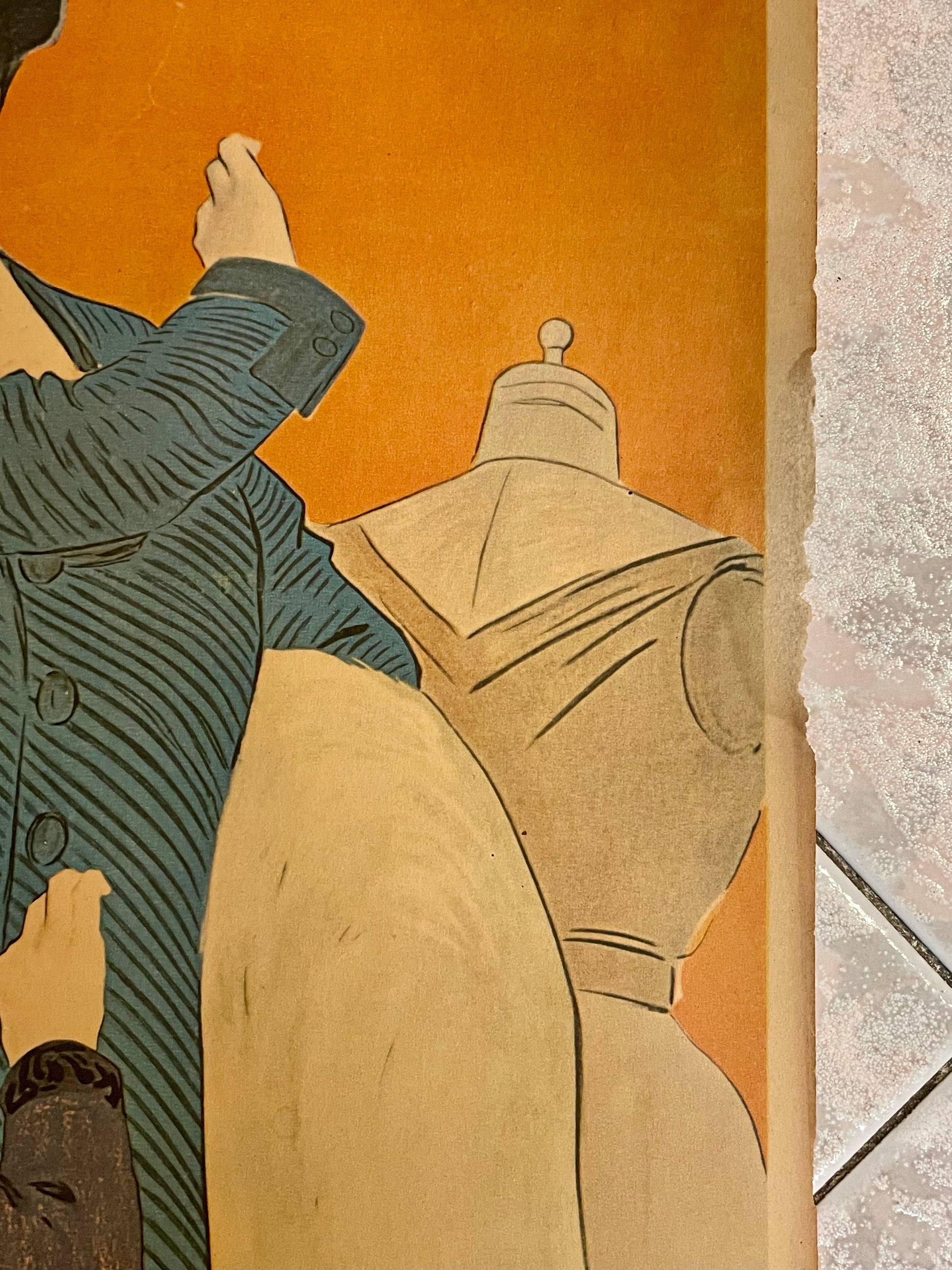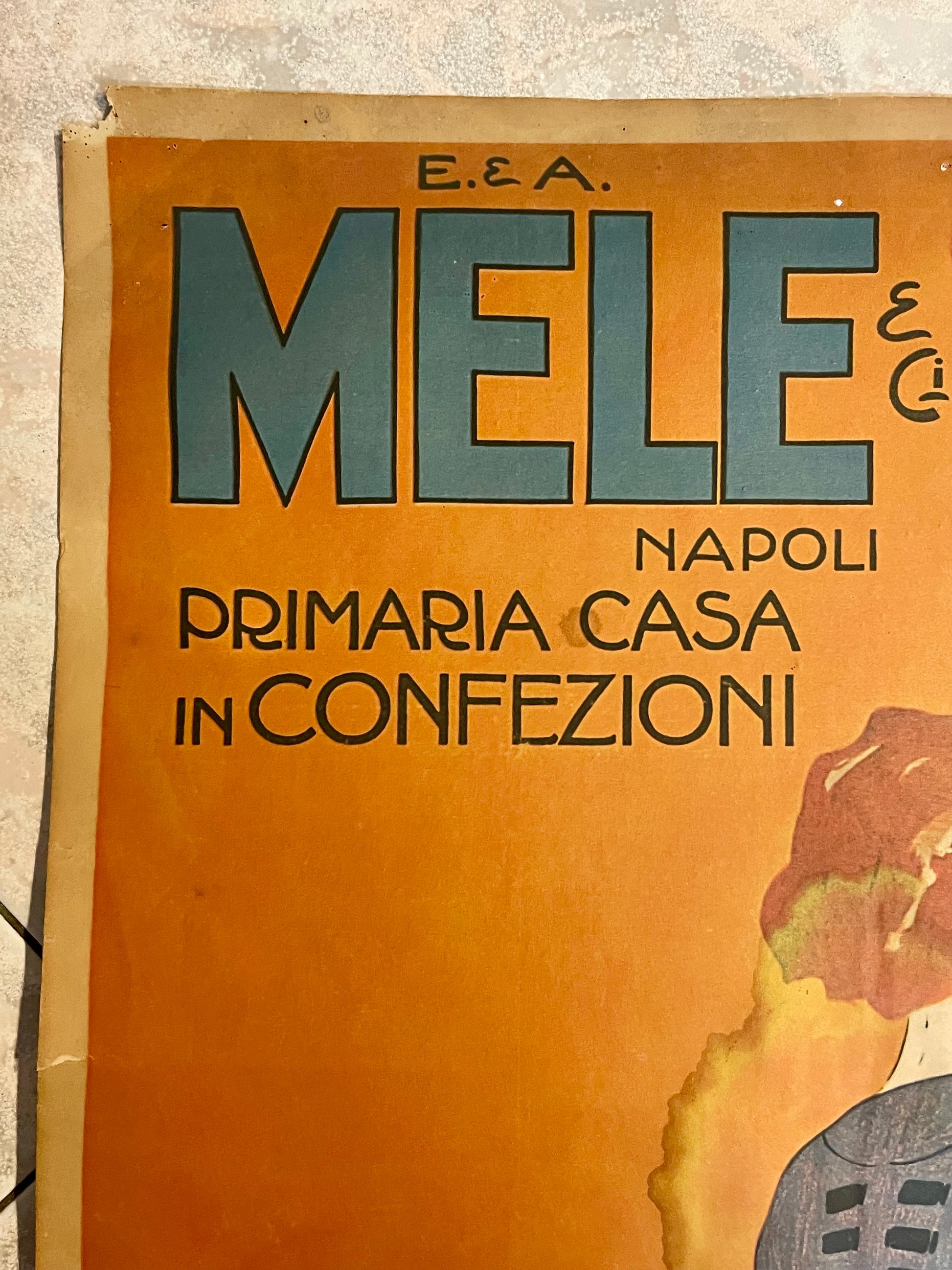 Questo manifesto è la riedizione del 1970 (allegato al numero 1522 del settimanale Grazia, datato 13 aprile 1970) di una delle celebri locandine pubblicitarie della ditta E. & A. Mele & C. di Napoli, realizzate all’inizio del Novecento. Le “Mele” furono tra le prime case italiane a comprendere il potere del manifesto come strumento di comunicazione visiva: i loro cartelloni, ispirati all’eleganza parigina e realizzati da artisti di fama internazionale come Marcello Dudovich, Leopoldo Metlicovitz e Giovanni Maria Mataloni, rappresentarono un punto d’incontro tra arte e pubblicità, anticipando la moderna grafica di moda. La scena raffigura una modista intenta a sistemare un abito su una cliente, in un gioco di sguardi e gesti misurati che restituisce tutta la grazia e la raffinatezza dell’epoca. I colori caldi dell’arancio e del bruno contrastano con il blu profondo del cappotto, mentre la linea sinuosa e il tratto elegante richiamano pienamente lo stile Liberty italiano. Il motto “Massimo buon mercato” sottolinea il messaggio borghese e moderno di un’eleganza accessibile, destinata non più solo all’élite ma a una nuova classe urbana desiderosa di bellezza e distinzione. Venduto senza cornice, spedito in tubo professionale.