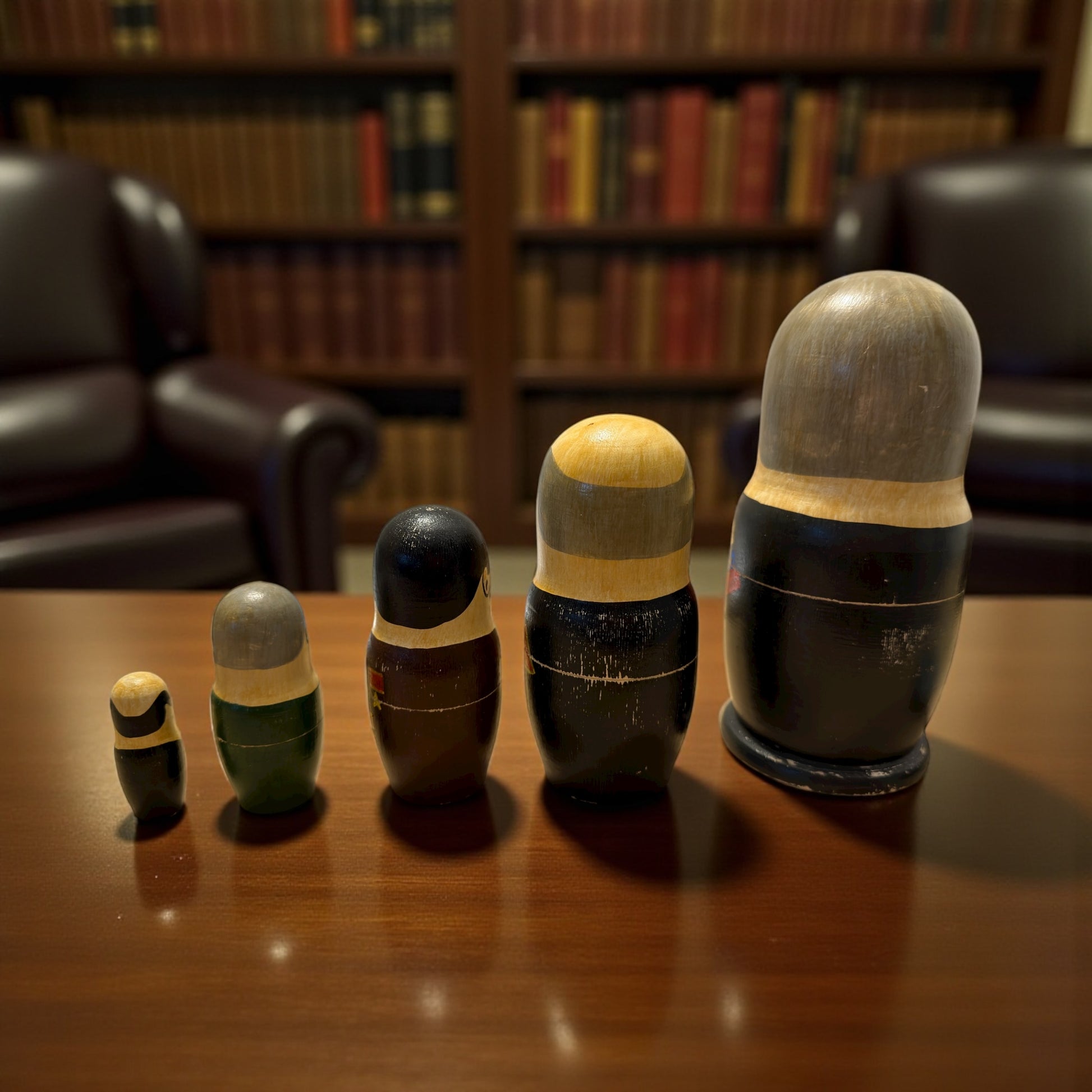 In questo piccolo corteo di legno, scolpito e dipinto a mano nel 1992, la storia di un intero secolo si svela in successione, come un racconto che si apre strato dopo strato. Ogni figura racchiude la successiva, come se il tempo stesso fosse racchiuso dentro la memoria di chi lo ha preceduto. In superficie, Boris Eltsin — primo presidente della nuova Federazione Russa — sorregge sulle proprie spalle l’eredità di un impero appena dissolto. Appena sotto, Michail Gorbaciov, con il segno inconfondibile sulla fronte, rappresenta la perestrojka e l’ultimo tentativo di umanizzare il colosso sovietico. Segue Leonid Brežnev, il volto dell’epoca della stabilità e della stagnazione, con le sue sopracciglia scolpite e la divisa elegante che tradisce la burocrazia di un sistema ormai esausto. Poi Iosif Stalin, in uniforme militare, simbolo di ferro e di terrore, la potenza e il controllo assoluto. Infine, al centro più profondo, Vladimir Lenin, il nucleo originario: l’idea, il fuoco, la scintilla che accese la rivoluzione del 1917. Cinque figure, un secolo di potere e ideologia racchiuso in un gesto antico: aprire una matrioska e trovarne un’altra, fino a raggiungere l’essenza. Un’opera che racconta la Russia come un racconto concentricamente inciso nel legno, tra memoria, ironia e destino.