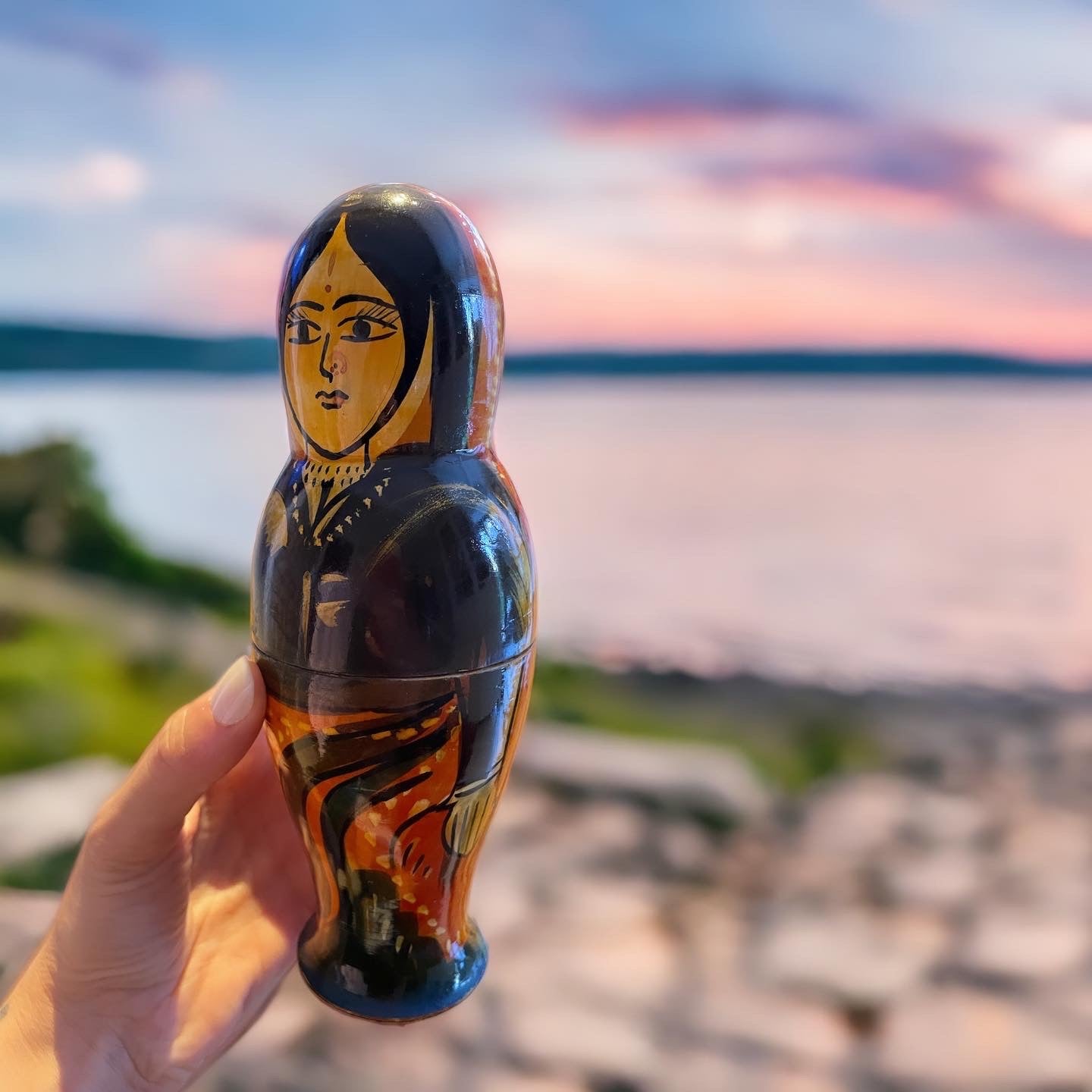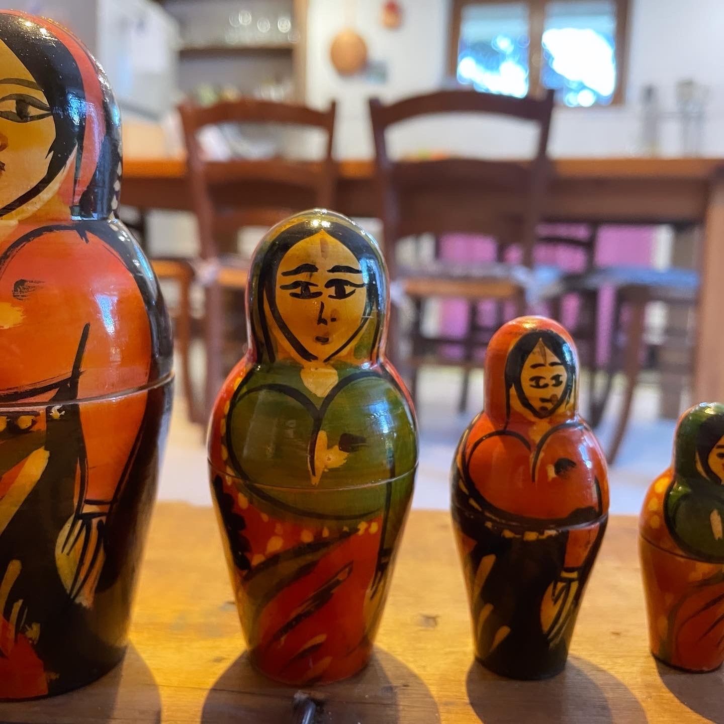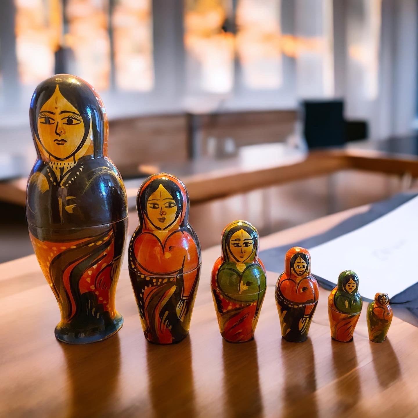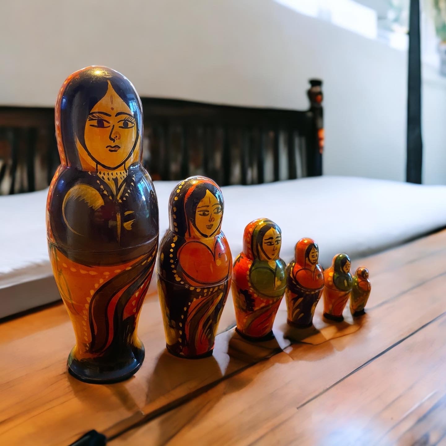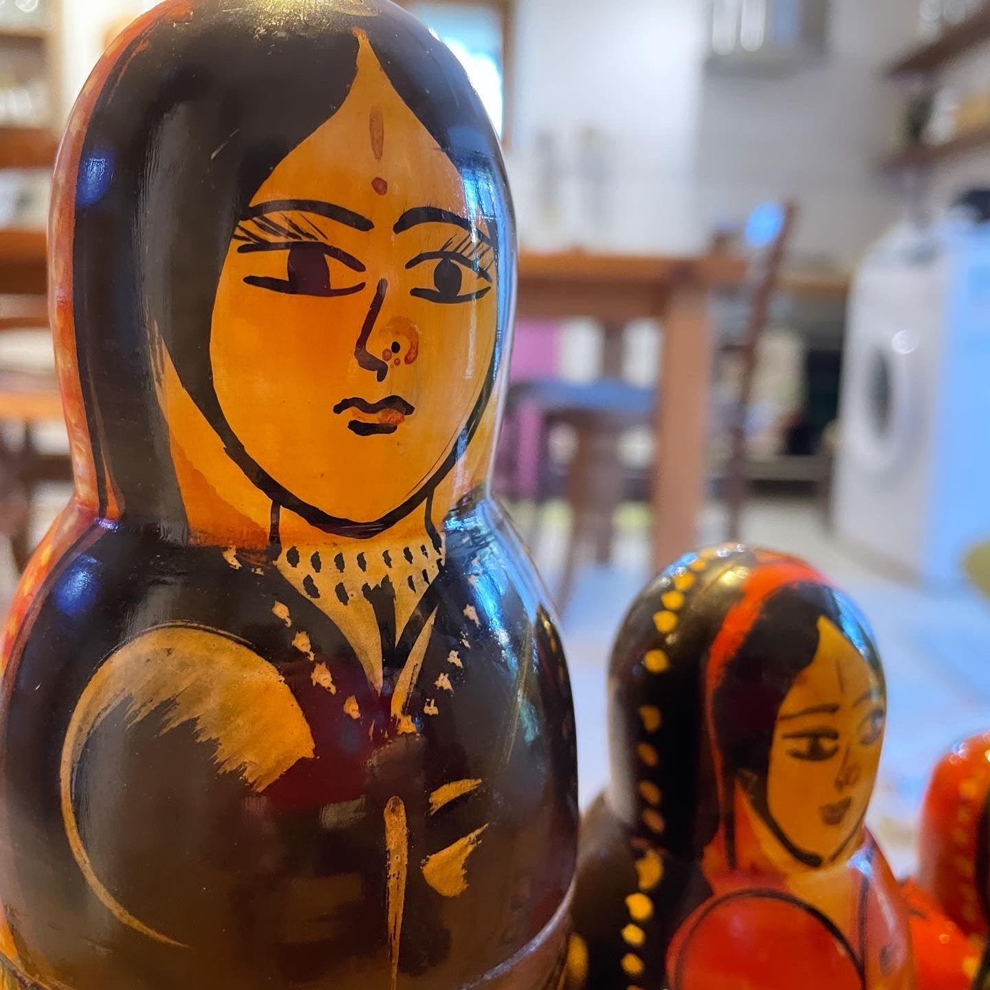 Sapete quanto amiamo le #matrioske ; purché siano particolari e da #collezione come queste… n.7 pezzi, legno, molto #rare in quanto rappresentano donne indiane nel tradizionale abbigliamento. L’altezza della più grande è cm 22.