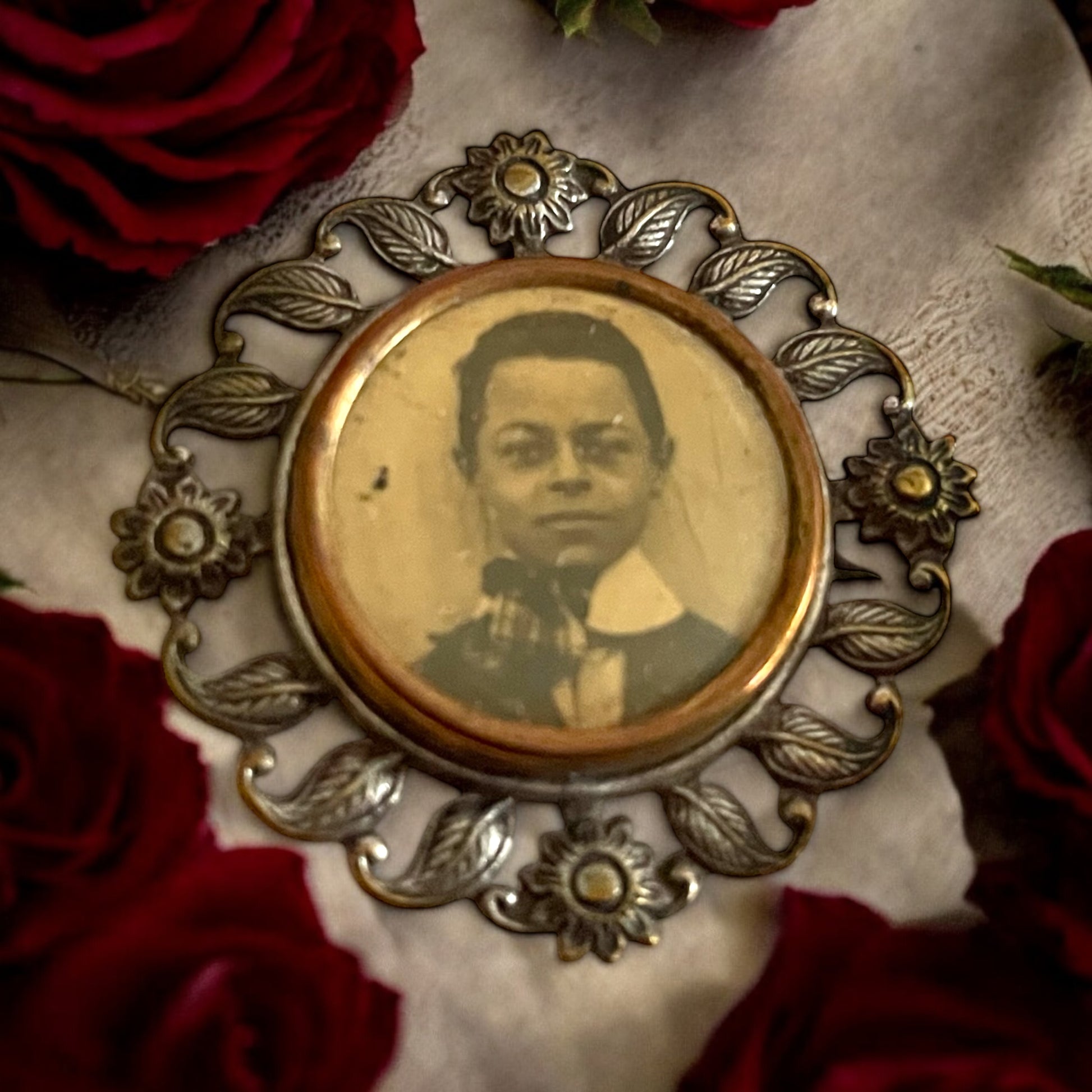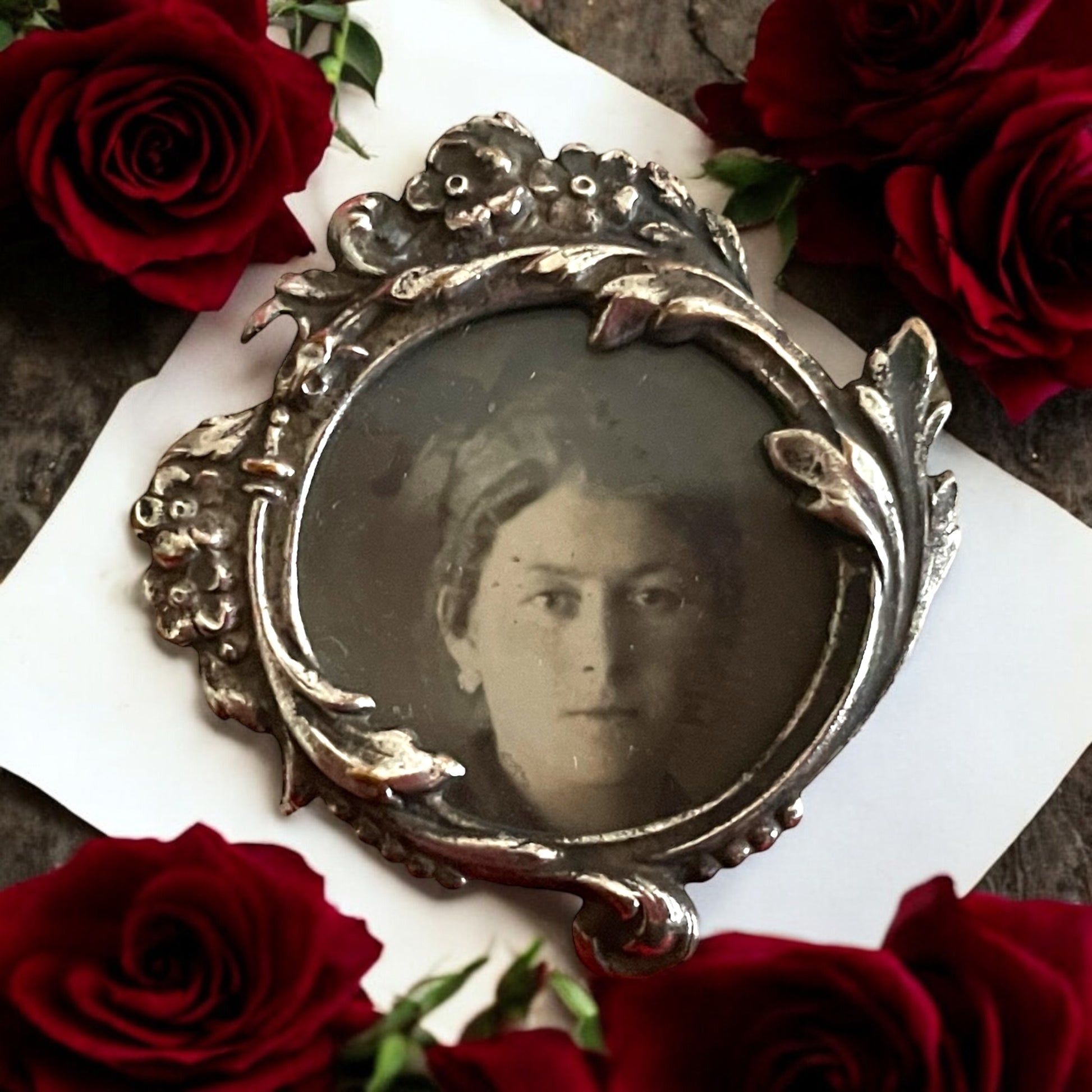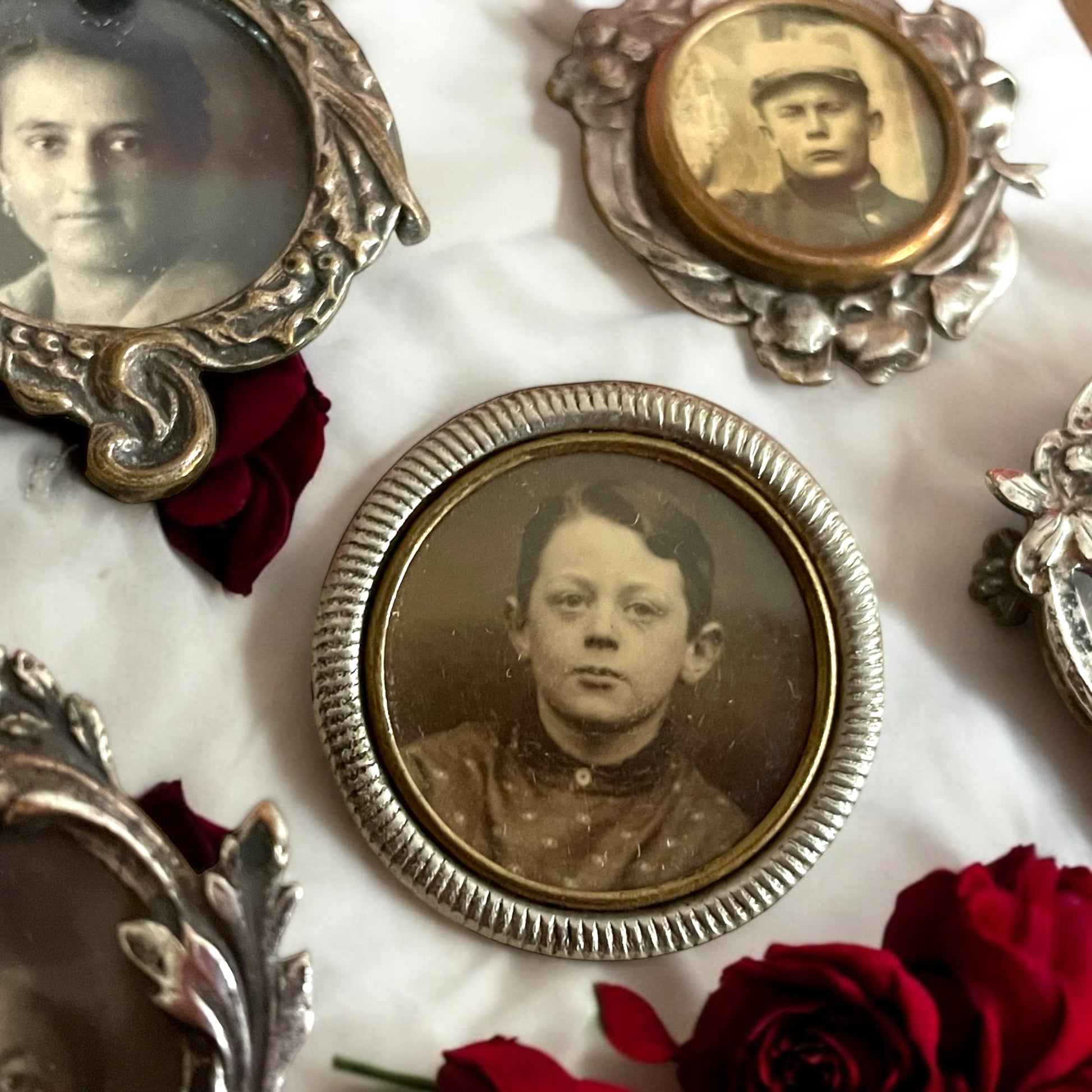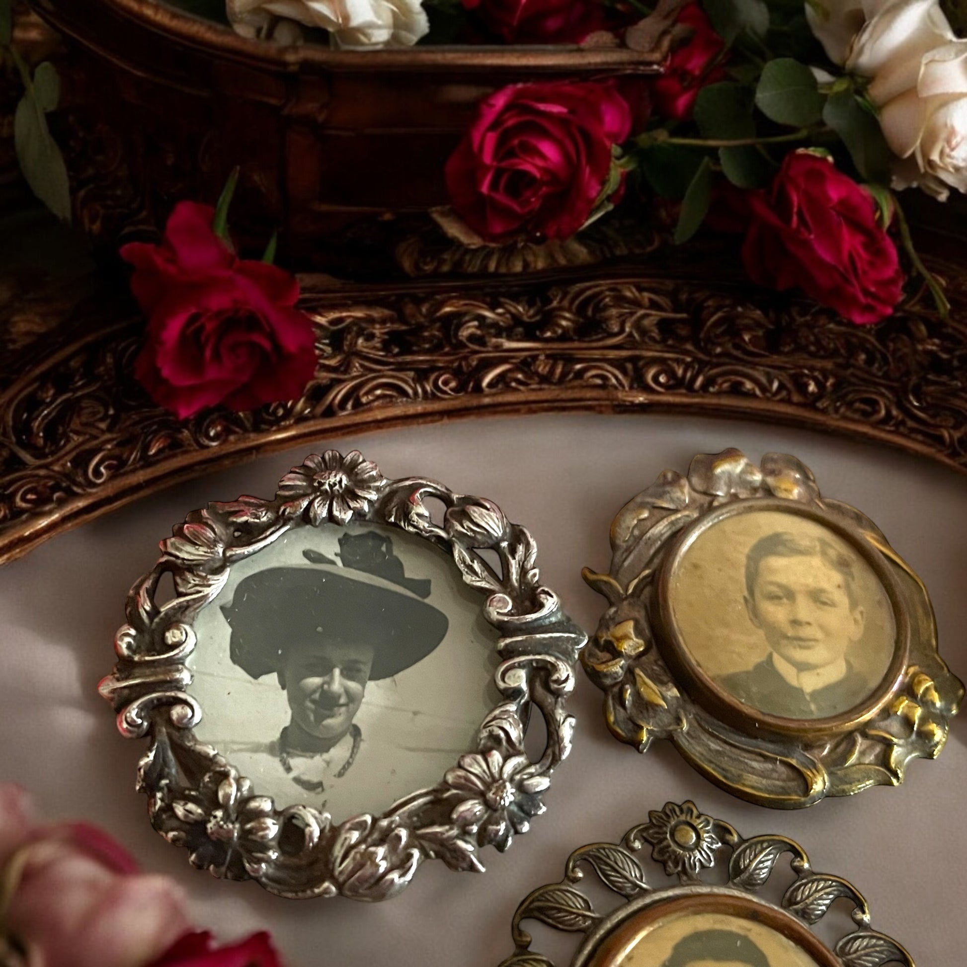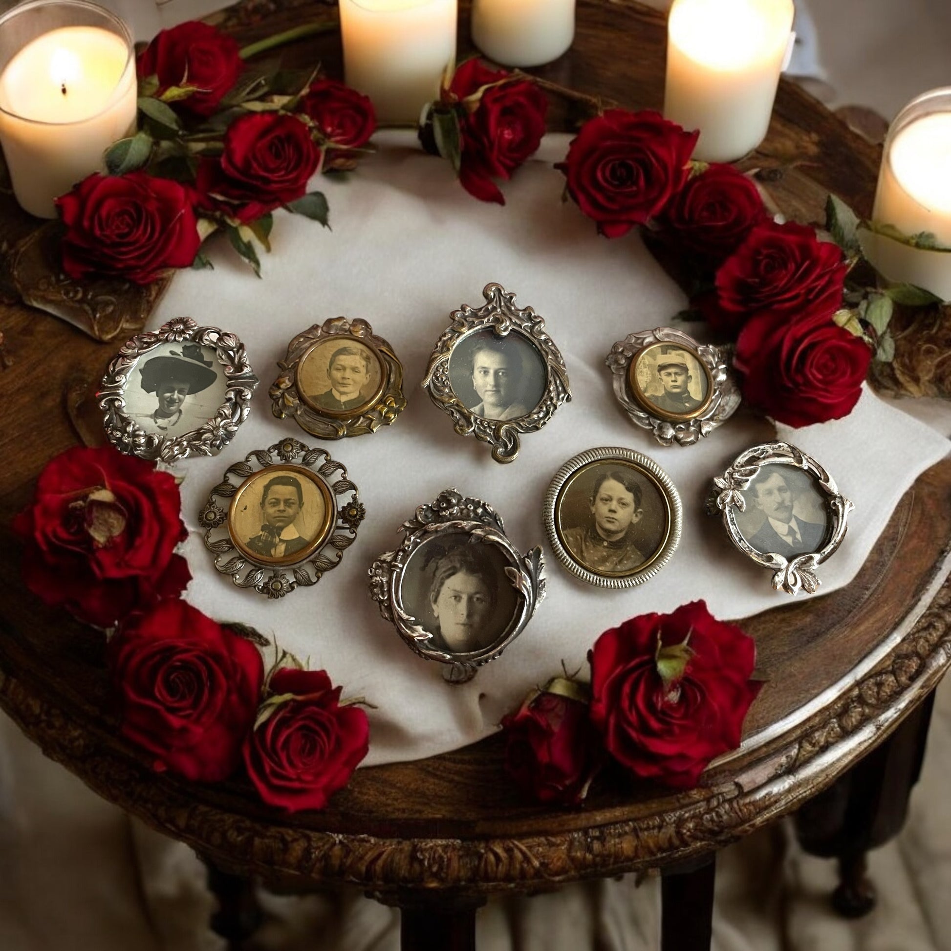 Su un antico tavolino di legno scuro, circondato da rose rosse e candele tremolanti, riposano otto spille che sembrano raccontare un’intera epoca di memorie e volti dimenticati. Ogni cornice racchiude un frammento di vita, uno sguardo rubato al tempo, un’eco lontana che si fa presente. Alcune di queste spille, con le loro cornici in ottone dorato e i volti impressi su ferrotipia, ci riportano al cuore dell’Ottocento, tra il 1860 e il 1890, quando la fotografia era ancora una magia fragile e preziosa. I dettagli minuti, le incisioni delicate e i profili solenni narrano di un’epoca in cui il lutto si esprimeva attraverso oggetti tangibili, da stringere al petto o da conservare come piccoli altari domestici. Altre spille, dalle forme più sinuose e dalle cornici cesellate, richiamano l’eleganza dell’Art Nouveau, con motivi floreali che sembrano quasi intrecciarsi alle rose che le circondano. Questi pezzi, databili tra il 1890 e il 1910, celebrano la bellezza effimera della vita attraverso l’arte della decorazione. Infine alcune cornici, più sobrie e lineari, ci accompagnano verso gli anni ’20 del Novecento, segnando il passaggio a un gusto più essenziale, in cui il ricordo diventa meno appariscente ma altrettanto intenso. Queste spille, insieme, compongono un piccolo museo dell’affetto e del ricordo, testimoni silenziose di storie che meritano ancora di essere raccontate.