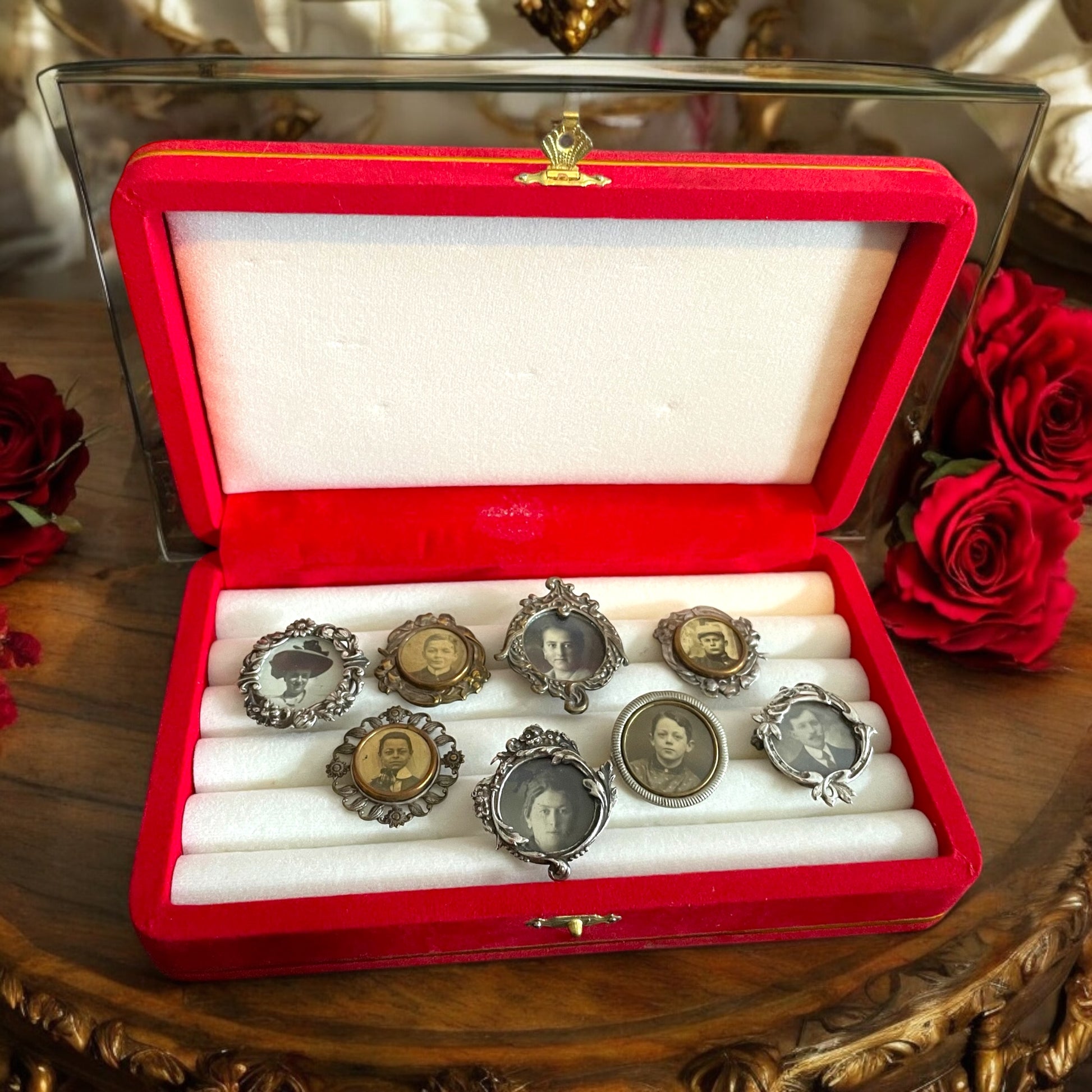 N. 8 antiche spille 1860-1920 ad memoriam con foto e scrigno