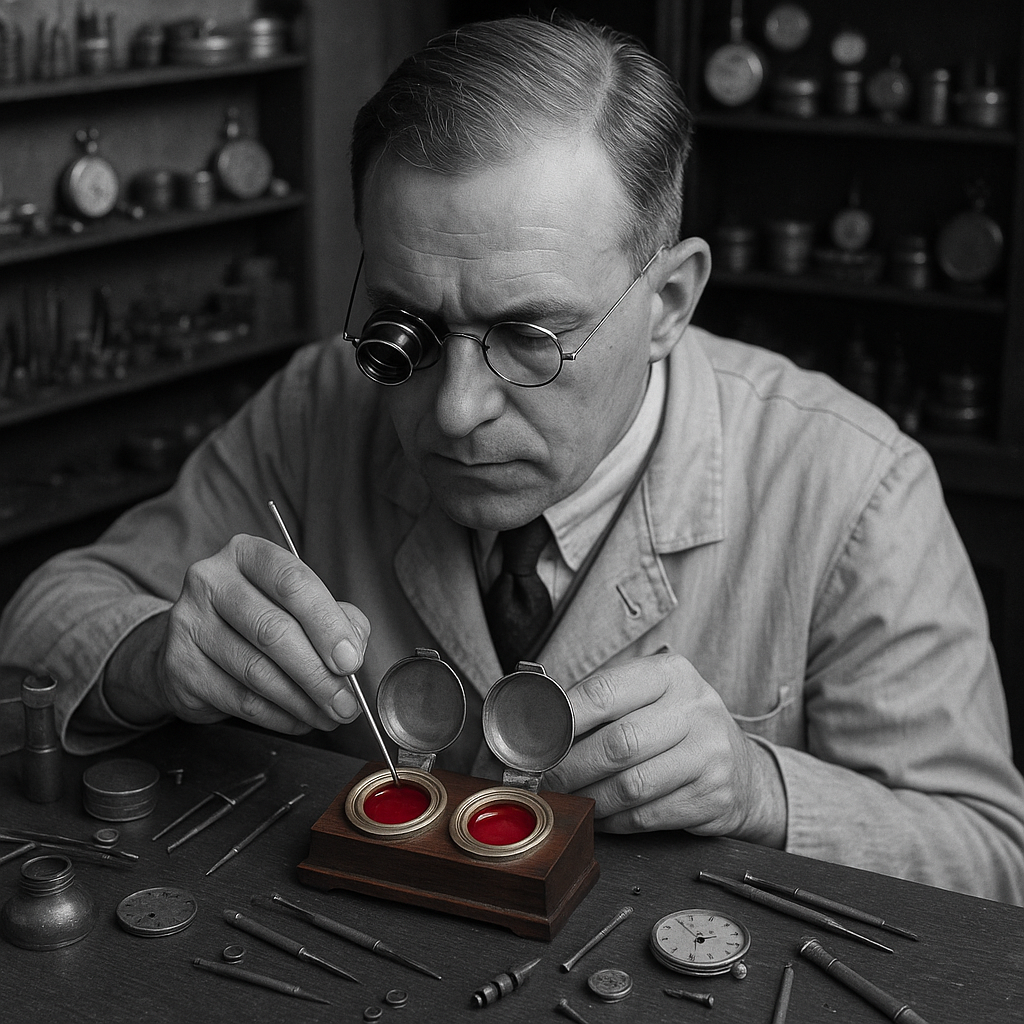 In un’epoca in cui ogni vite, ogni ingranaggio veniva assemblato a mano, la lubrificazione era un gesto di precisione assoluta. Questo piccolo oggetto ne è una testimonianza concreta: un porta olio da banco, utilizzato per contenere due diverse tipologie di olio, necessarie alla manutenzione dei meccanismi orologieri. I coperchi in metallo nichelato, ancora perfettamente funzionanti, proteggono due cavità con inserti in resina rossa coeva. I simboli incisi – diversi per ciascun vano – servivano a distinguere gli oli, garantendo l’uso corretto durante le operazioni più delicate. La base, in legno scuro tornito, porta i segni dell’uso e del tempo, confermando l’autenticità di un oggetto d’officina sopravvissuto per regalarci sorpresa e bellezza. Un piccolo strumento raro, nato per servire mani esperte. Oggi è perfetto per collezionisti, restauratori o semplicemente per chi sa riconoscere il valore della precisione d’altri tempi.