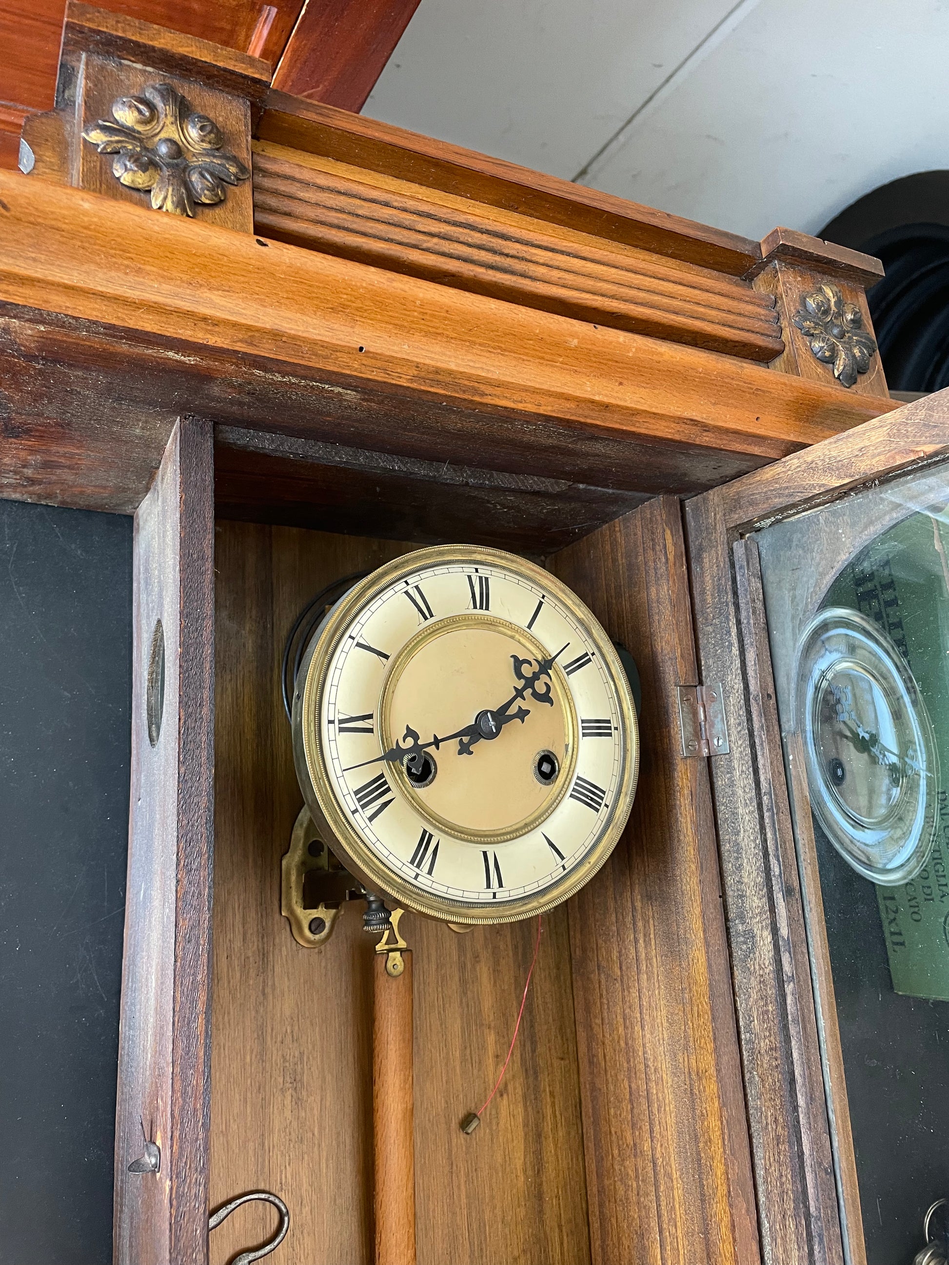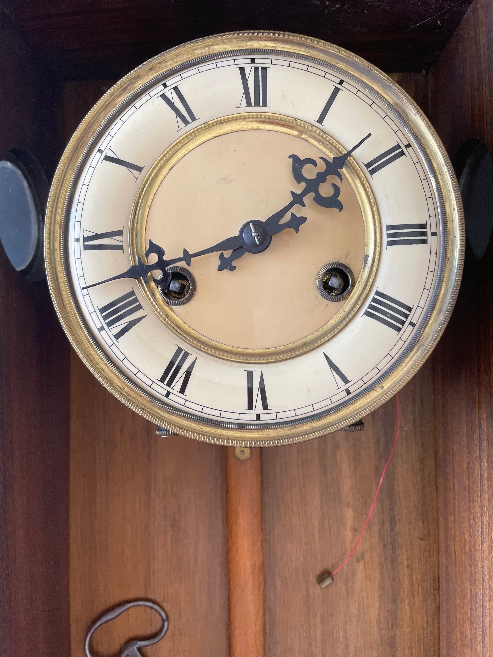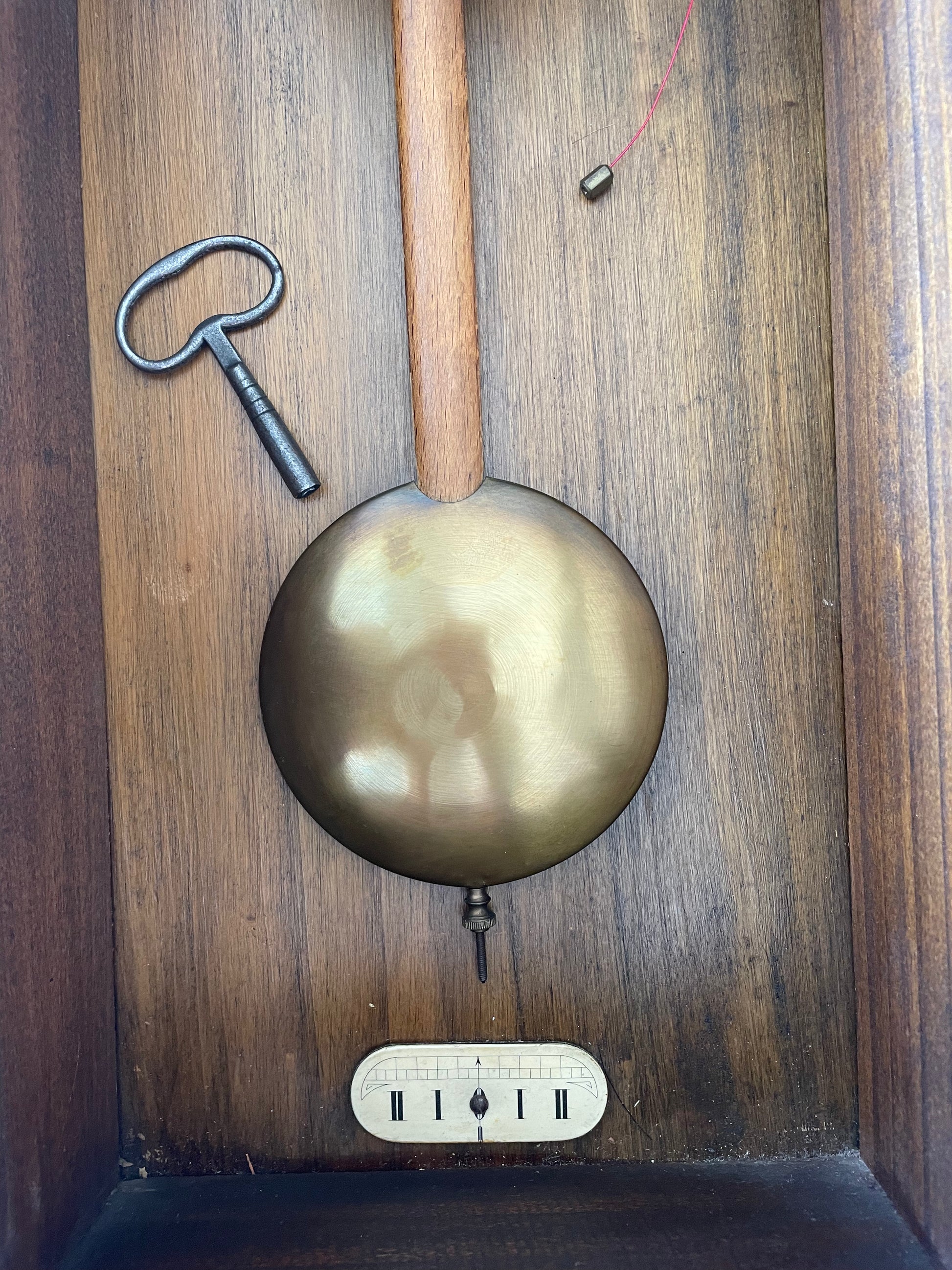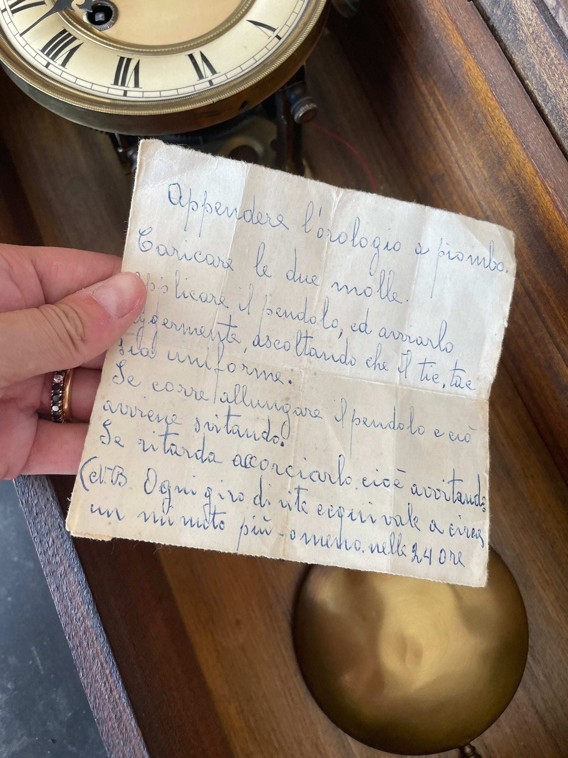antico #orologioapendolo funzionante, con chiave, ritirato con ancora il vecchio biglietto che la signora amorevolmente teneva nella teca per ricordarsi come regolarlo.