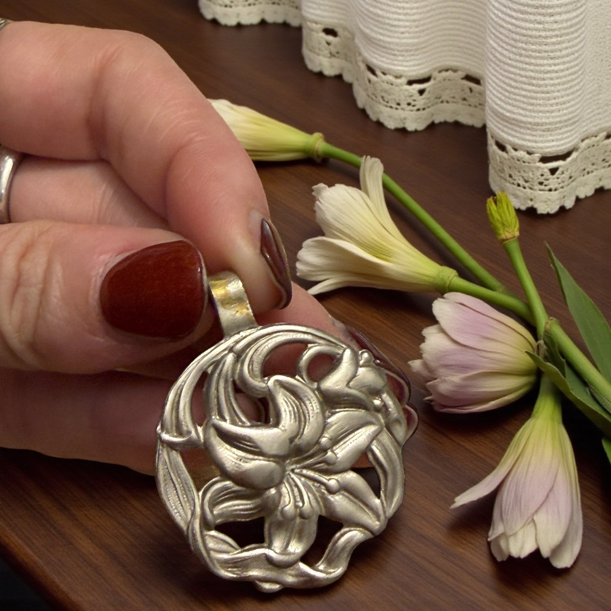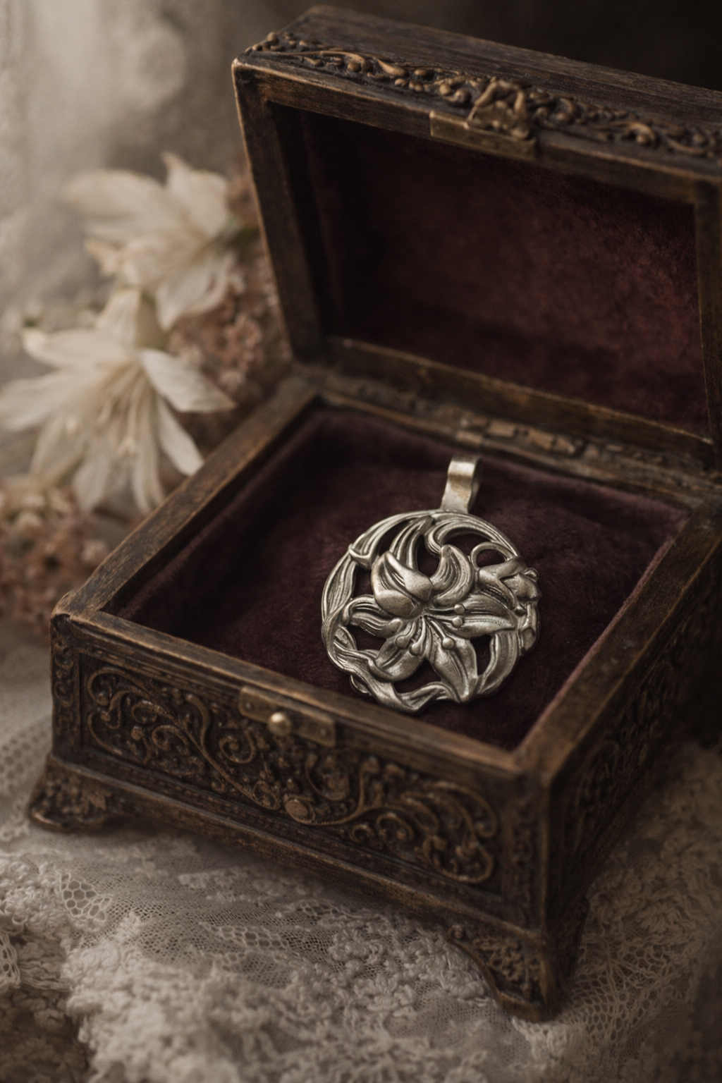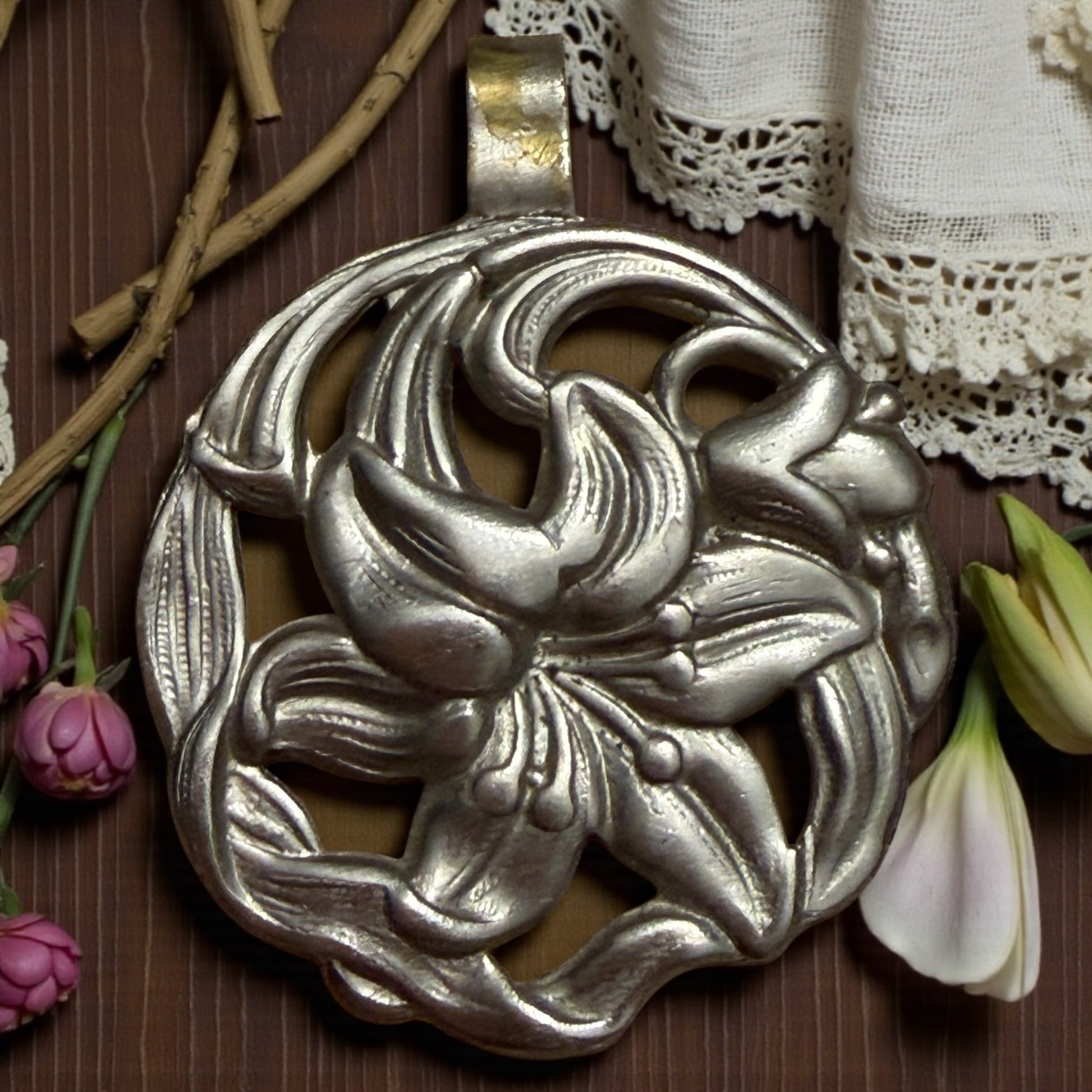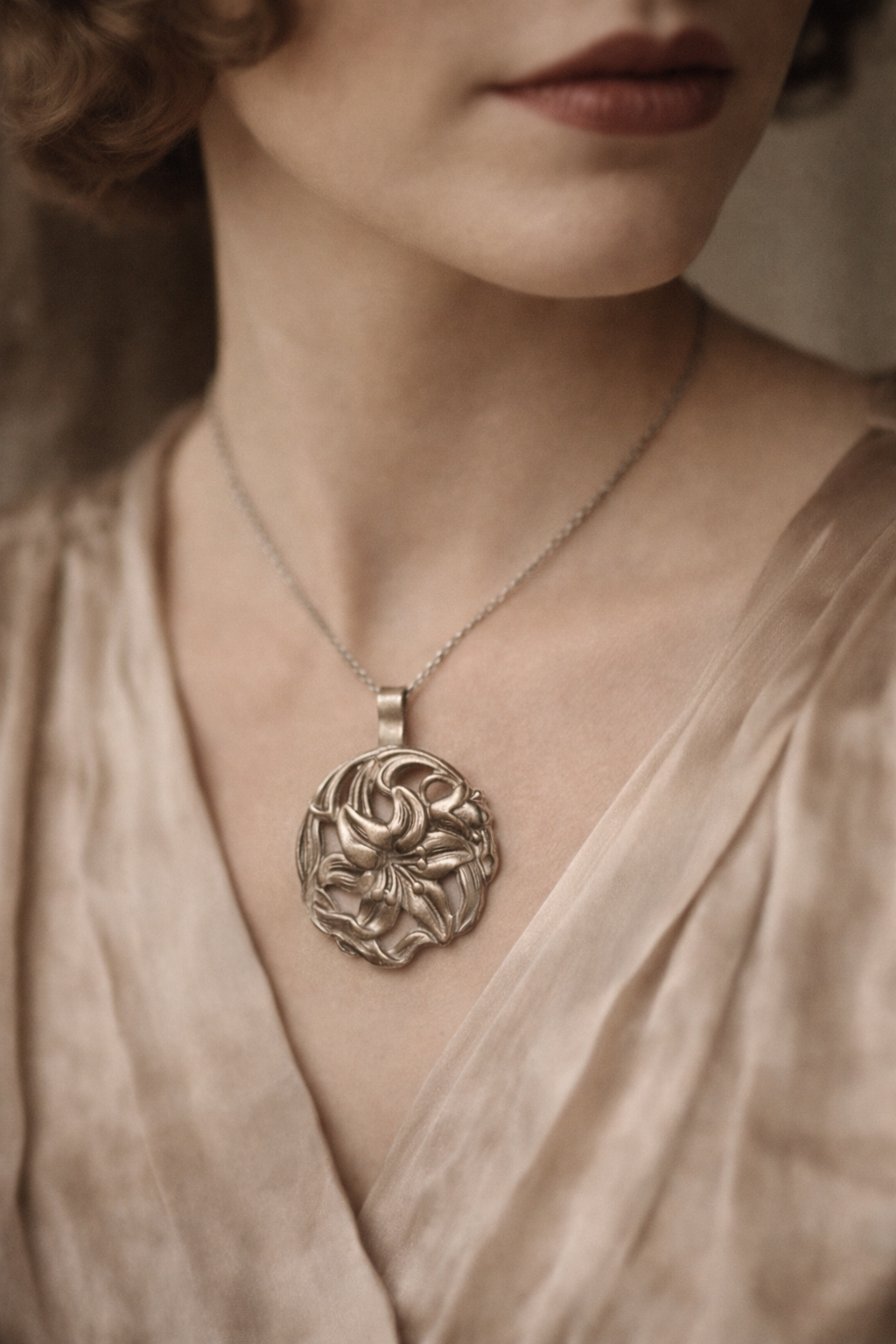 Questo pendente degli anni ’30 custodisce un iris stilizzato, modellato in metallo argentato con linee sinuose che si rincorrono in un movimento continuo. Tre petali si sollevano, tre si piegano dolcemente verso l’esterno. Non è una forma statica: sembra quasi ondeggiare, come mosso da un soffio leggero. L’iris, nel linguaggio simbolico, è il fiore del passaggio e del ponte tra mondi. Deriva dalla figura mitologica di Iris, messaggera tra cielo e terra. Negli anni ’30 il gusto Liberty sopravvive come eco elegante: meno eccessivo rispetto ai primi del Novecento, più sobrio, più raffinato. Potremmo interpretarlo anche come giglio, ricordiamo che le rappresentazioni botaniche liberty erano molto libere e mai prettamente fedeli: un fiore che parla di dignità, purezza interiore, rinascita. Non “innocenza”. Piuttosto: forza gentile. Questo pendente ne è un esempio perfetto. Realizzato in lega metallica argentata presenta leggere tracce del tempo sul gancio, dove affiora il metallo sottostante — segno autentico della sua età. Indossato, ha una presenza equilibrata: visibile ma non invadente. Un gioiello che non urla. Sussurra.