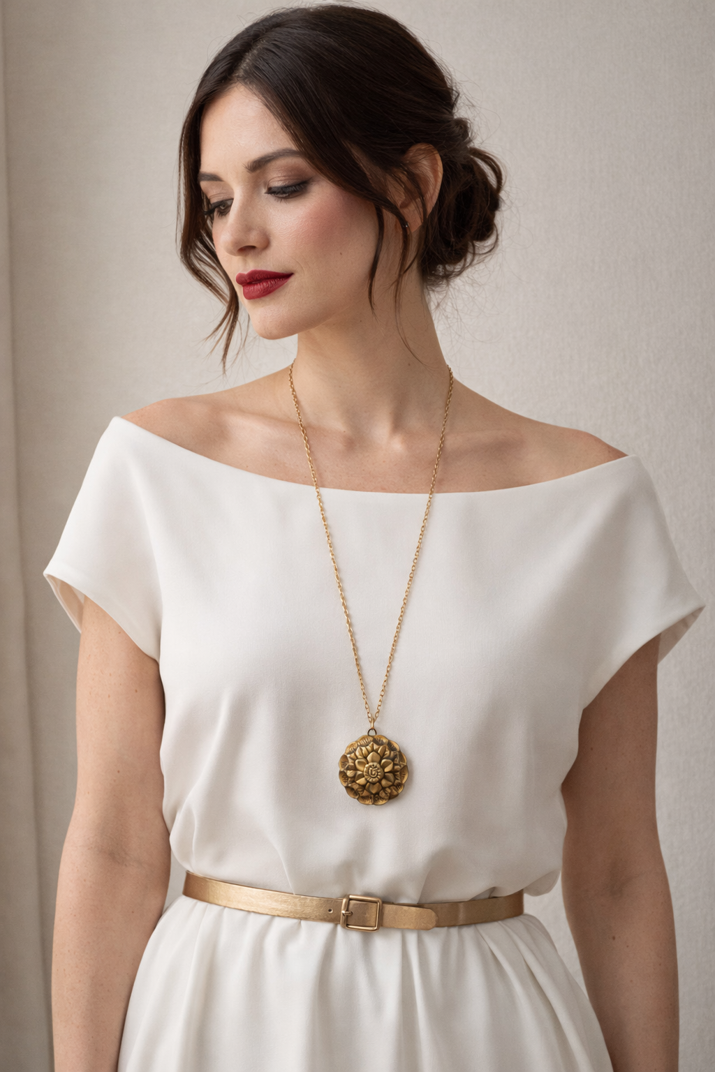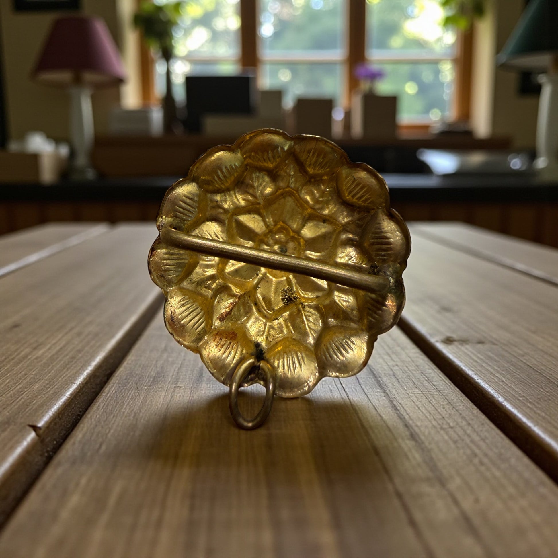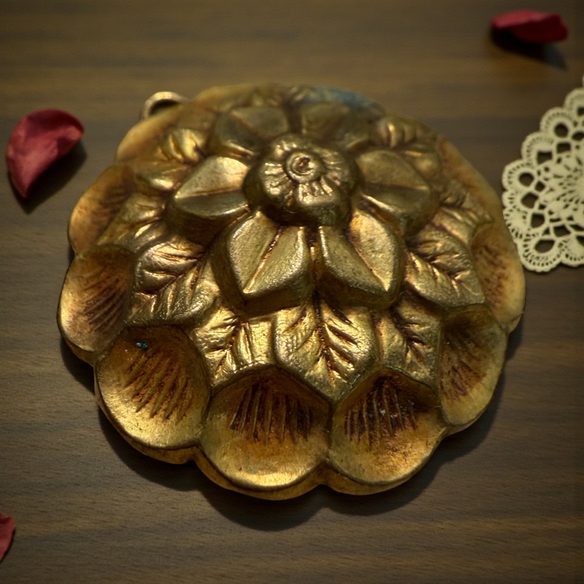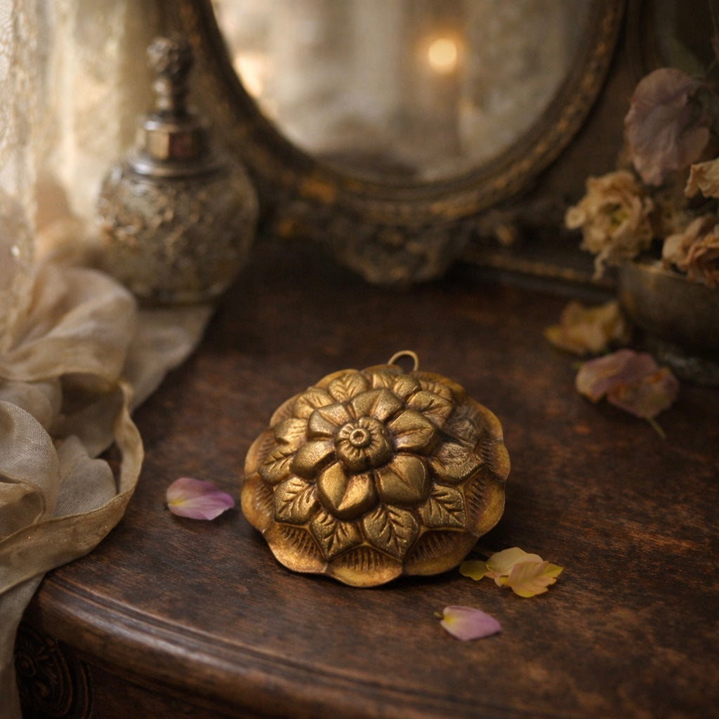 C’è un tipo di eleganza che non nasce per farsi notare, ma per accompagnare i gesti e gli abiti e valorizzarli. Questo pendente floreale sembra fatto proprio per questo: restare vicino al corpo, seguire il movimento del tessuto, riflettere la luce con discrezione - fare da fulcro, da centro di equilibrio dell’outfit. Il fiore in rilievo, pieno e armonico, appartiene al gusto decorativo di fine Ottocento, quando anche gli elementi non nobili come metallo venivano curati con attenzione e pensati per durare nel tempo. Il metallo, un caldo princisbecco dorato, conserva oggi una patina vissuta, sincera, che racconta il passaggio degli anni senza bisogno di parole. Sul retro, una barra orizzontale rivela la sua funzione più interessante: non un semplice pendente, ma un ornamento a doppio uso. Poteva essere infilato in un nastro o in una fettuccia e applicato direttamente all’abito, oppure indossato come pendente grazie all’anellino superiore. Un piccolo oggetto versatile, nato per adattarsi e donare luce. Oggi è pronto a essere reinterpretato con la stessa libertà con cui era nato, col suo doppio uso, personalmente lo vediamo con una bella catena lunga dorata su una palette di colori sabbiosi, tenui.
