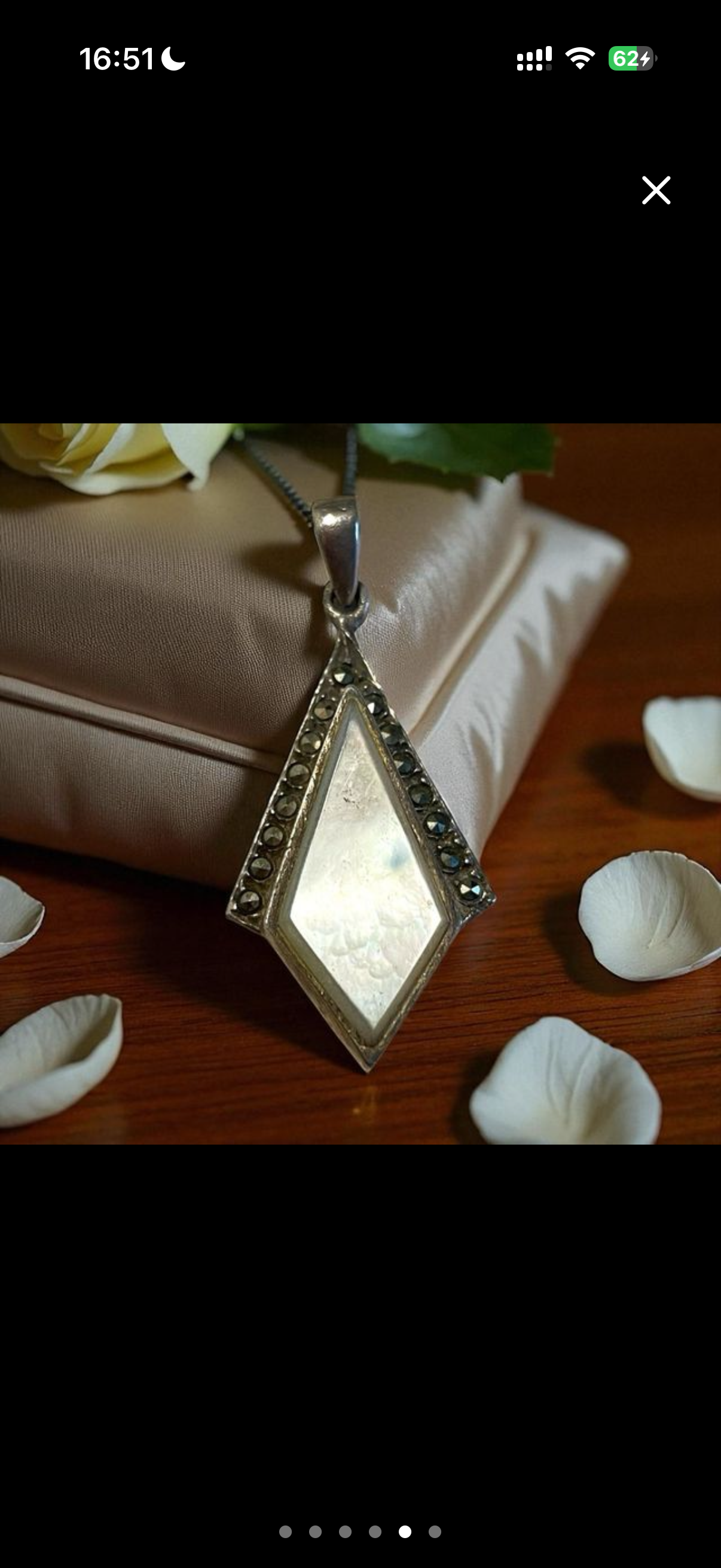 Pendente vintage. Argento 925 (punzonato). Madreperla naturale. Marcasiti. Produzione: seconda metà Novecento. Stile: ispirazione déco. Condizioni: molto buone.