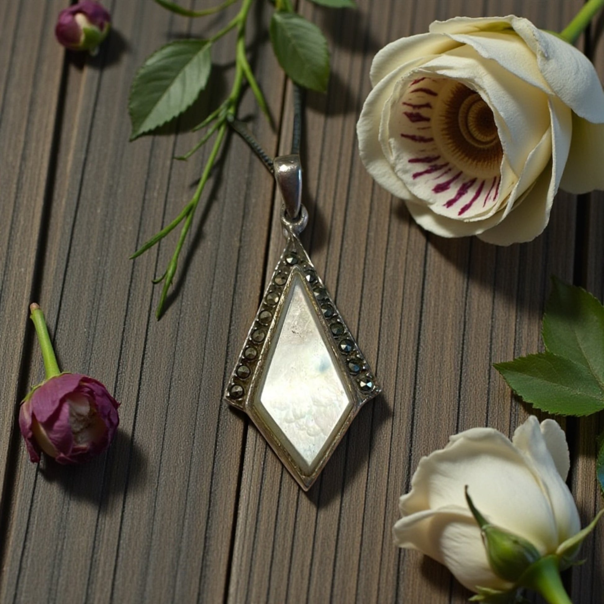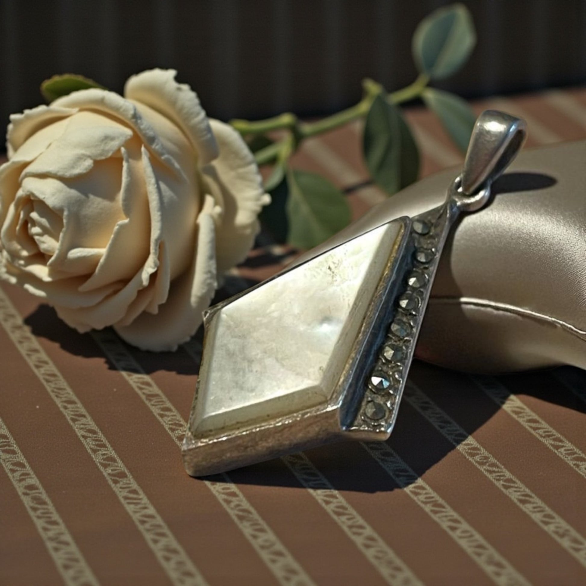 Non è un gioiello che cattura la luce: piuttosto dire che… la governa. Questo pendente in argento 925 con madreperla e marcasiti nasce dall’incontro tra superfici opposte: la madreperla, chiara e silenziosa, diffonde una luminosità morbida; le marcasiti, scure e puntuali, ne tracciano i confini con precisione. La forma geometrica accompagna il movimento del corpo senza imporsi, rendendolo un dettaglio che funziona per equilibrio più che per ornamento. È pensato per chi ama i toni pacati, i tessuti naturali, i contrasti delicati. Si abbina con naturalezza a avorio, panna, grigio perla, rosa cipria, nero opaco, ma anche a una semplice camicia bianca. Non chiede attenzione. Chiede coerenza… più a chi guarda che a chi lo indossa. Lo immagini più come continuità su un abito chiaro o come segno deciso su uno scuro?