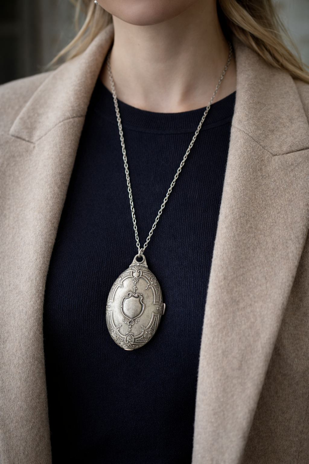 Un tempo riposava alla vita di una donna, oggi può tornare a essere indossato. Questo specchio a scorrimento con vano interno nasce come pendente da chatelaine: un oggetto stupendo, pensato per accompagnare i gesti quotidiani. La decorazione finemente lavorata, con motivi floreali e cartiglio centrale, racconta un gusto elegante e misurato, tipico della fine dell’Ottocento. Aprendolo, si scopre lo specchio originale al mercurio. È importante dirlo con chiarezza: il vetro è integro, liscio, non rotto. Quello che si vede è solo il naturale distacco dell’amalgama sul retro, un segno del tempo che non compromette la superficie né la leggibilità dello specchio. È la stessa velatura morbida che rende questi riflessi così diversi da quelli moderni. Placcato argento, oggi questo pendente può essere indossato con una bella catena lunga, tornando a vivere come oggetto intimo e personale, un gioiello esclusivo. Un piccolo compagno silenzioso, da portare addosso.